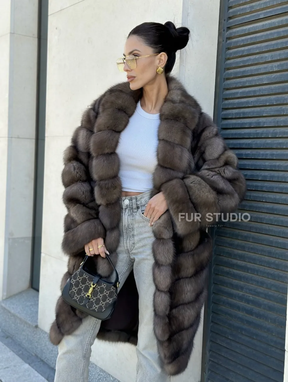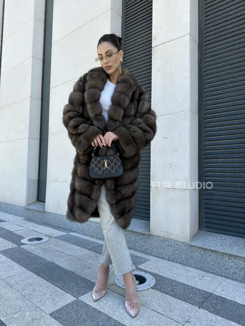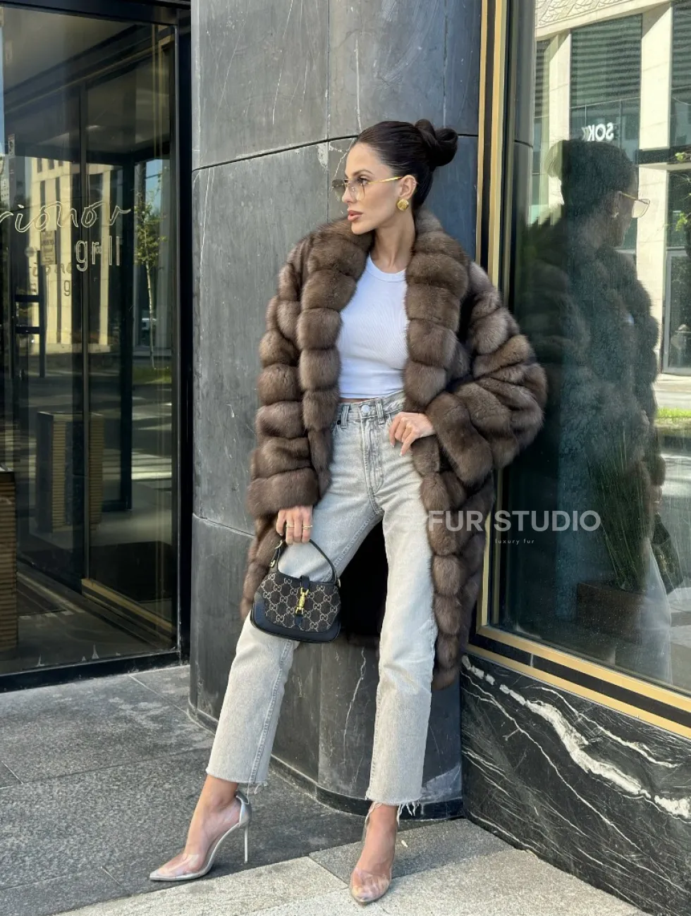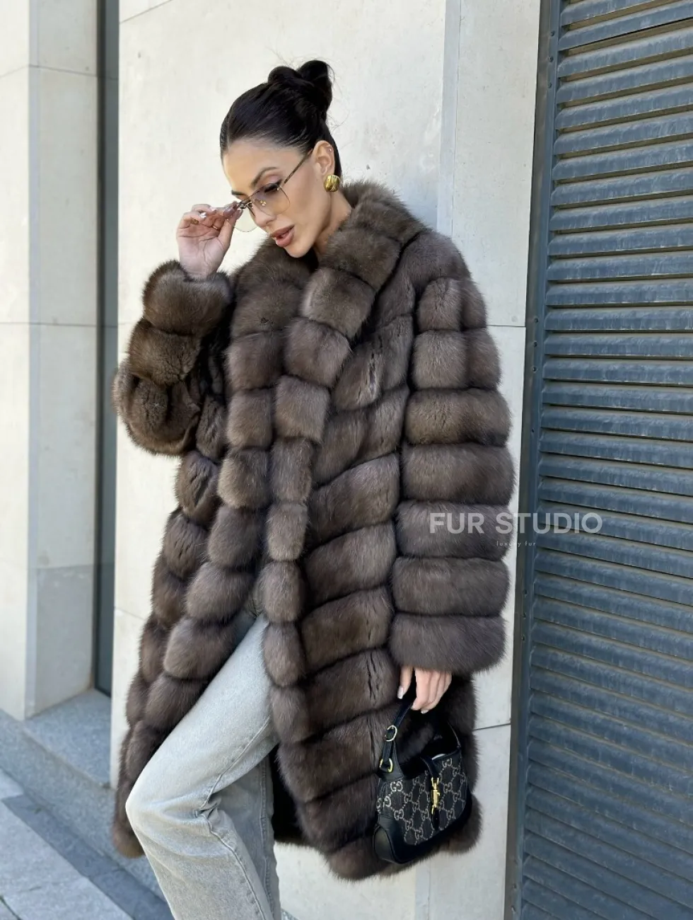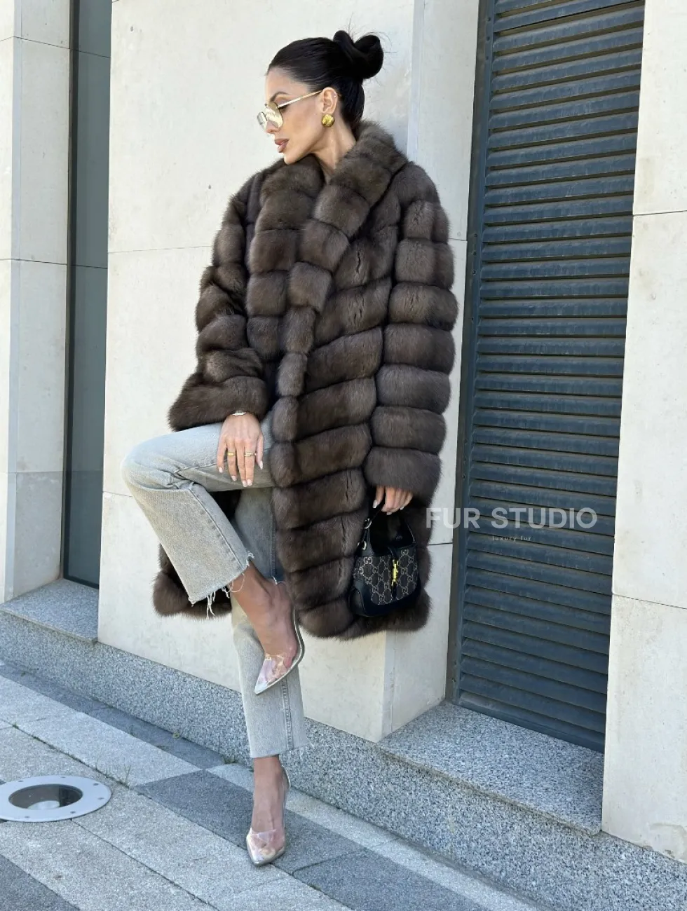 Легкая и стильная шуба из темного меха баргузинского соболя в длине миди — выбор деловых и активных женщин. Эта модель отлично подходит тем, кто ездит за рулем, но также и для любительниц прогуливаться пешком в любую погоду.