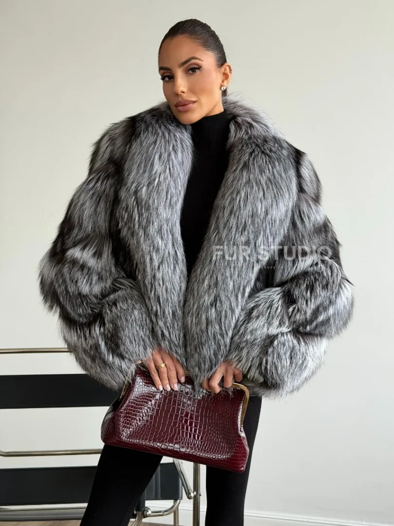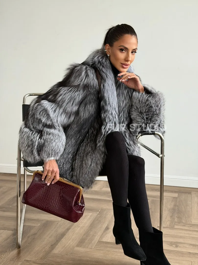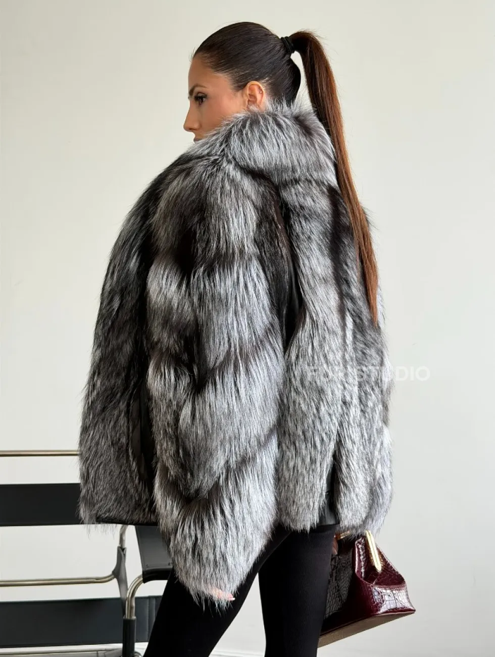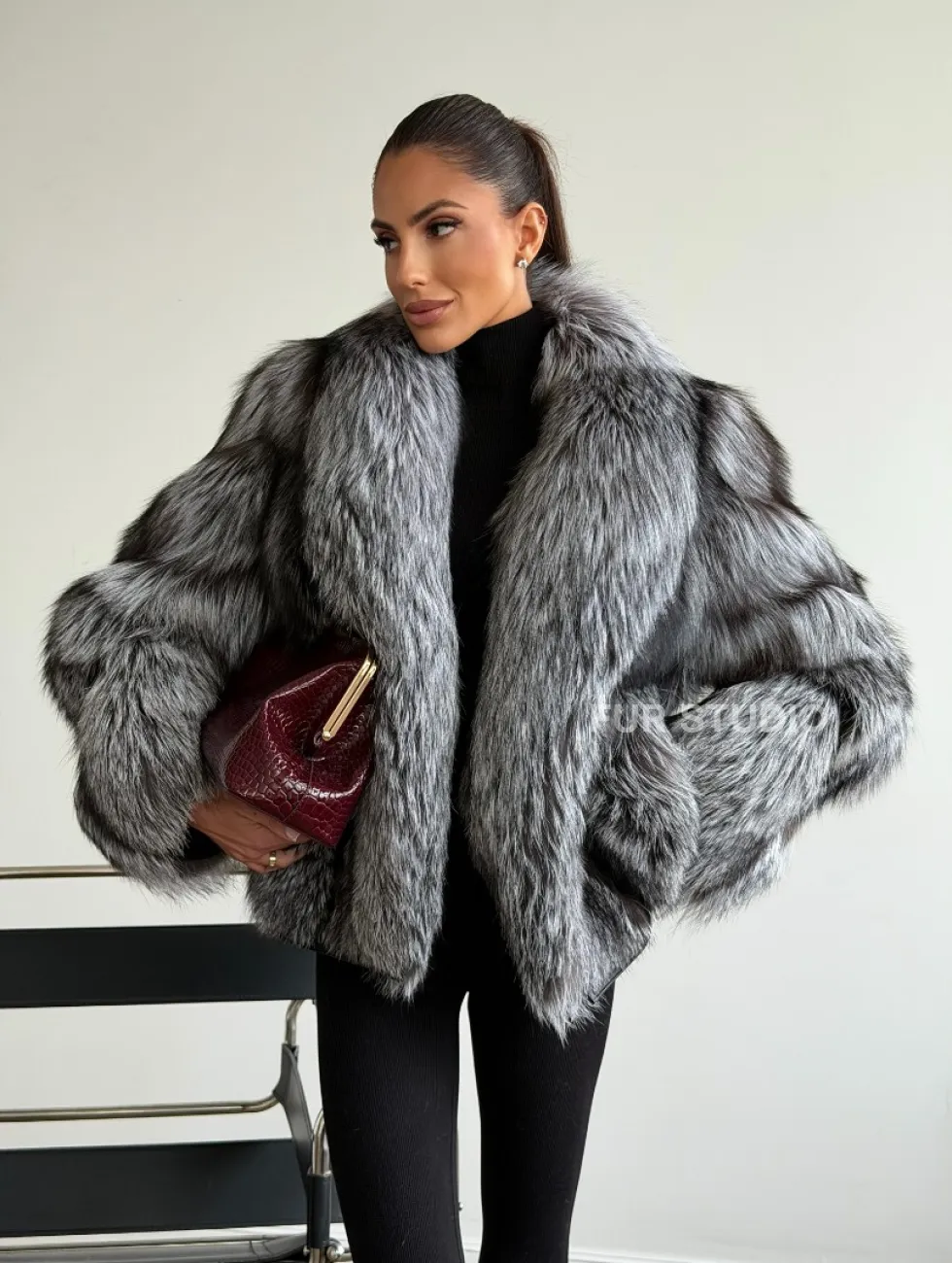Мех данной шубы лиса, цвет серый. Предлагается в размерах от 42 до 48. Длина модели 55-60 см, что выгодно подчеркивает фигуру девушек. Эта модель идеально подойдет для девушек и женщин, предпочитающих роскошные натуральные меха.