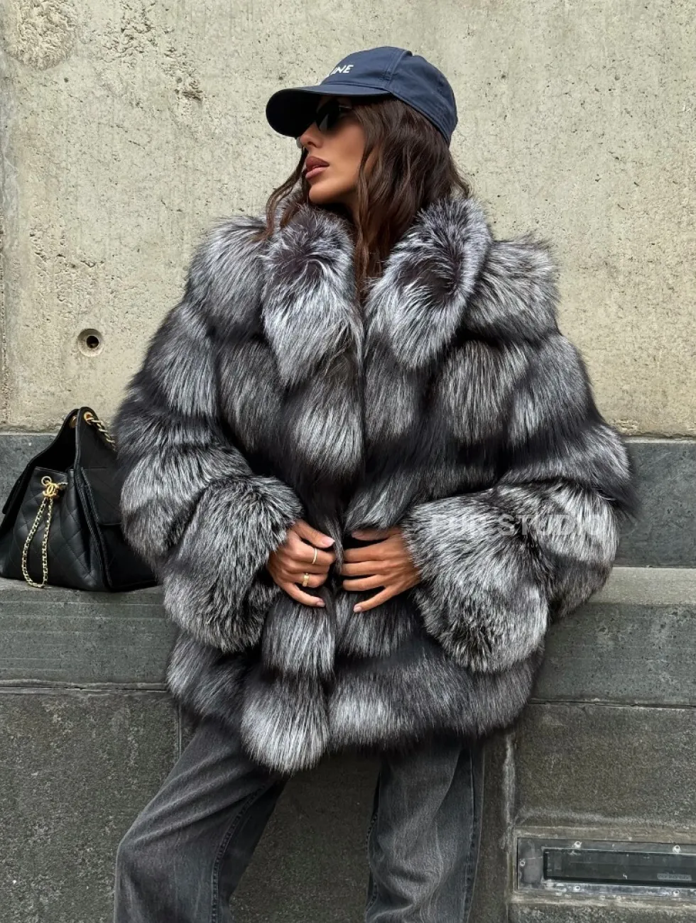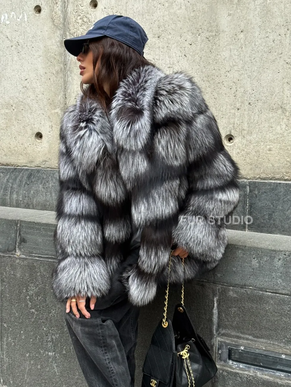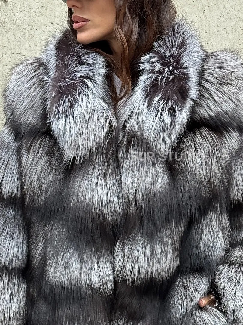 Мех данной шубы лиса, цвет серый. Предлагается в размерах от 42 до 50. Длина модели 65-70 см, что выгодно подчеркивает фигуру девушек. Эта модель идеально подойдет для девушек и женщин, предпочитающих роскошные натуральные меха.