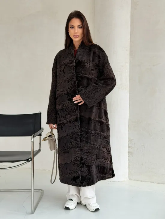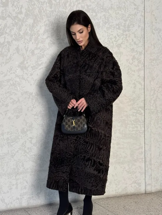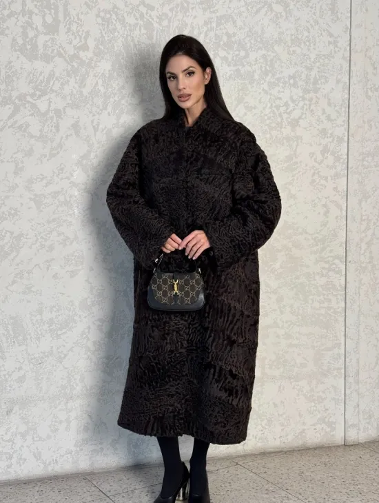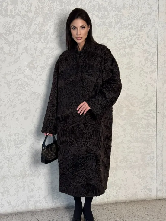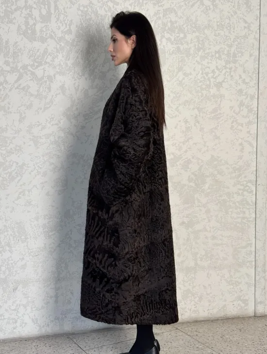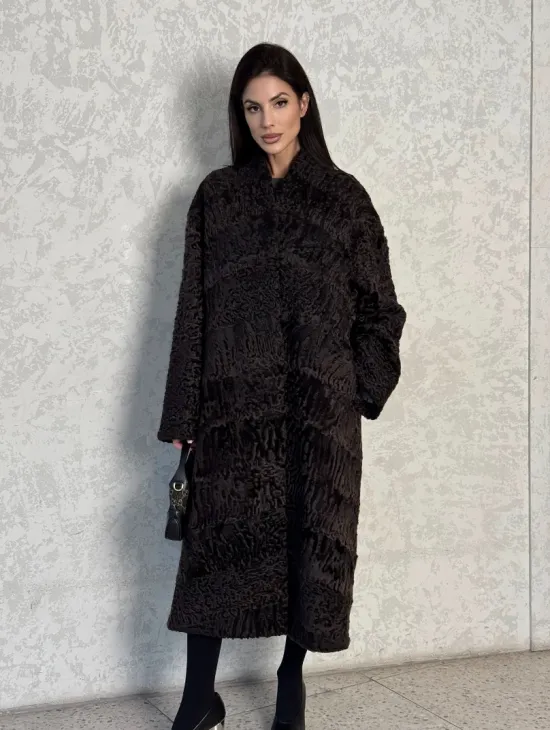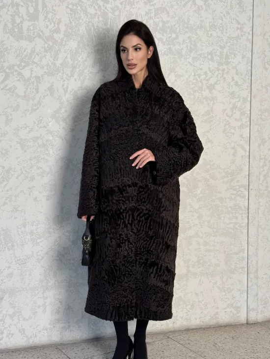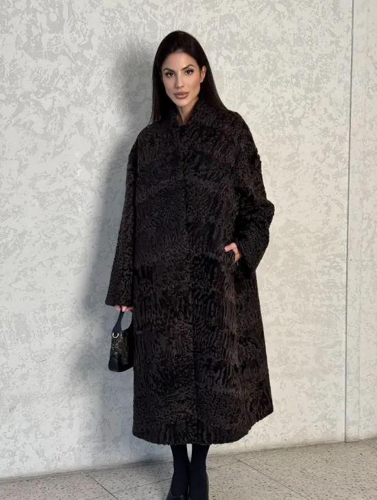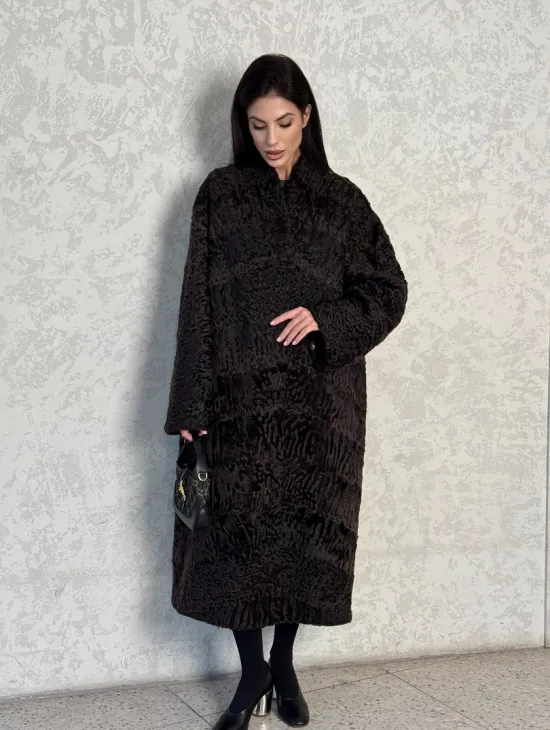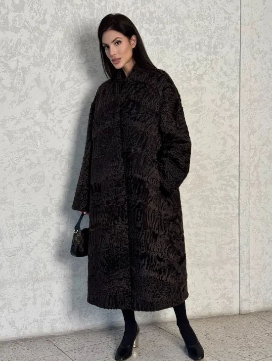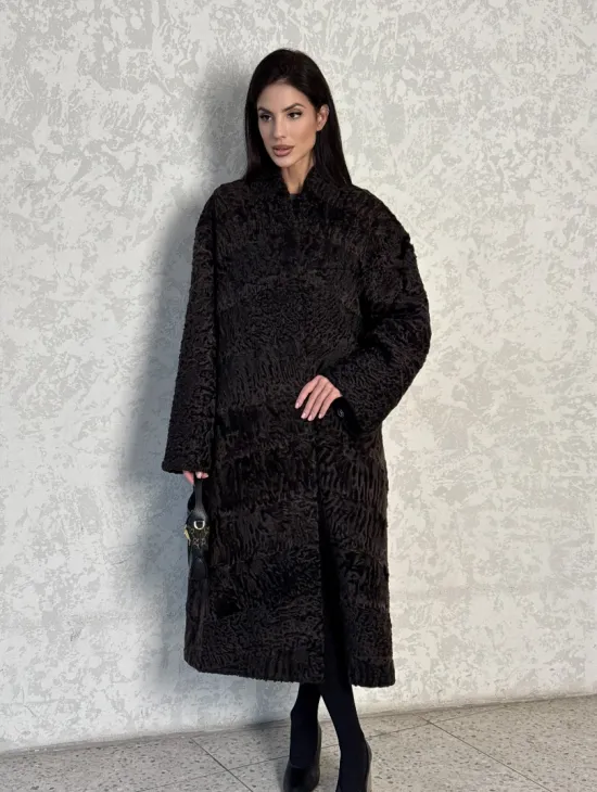Мех данной шубы каракульча, цвет коричневый. Предлагается в размерах от 46 до 62 (пошив по индивидуальным параметрам). Длина модели 95-100 см, что выгодно подчеркивает фигуру девушек. Эта модель идеально подойдет для девушек и женщин, предпочитающих роскошные натуральные меха.