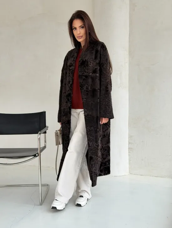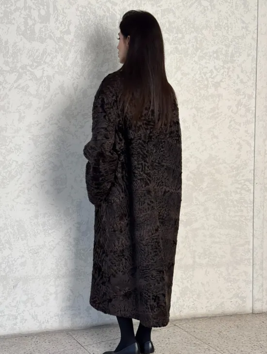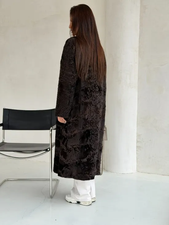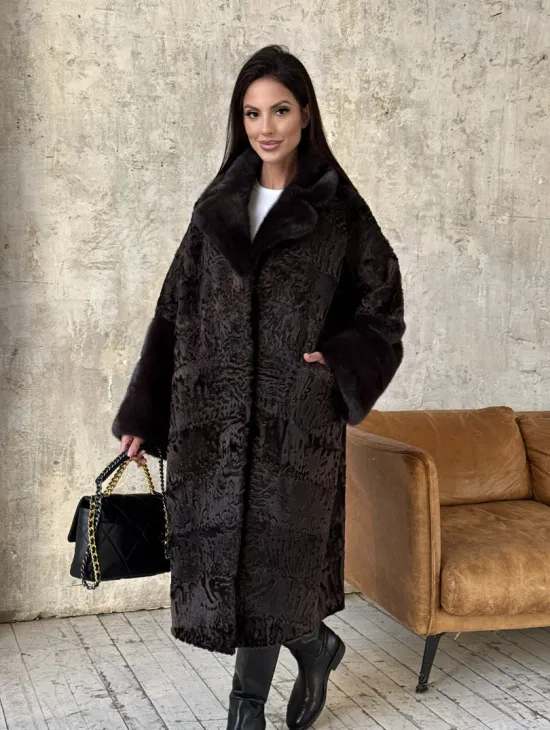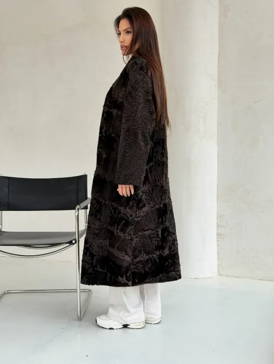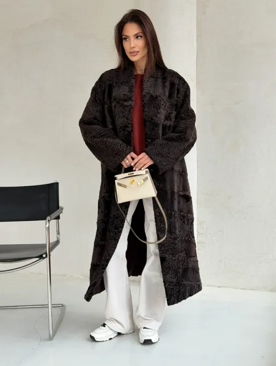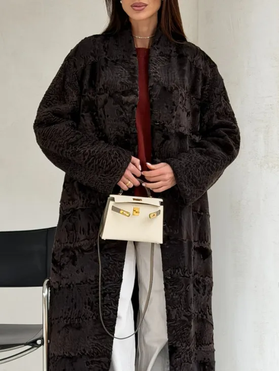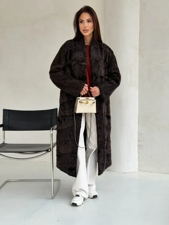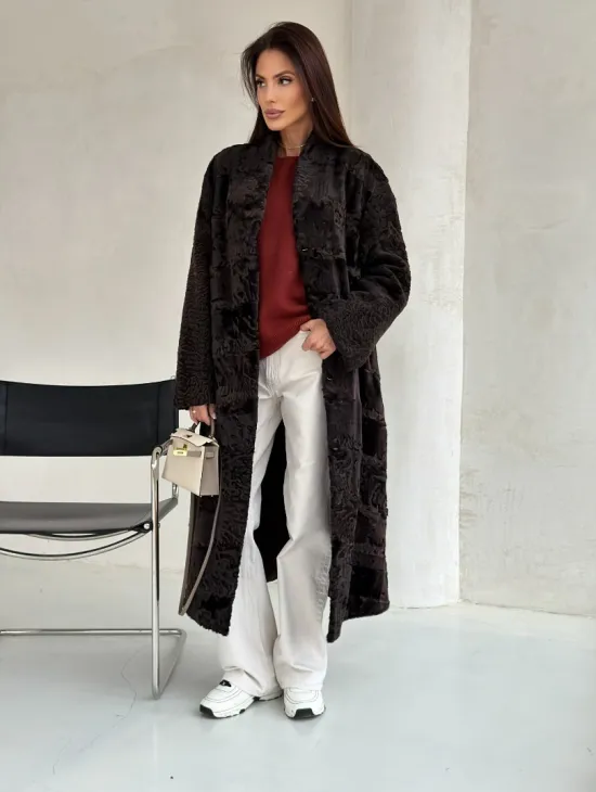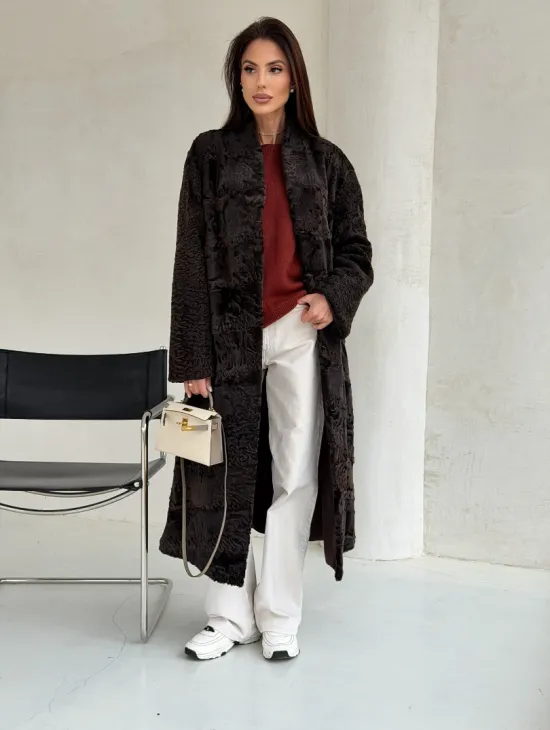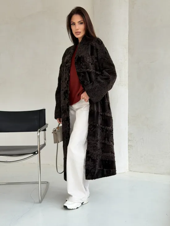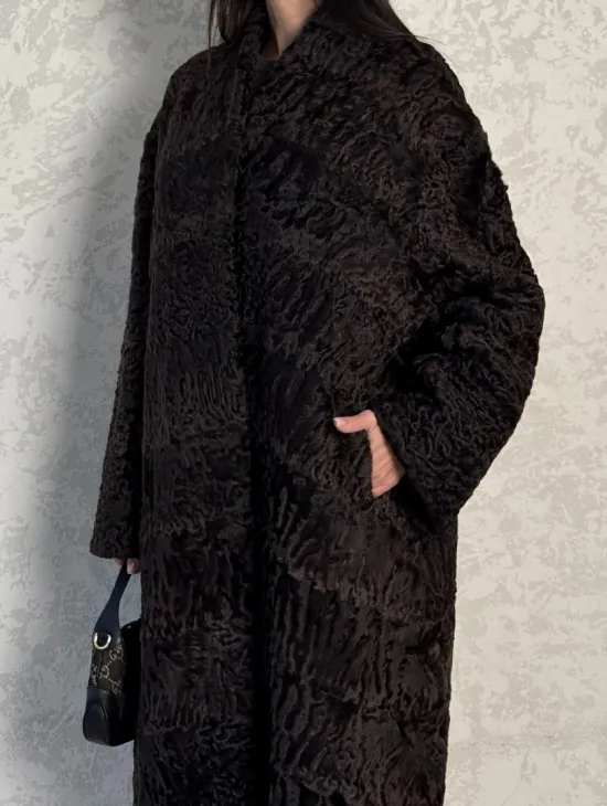 Мех данной шубы каракульча, цвет коричневый. Предлагается в размерах от 46 до 62 (пошив по индивидуальным параметрам). Длина модели 95-100 см, что выгодно подчеркивает фигуру девушек. Эта модель идеально подойдет для девушек и женщин, предпочитающих роскошные натуральные меха.