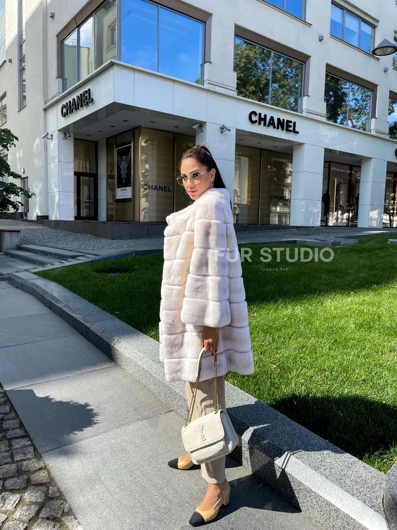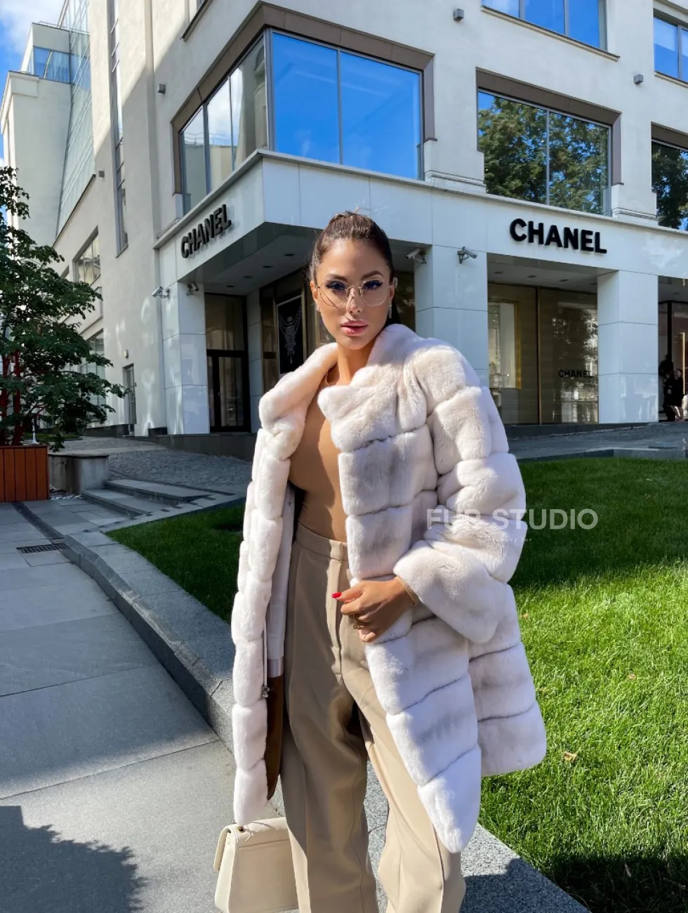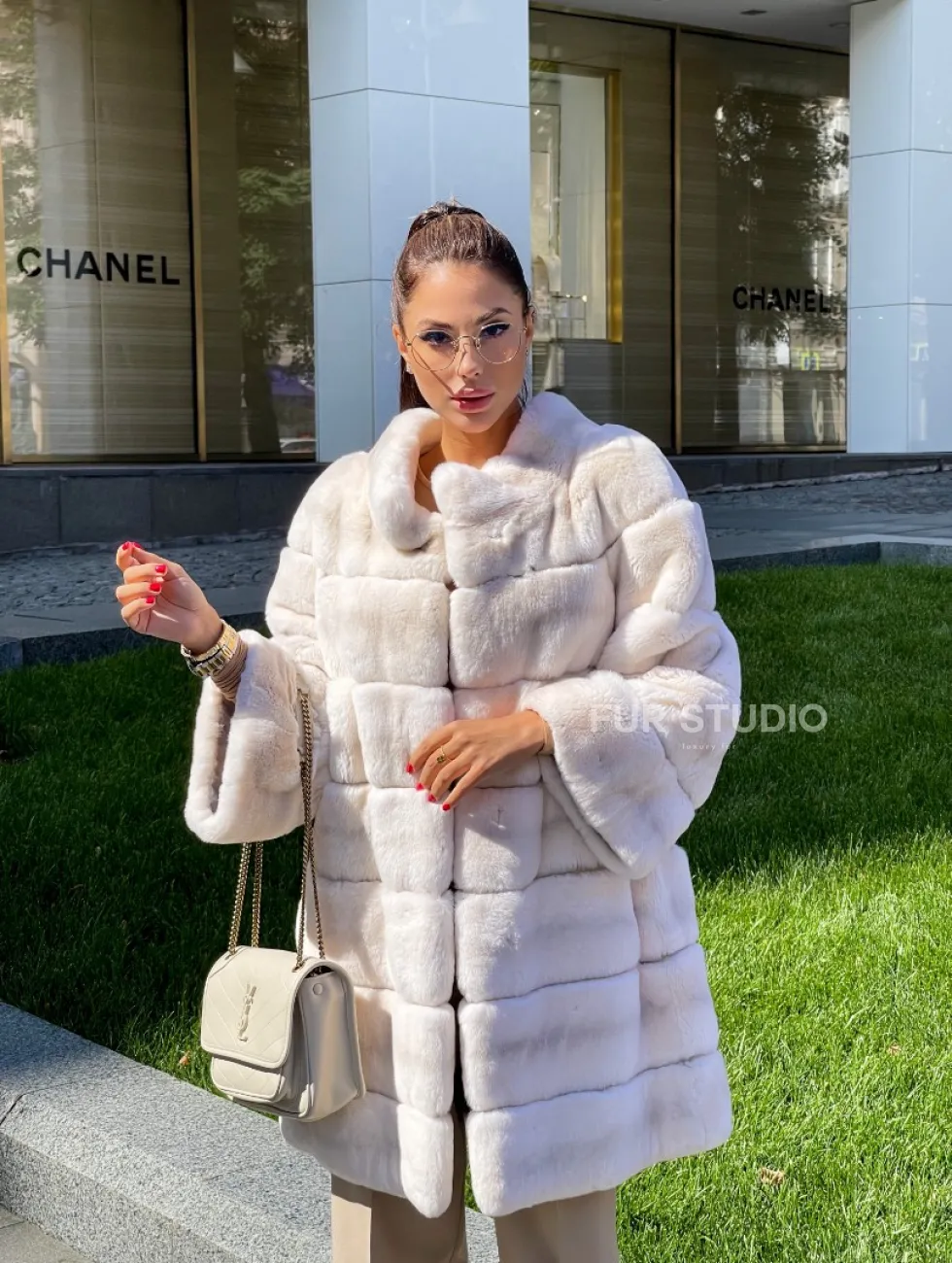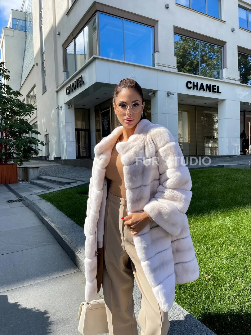 Мех данной шубы кролик рекс , цвет белый. Предлагается в размерах от 42 до . Длина модели 80-85 см, что выгодно подчеркивает фигуру девушек. Эта модель идеально подойдет для девушек и женщин, предпочитающих роскошные натуральные меха.