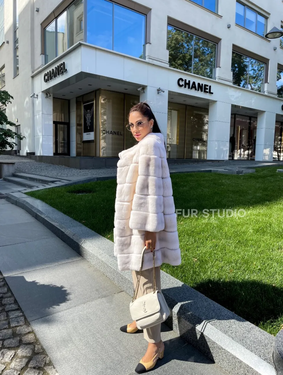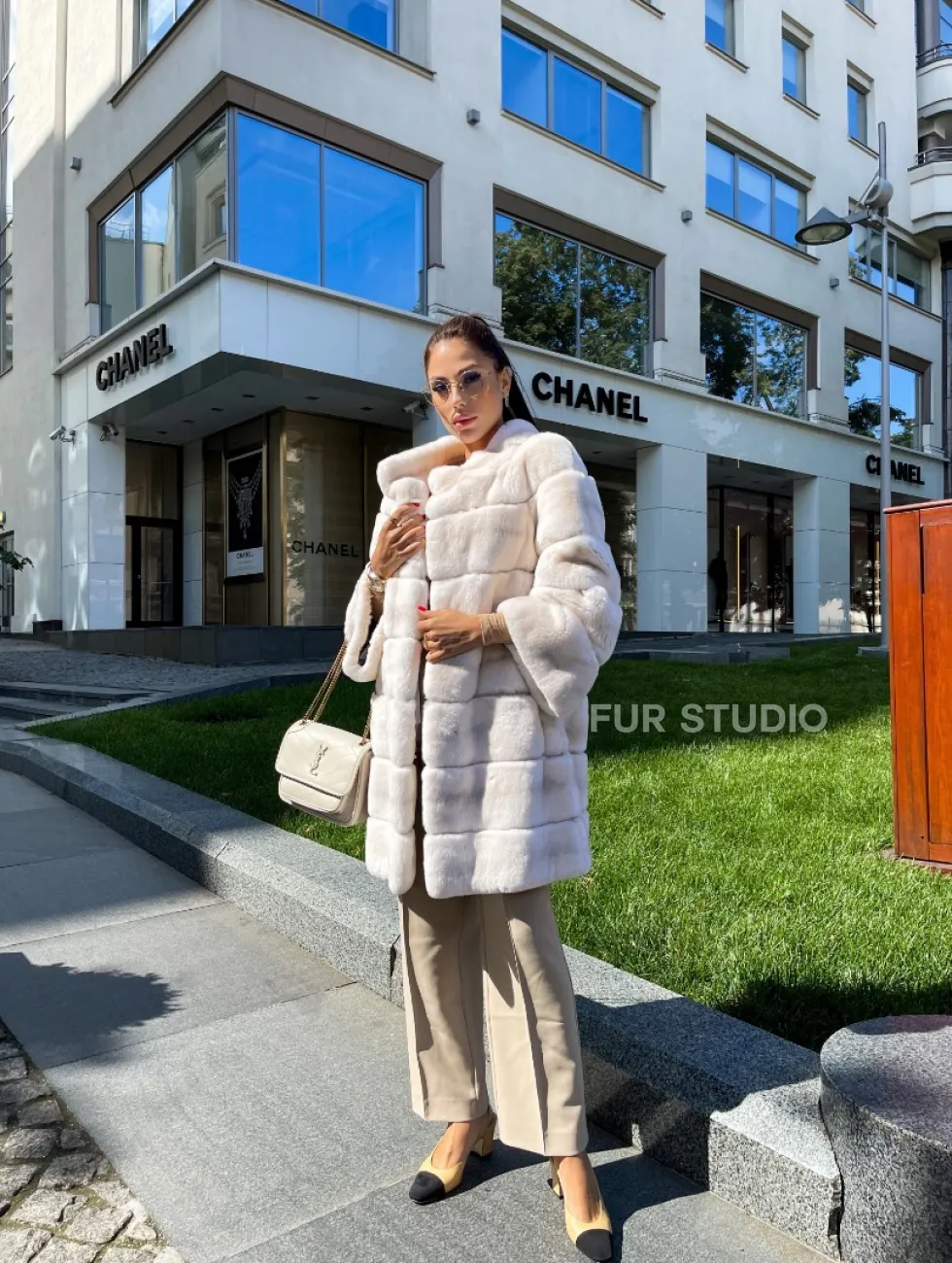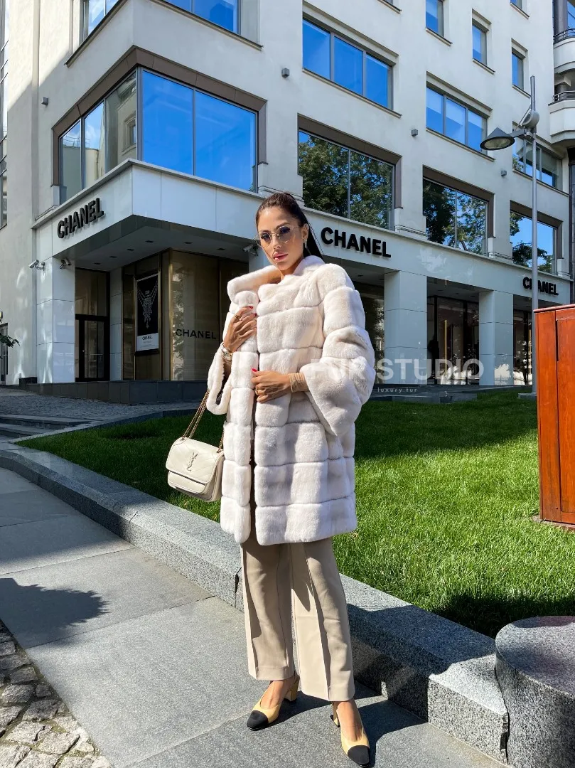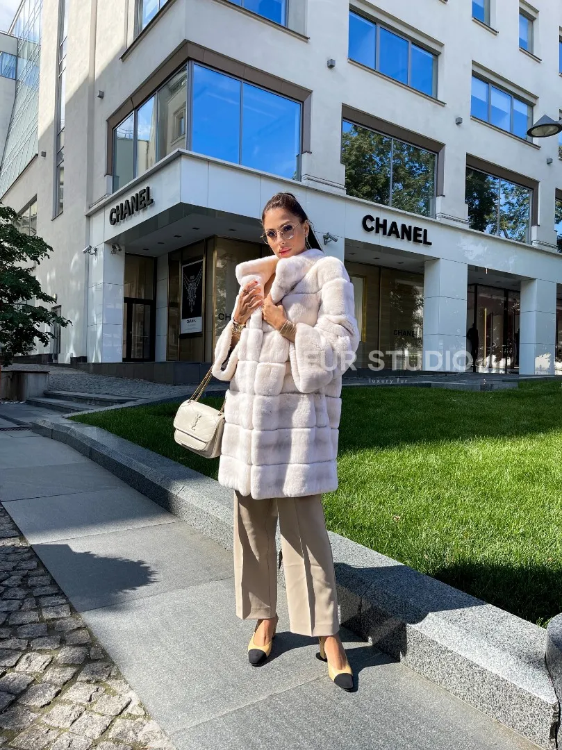 Мех данной шубы кролик рекс , цвет белый. Предлагается в размерах от 42 до . Длина модели 80-85 см, что выгодно подчеркивает фигуру девушек. Эта модель идеально подойдет для девушек и женщин, предпочитающих роскошные натуральные меха.