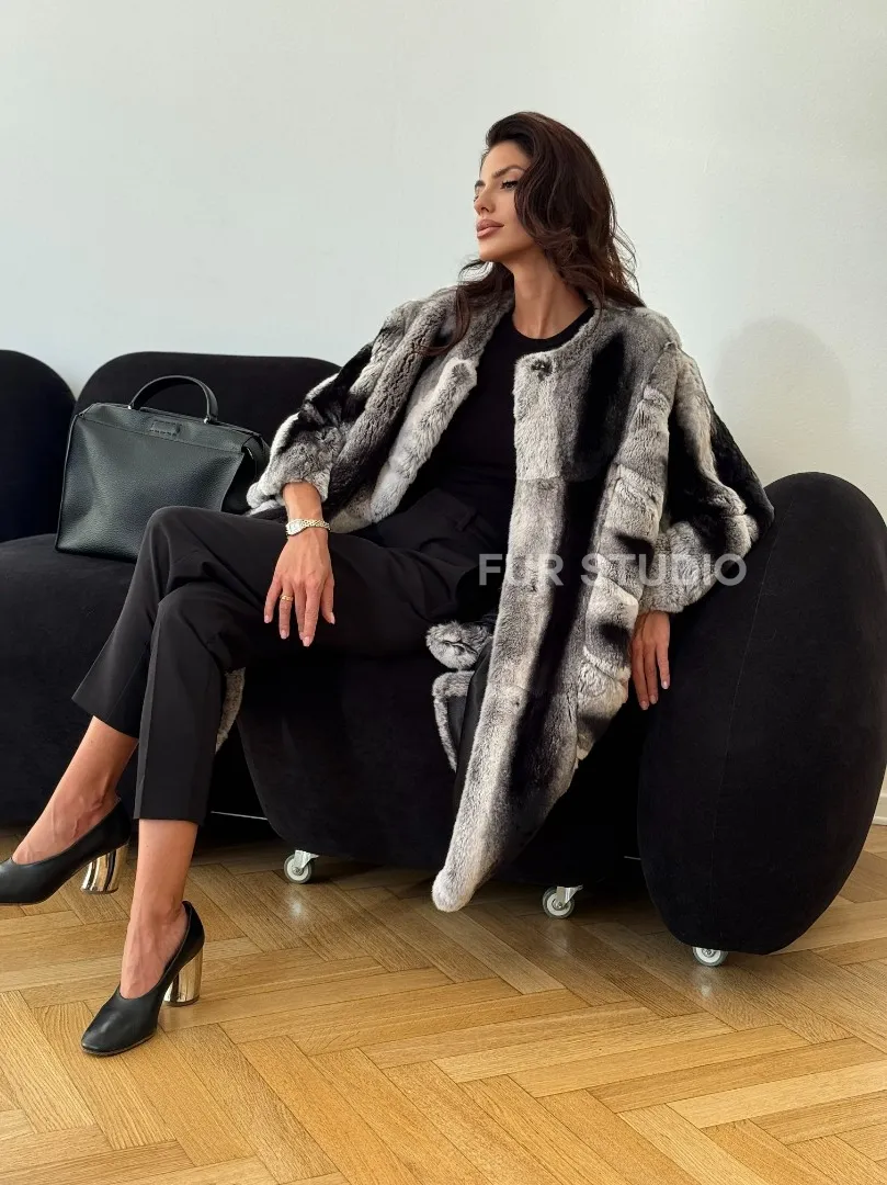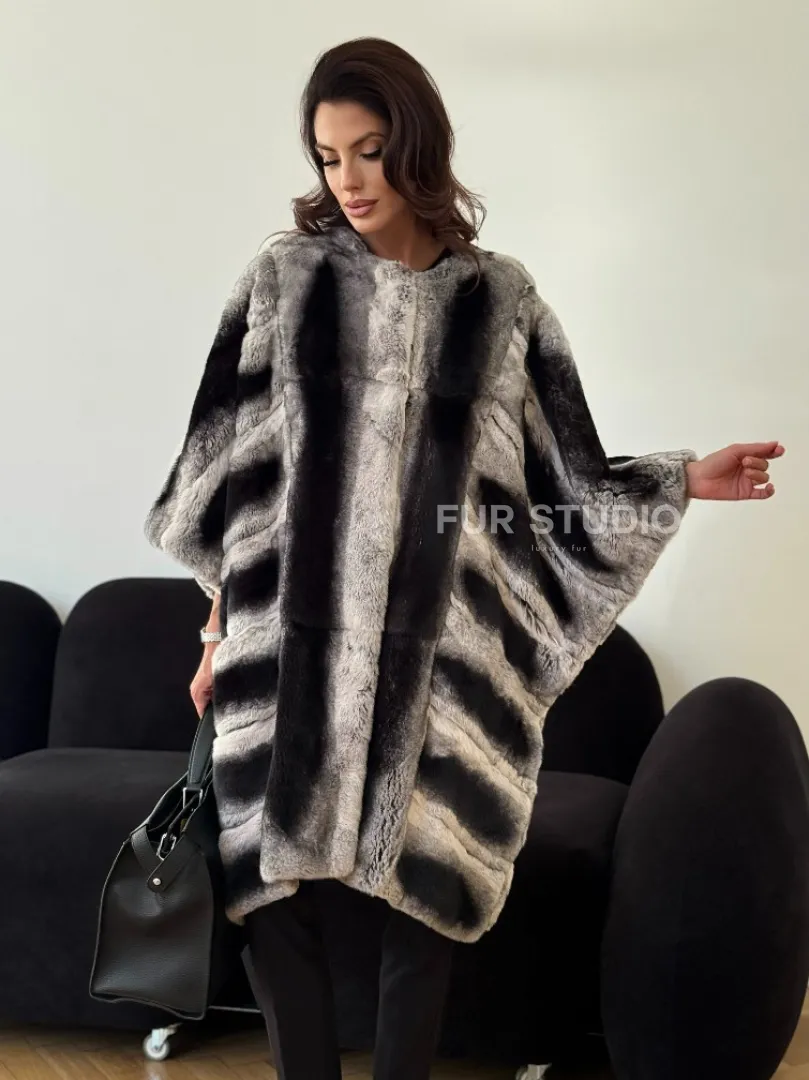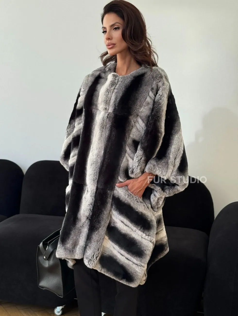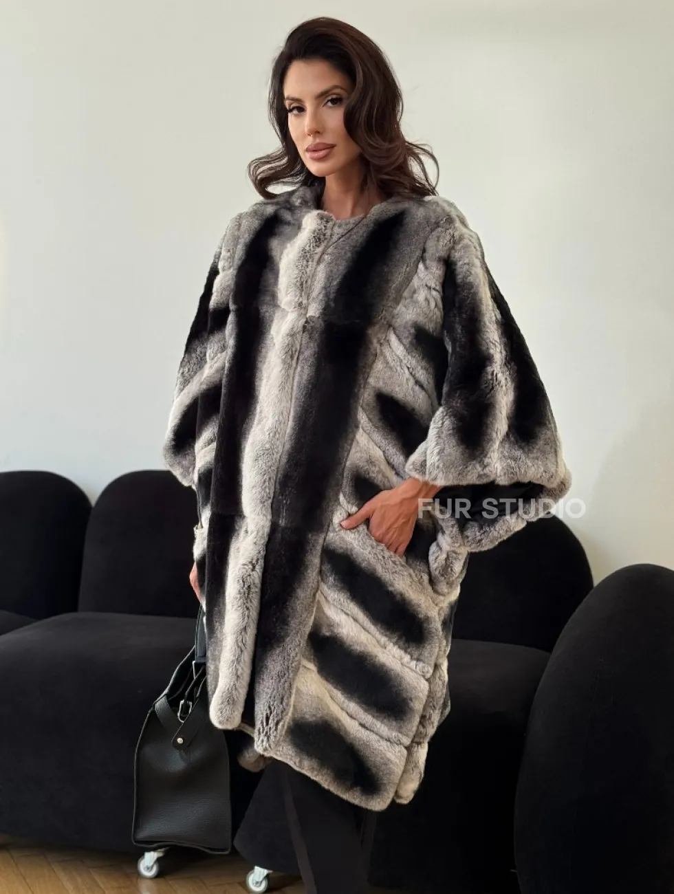 Мех данной шубы кролик рекс , цвет серый. Предлагается в размерах от 40 до 54 (oversize). Длина модели 95-100 см, что выгодно подчеркивает фигуру девушек. Эта модель идеально подойдет для девушек и женщин, предпочитающих роскошные натуральные меха.