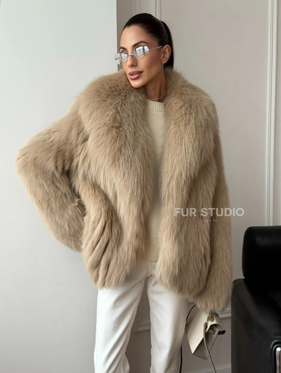 Мех данной шубы лиса, цвет бежевый. Предлагается в размерах от 40 до 50. Длина модели 65-70 см, что выгодно подчеркивает фигуру девушек. Эта модель идеально подойдет для девушек и женщин, предпочитающих роскошные натуральные меха.