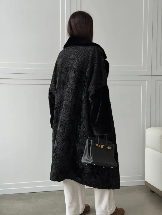 Мех данной шубы каракуль, цвет черный. Предлагается в размерах от 42 до 52. Длина модели 115-120 см, что выгодно подчеркивает фигуру девушек. Эта модель идеально подойдет для девушек и женщин, предпочитающих роскошные натуральные меха.