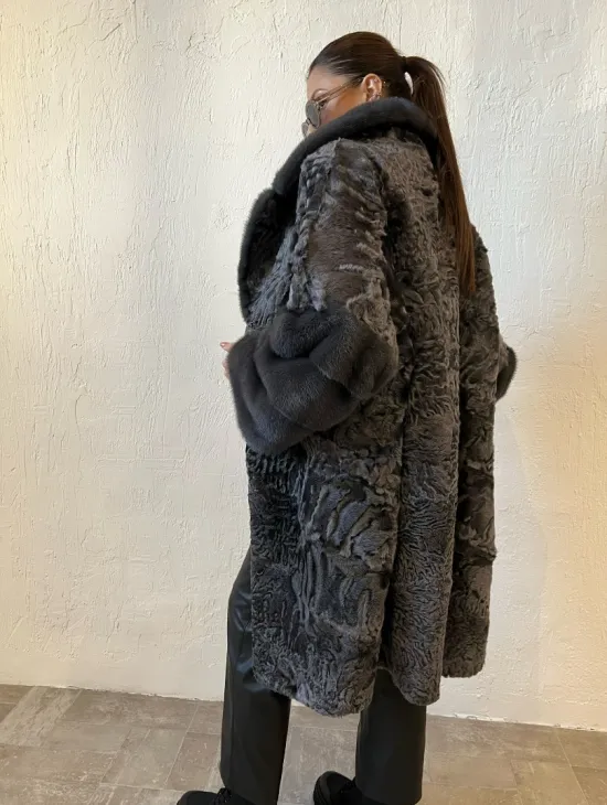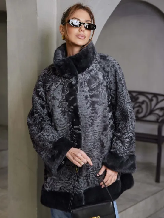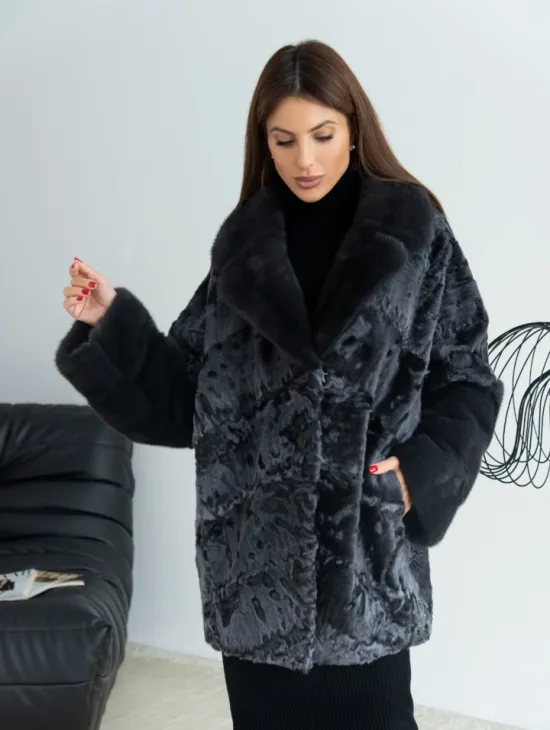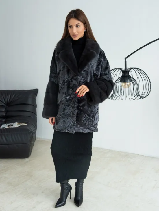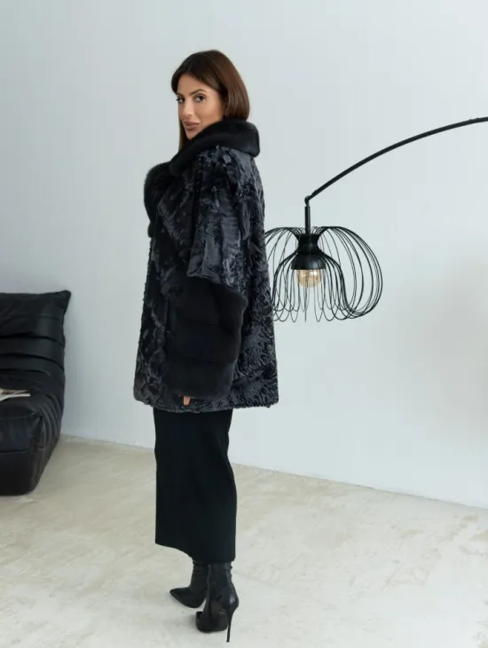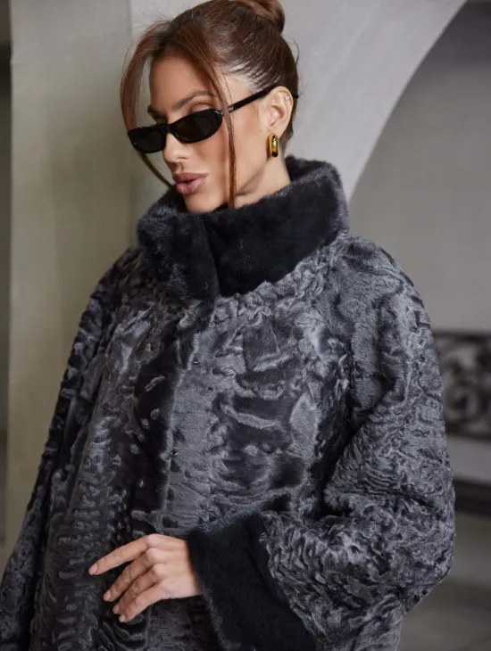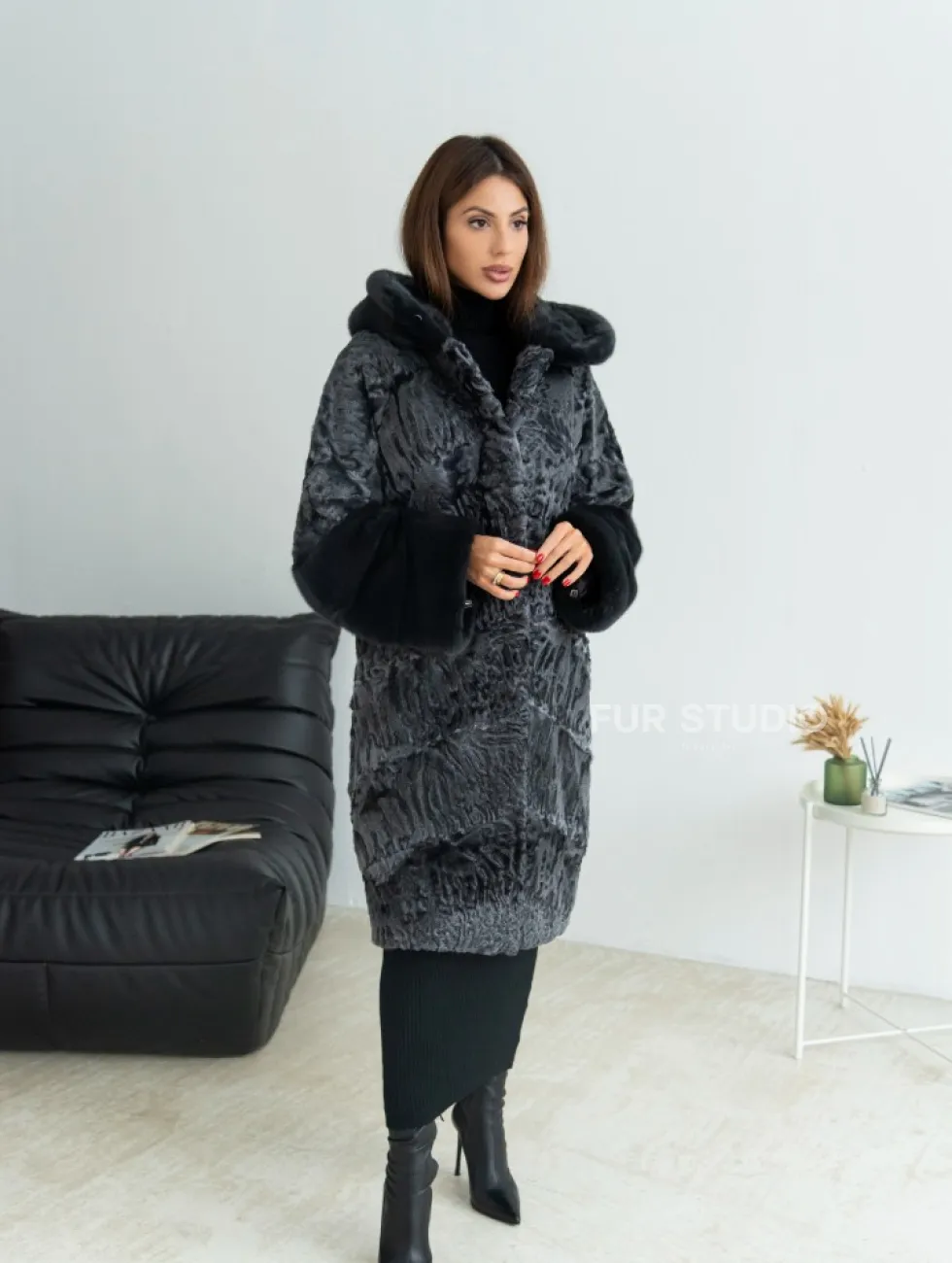 Шуба из каракульчи с отделкой из меха норки с капюшоном, цвет графит – выбор истинных модниц любого возраста. Модель изыскана, сочетает в себе роскошь и стиль. Уникальная комбинация меха делает look необычным и женственным. Роскошный капюшон позаботится о прическе и не даст замерзнуть голове в непогоду. Теплый мех изделия согреет владелицу в прохладное время года.
