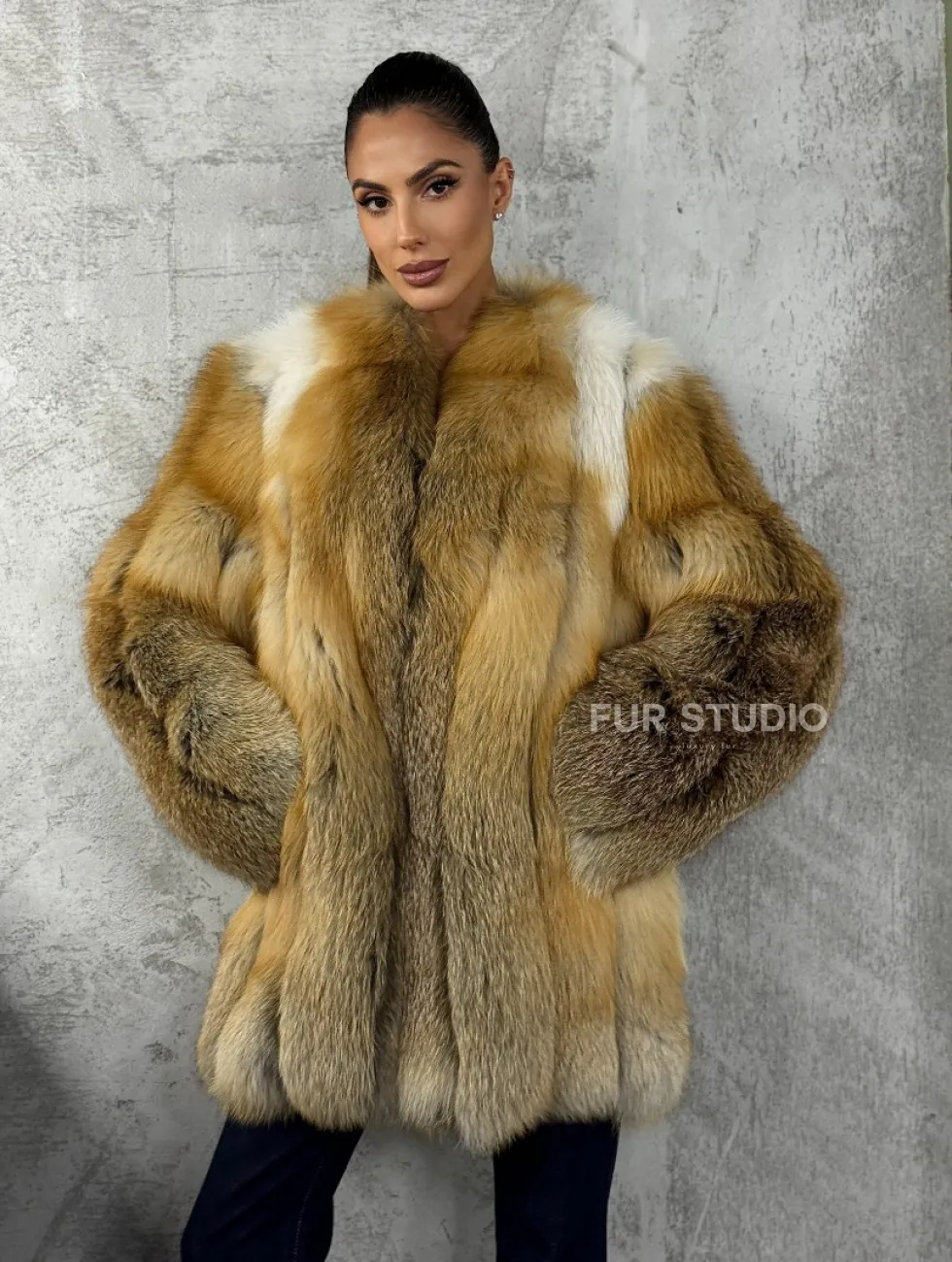 Мех данной шубы лиса, цвет рыжий. Предлагается в размерах от 42 до 44. Длина модели 75-80 см, что выгодно подчеркивает фигуру девушек. Эта модель идеально подойдет для девушек и женщин, предпочитающих роскошные натуральные меха.
