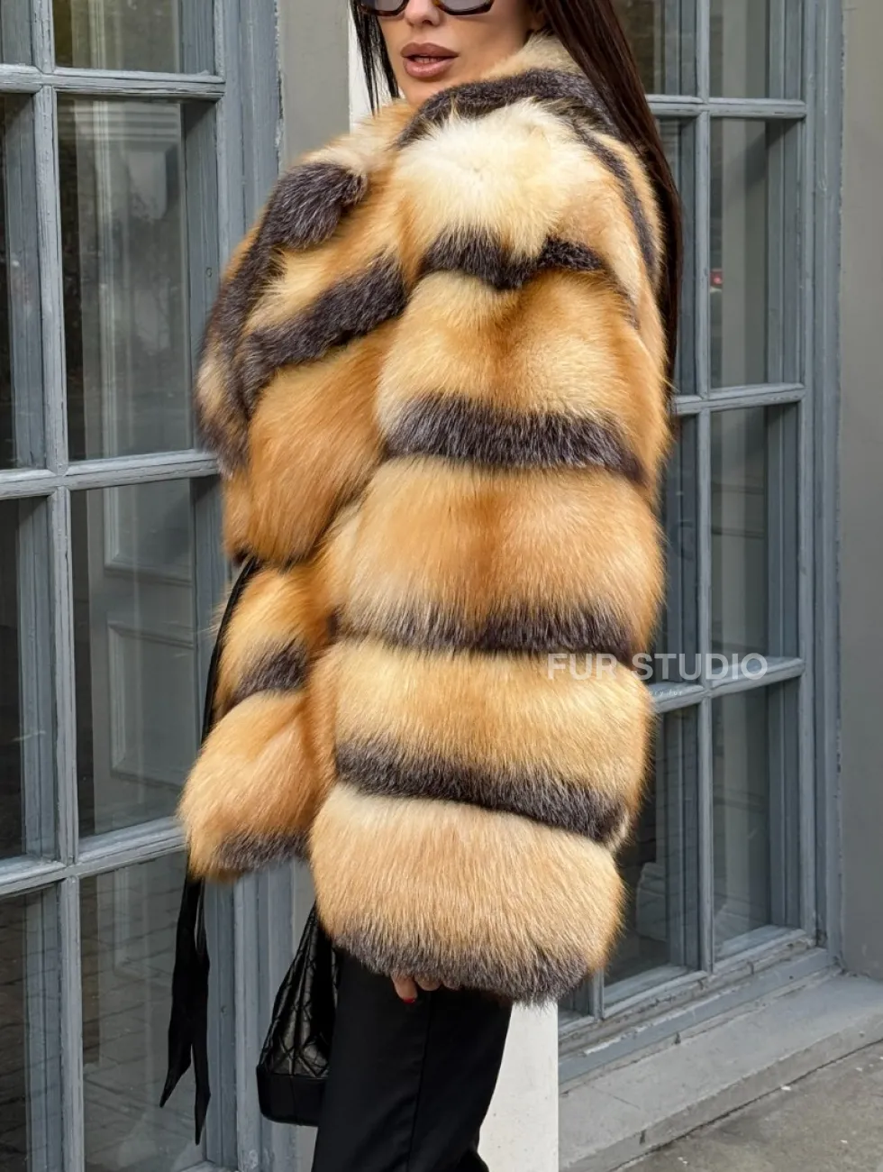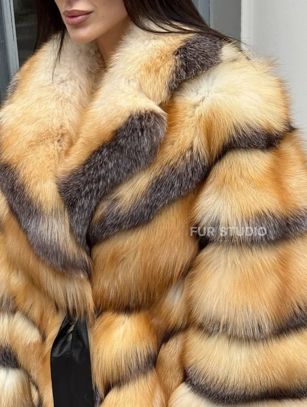 Мех данной шубы лиса, цвет рыжий. Предлагается в размерах от 42 до 48. Длина модели 65-70 см, что выгодно подчеркивает фигуру девушек. Эта модель идеально подойдет для девушек и женщин, предпочитающих роскошные натуральные меха.