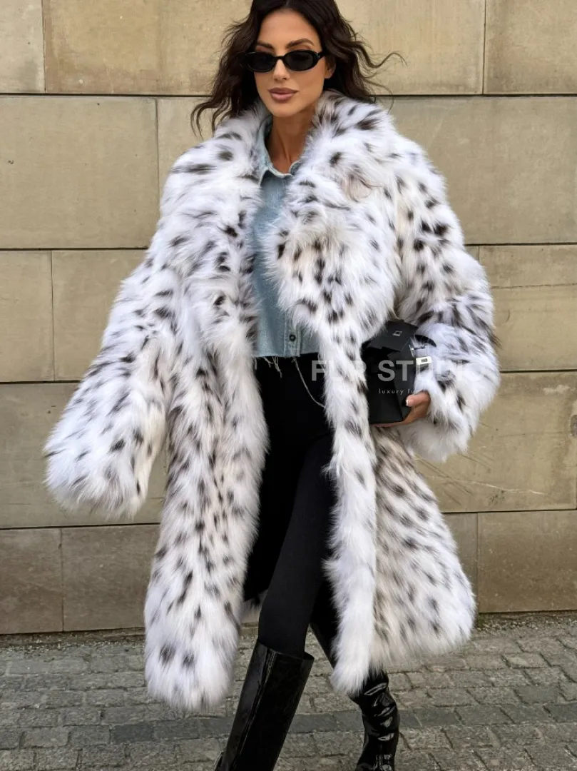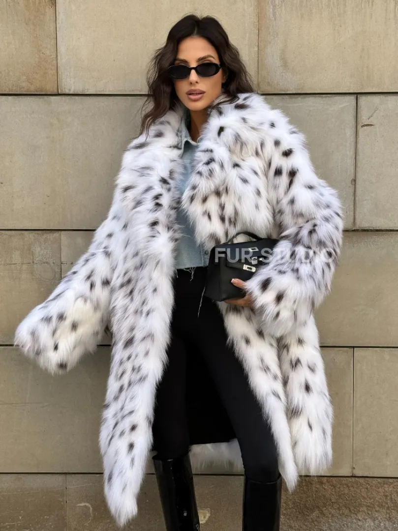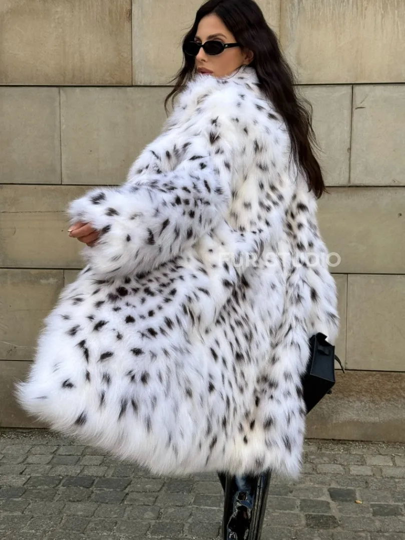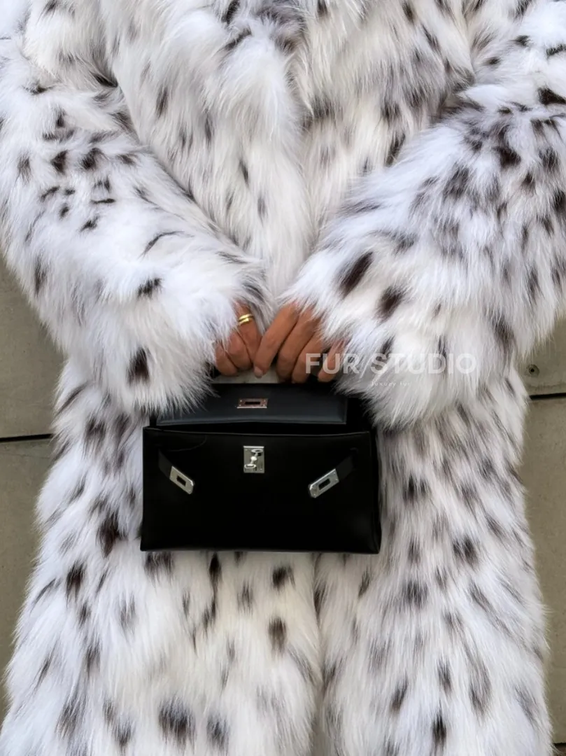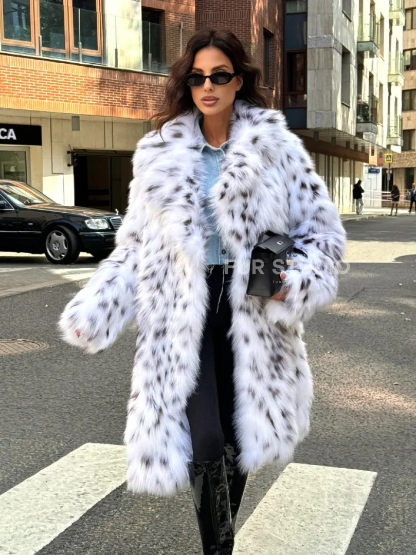 Шуба - Белая лиса с вшитыми пятнами из рыси PREMIUM качество, фасон «летучая мышь» легкая и стильная, созданная специально для уверенной в сете активной роскошной женщины. Даже в длине до середины бедра шуба из лисы подарит уют и тепло в любую погоду: в ней комфортно прогуливаться в морозные и ветреные дни, причем не только от такси до ресторана.