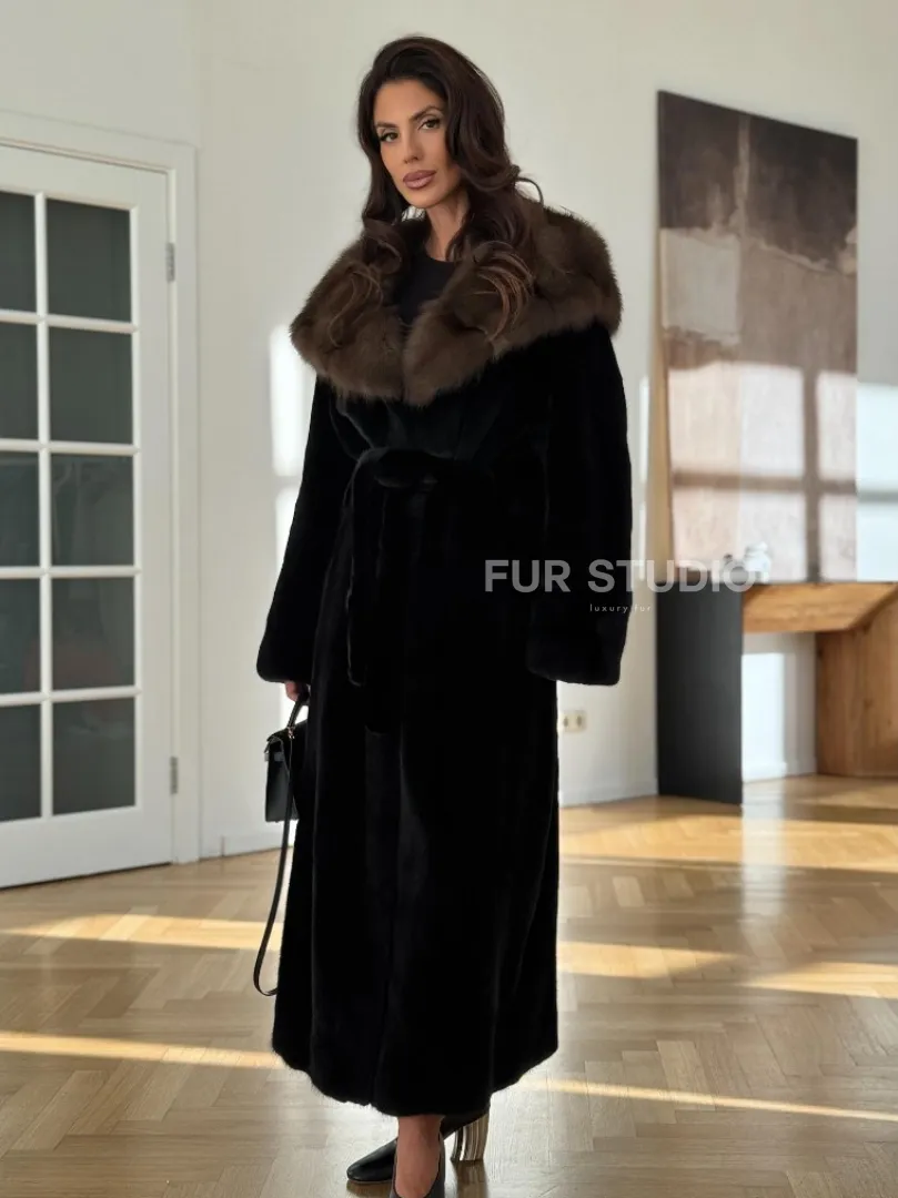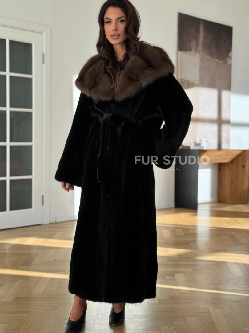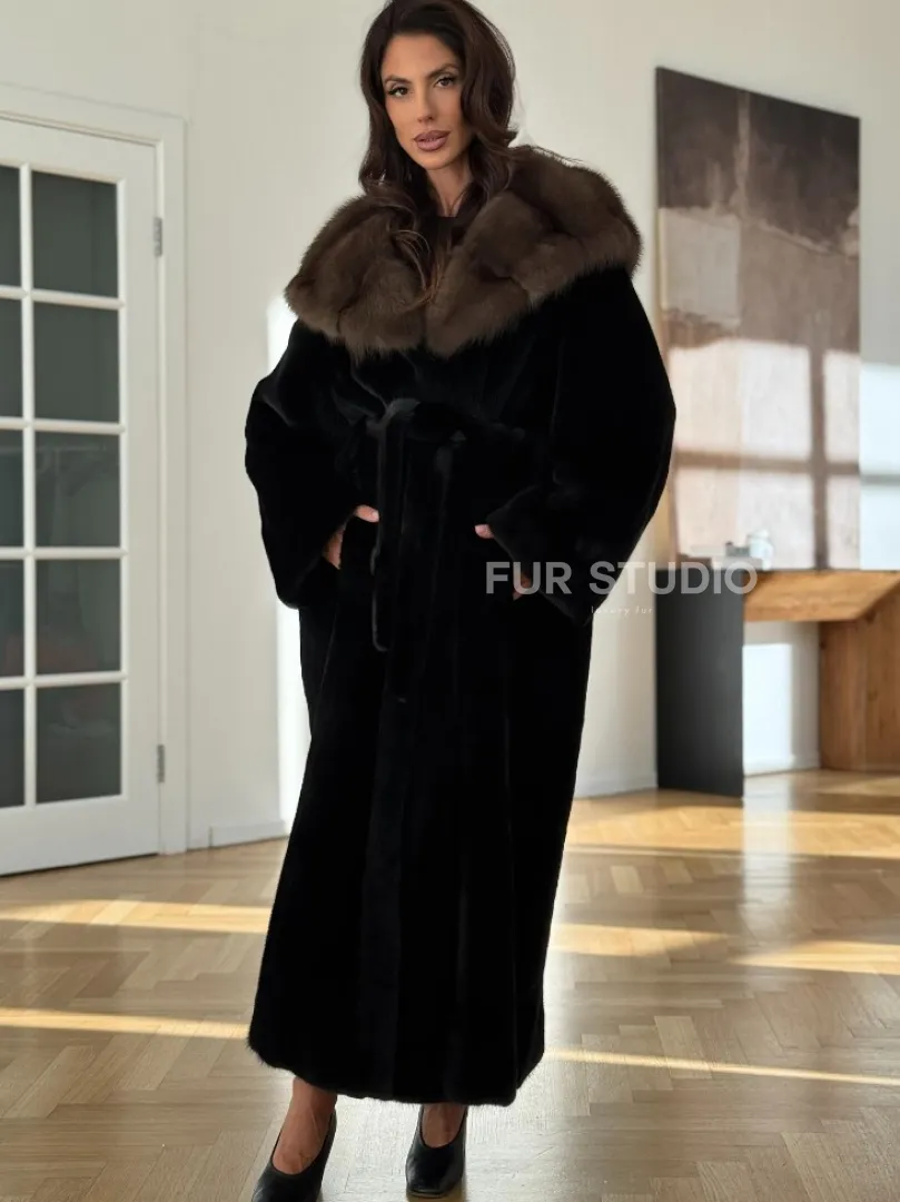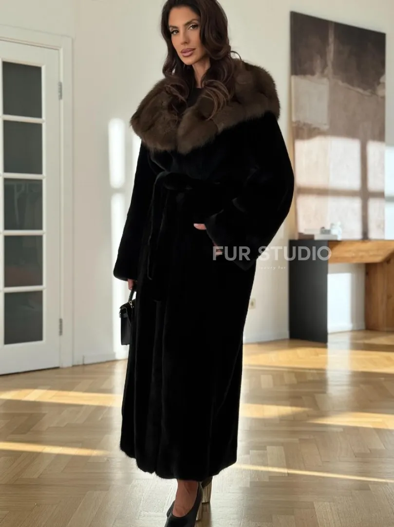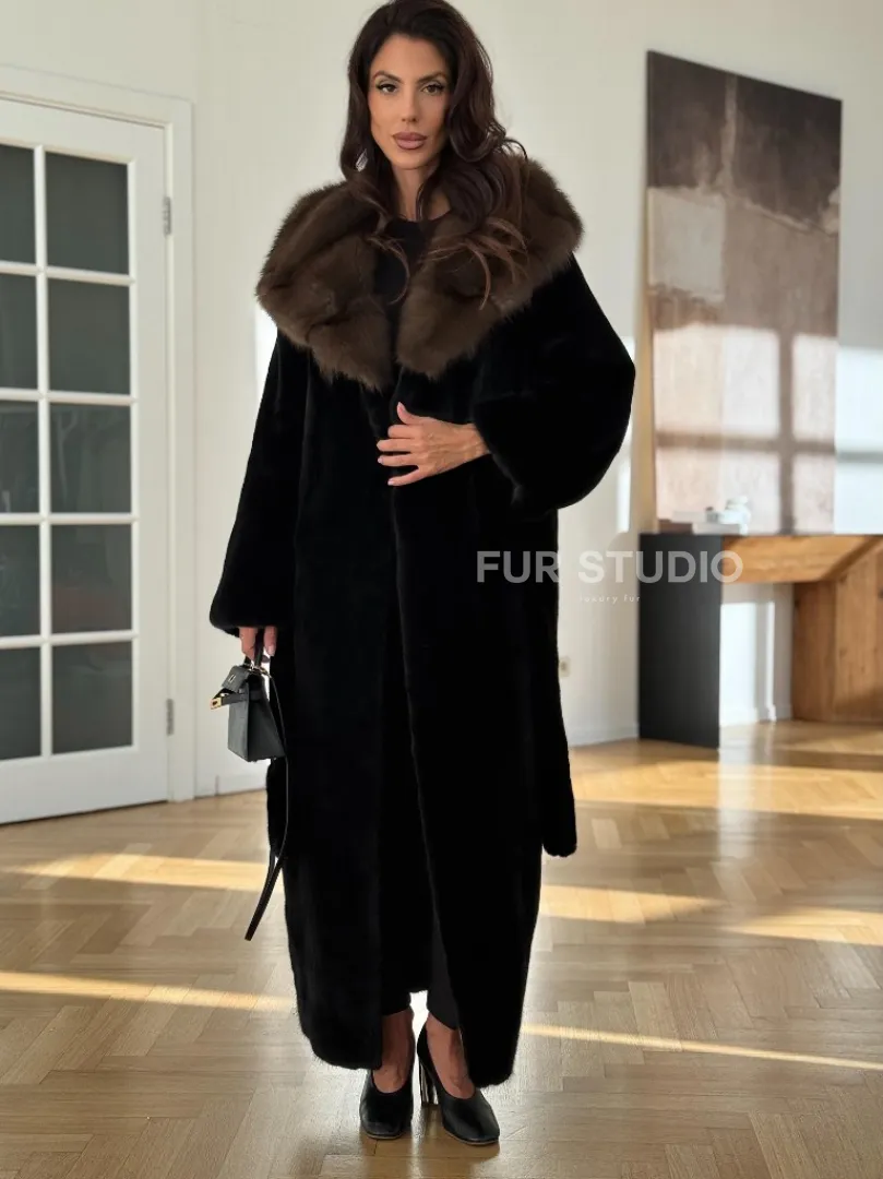 Мех данной шубы аукционная норка, цвет черный. Предлагается в размерах от 42 до 52 (oversize). Длина модели 125-130 см, что выгодно подчеркивает фигуру девушек. Эта модель идеально подойдет для девушек и женщин, предпочитающих роскошные натуральные меха.