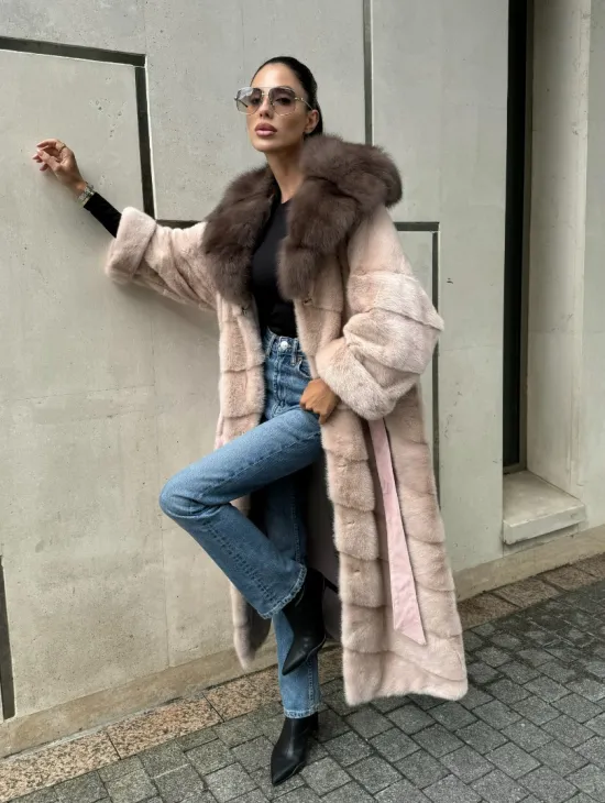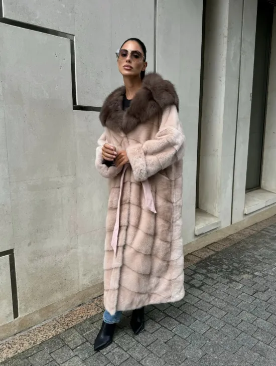 Мех данной шубы аукционная норка , цвет розовый. Предлагается в размерах от 42 до 58. Длина модели 115-120 см, что выгодно подчеркивает фигуру девушек. Эта модель идеально подойдет для девушек и женщин, предпочитающих роскошные натуральные меха.