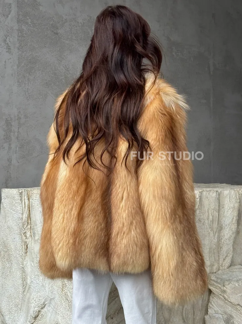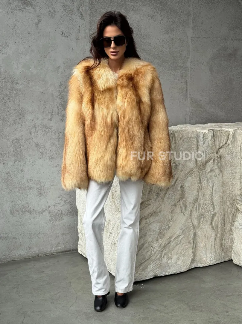 Мех данной шубы лиса, цвет рыжий. Предлагается в размерах от 42 до 48. Длина модели 65-70 см, что выгодно подчеркивает фигуру девушек. Эта модель идеально подойдет для девушек и женщин, предпочитающих роскошные натуральные меха.
