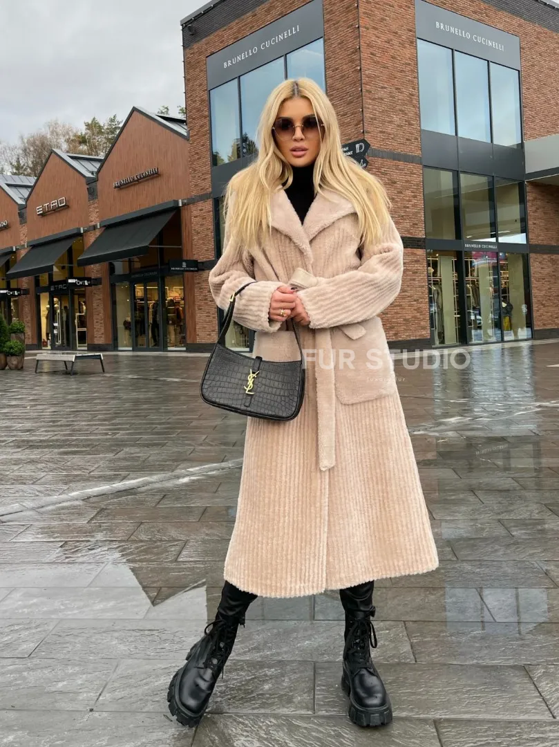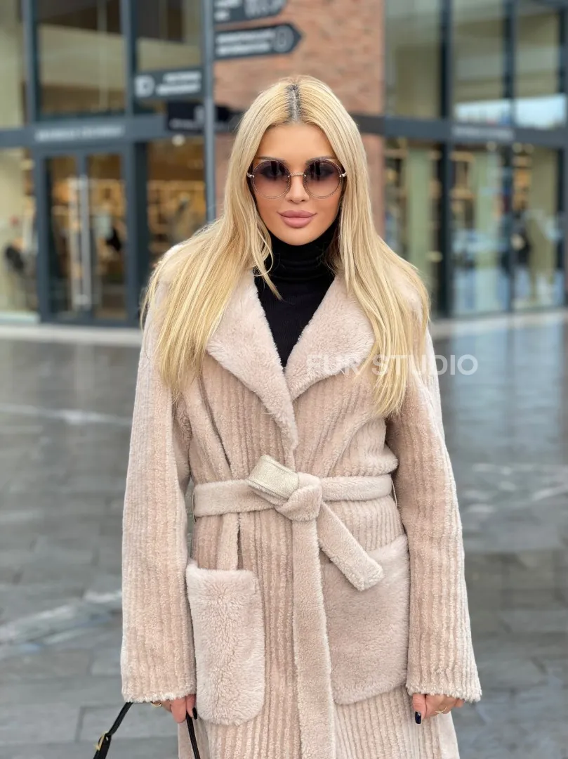 Шуба из натуральной шерсти в бежевом оттенке выбор девушек с отличным вкусом. Изделие выглядит стильно, лаконично. Натуральная шерсть позаботится о комфортной температуре тела в прохладное время года. Необычный крой зрительно удлинит силуэт и подчеркнет достоинства фигуры. Оригинальный пояс очертит талию. Глубокие карманы согреют ручки в непогоду.