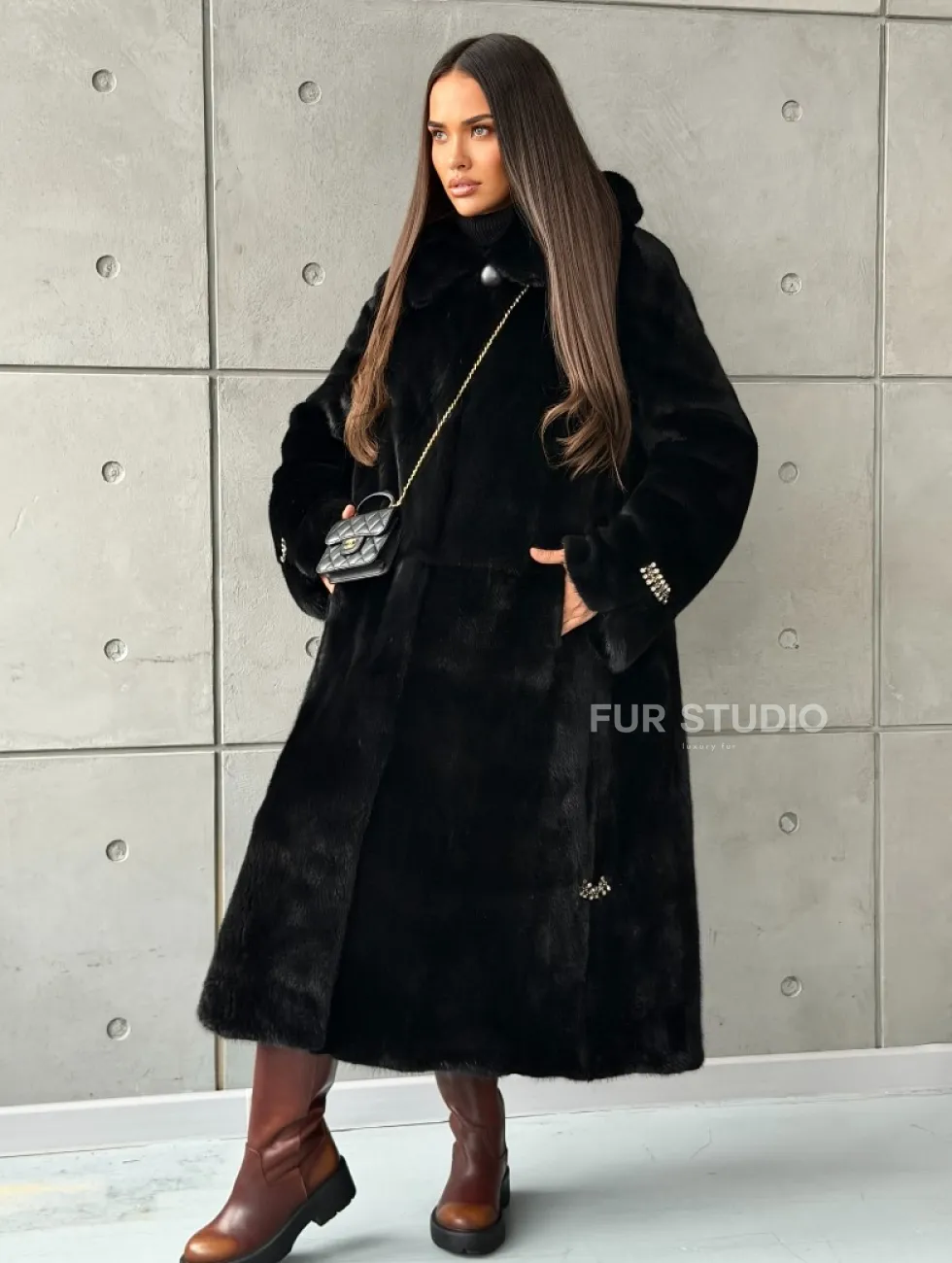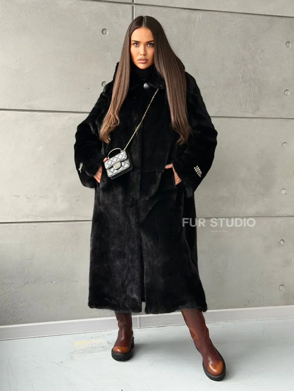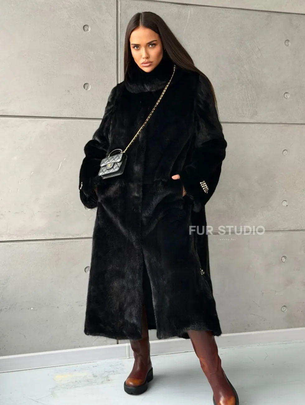 Мех данной шубы аукционная норка, цвет черный. Предлагается в размерах от 46 до 56. Длина модели 115-120 см, что выгодно подчеркивает фигуру девушек. Эта модель идеально подойдет для девушек и женщин, предпочитающих роскошные натуральные меха.