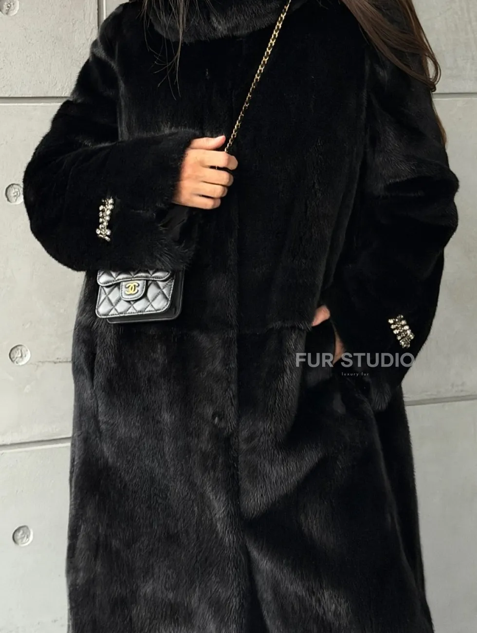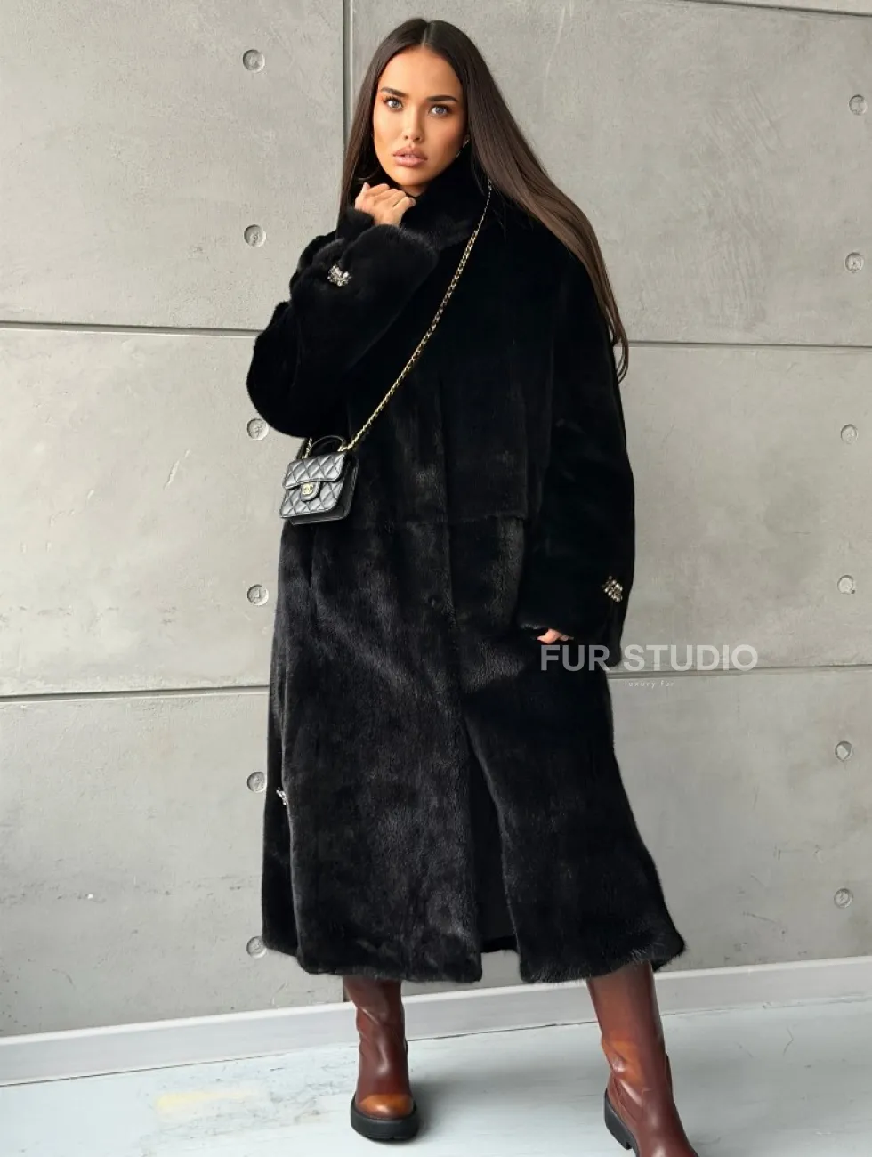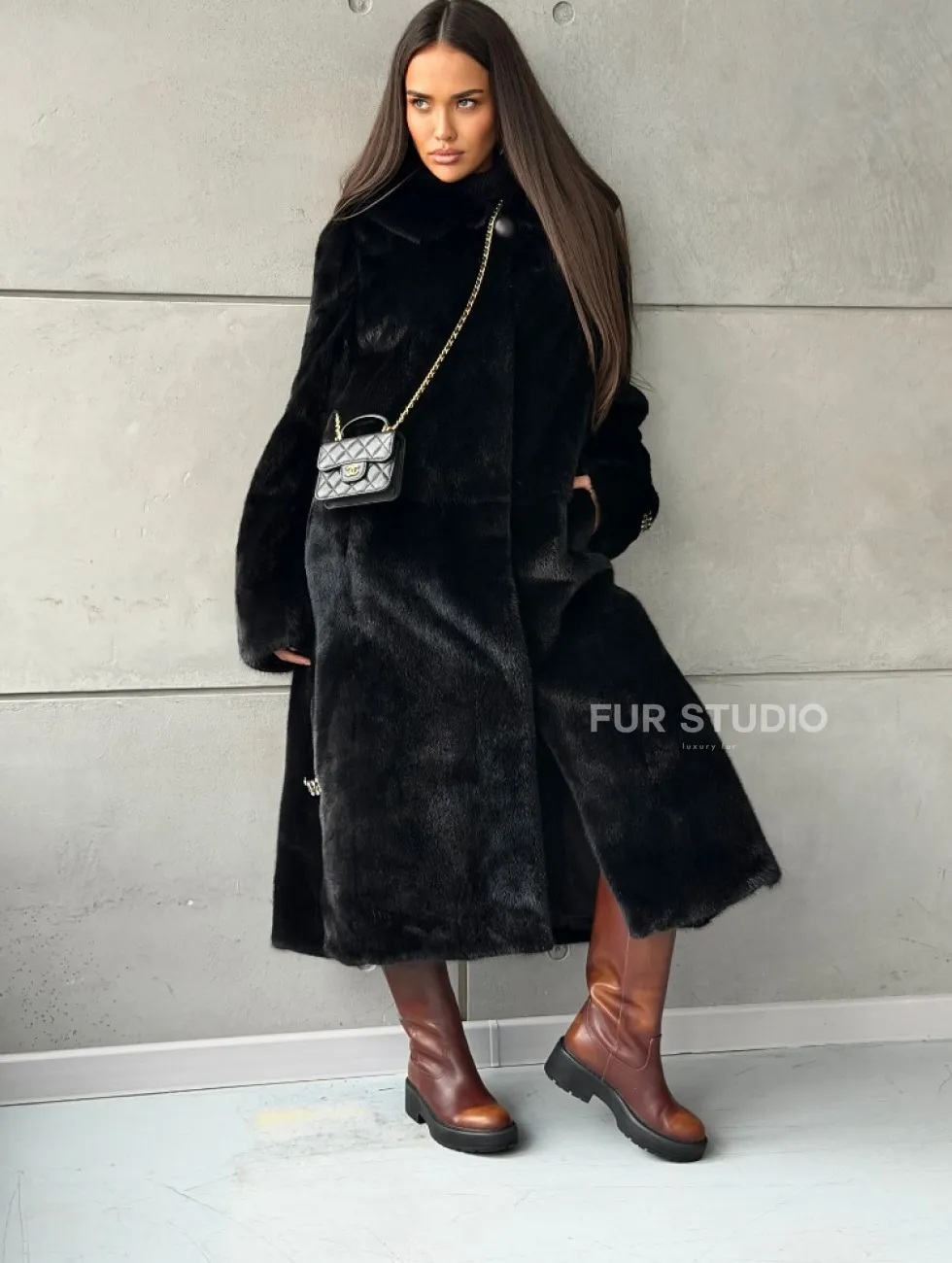 Мех данной шубы аукционная норка, цвет черный. Предлагается в размерах от 46 до 56. Длина модели 115-120 см, что выгодно подчеркивает фигуру девушек. Эта модель идеально подойдет для девушек и женщин, предпочитающих роскошные натуральные меха.