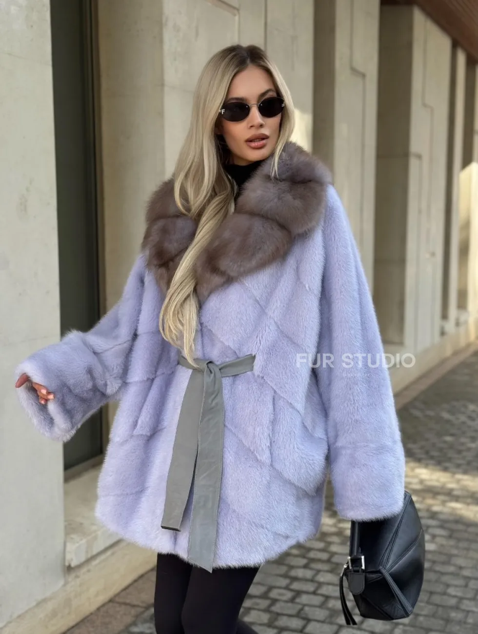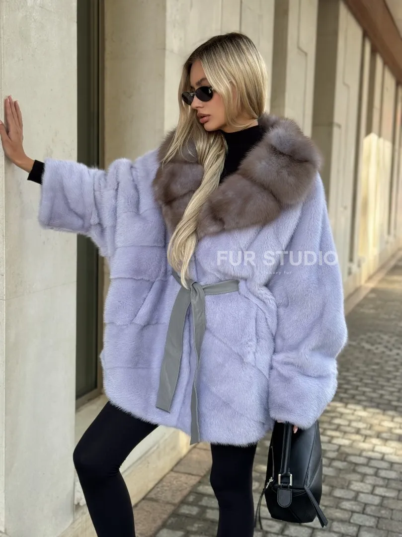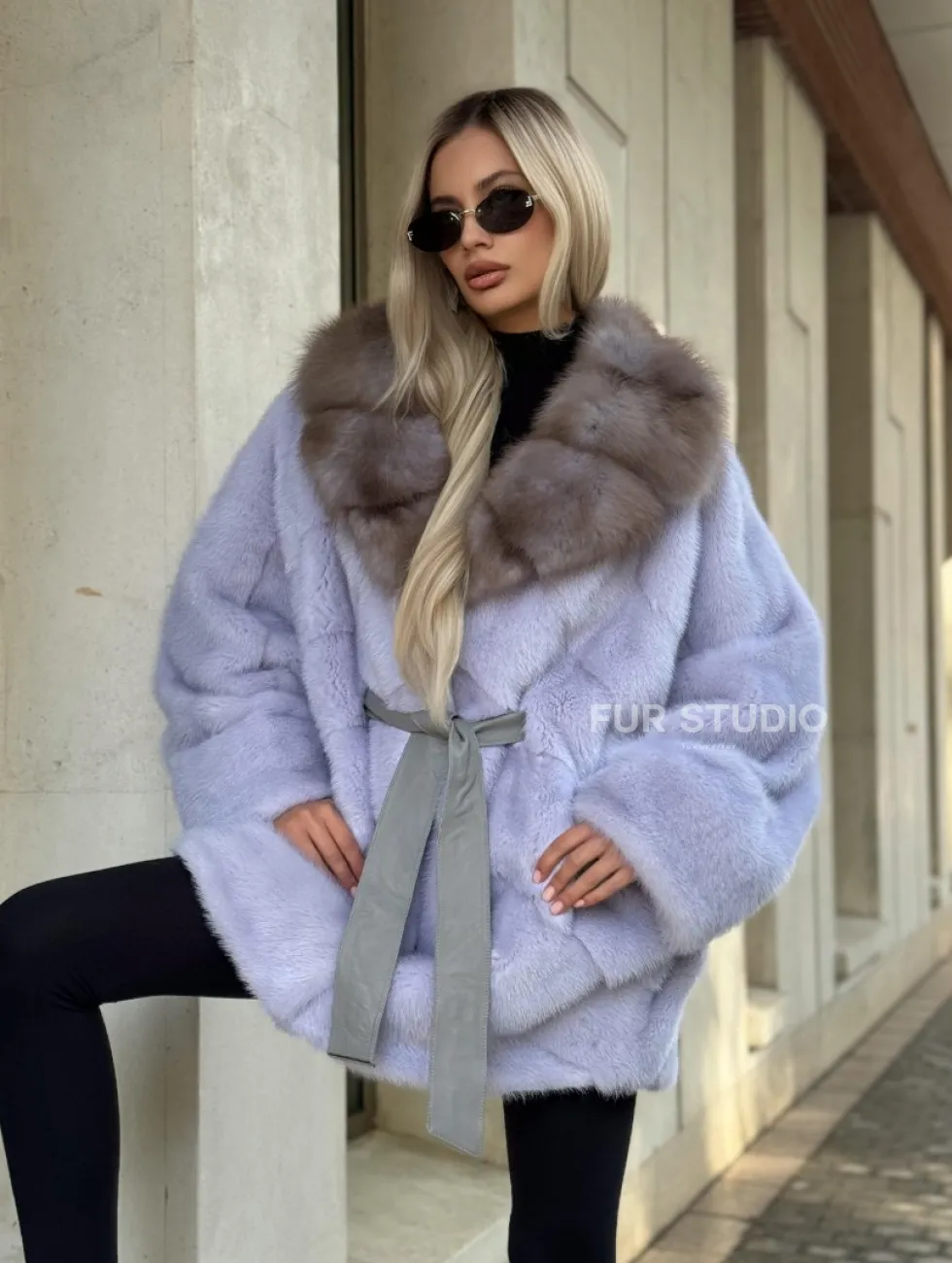 Мех данной шубы аукционная норка , цвет голубой. Предлагается в размерах от 42 до 56. Длина модели 75-80 см, что выгодно подчеркивает фигуру девушек. Эта модель идеально подойдет для девушек и женщин, предпочитающих роскошные натуральные меха.