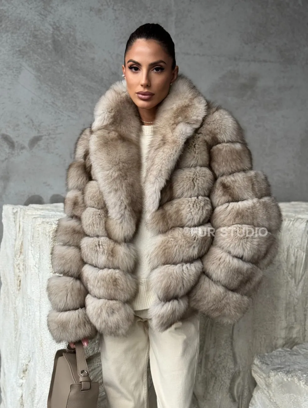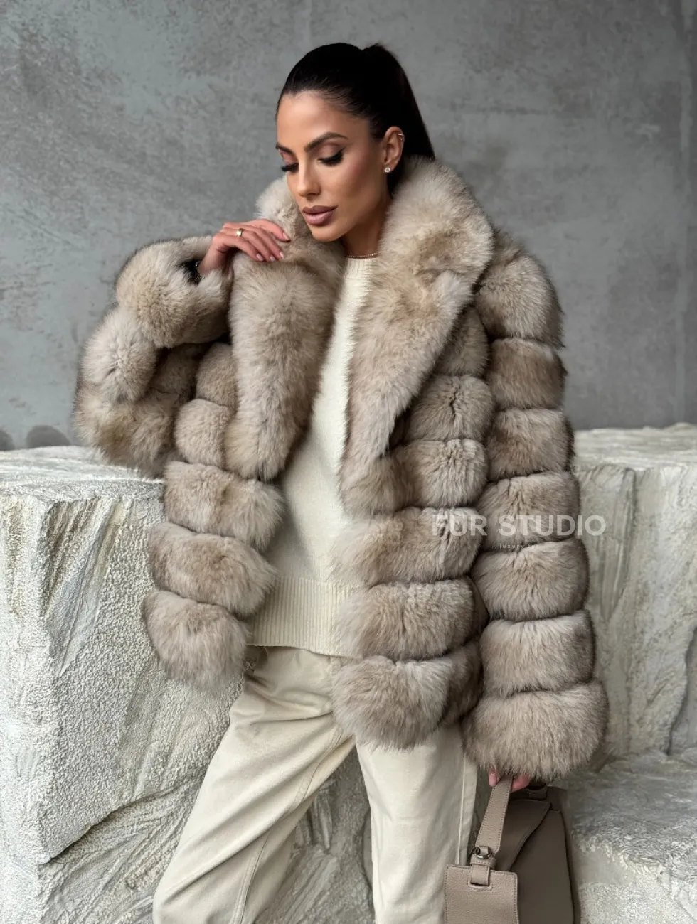 Мех данной шубы финский песец, цвет бежевый. Предлагается в размерах от 42 до 48. Длина модели 60-65 см, что выгодно подчеркивает фигуру девушек. Эта модель идеально подойдет для девушек и женщин, предпочитающих роскошные натуральные меха.