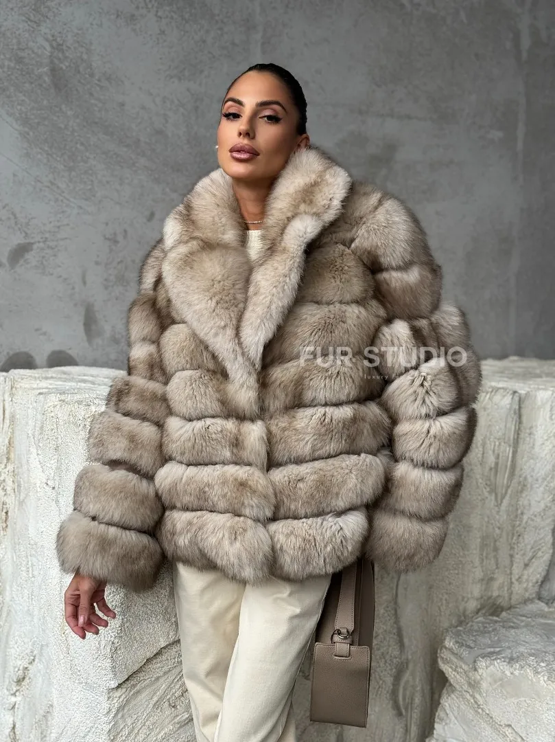 Мех данной шубы финский песец, цвет бежевый. Предлагается в размерах от 40 до 48. Длина модели 60-65 см, что выгодно подчеркивает фигуру девушек. Эта модель идеально подойдет для девушек и женщин, предпочитающих роскошные натуральные меха.