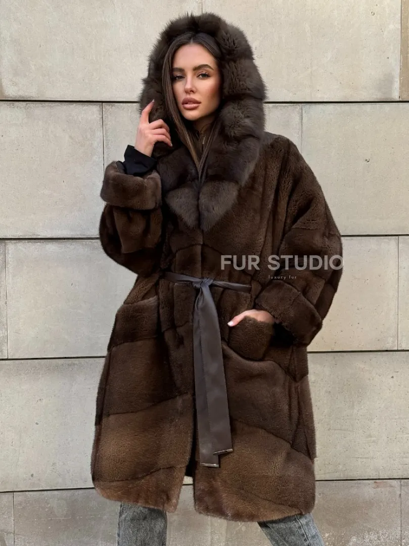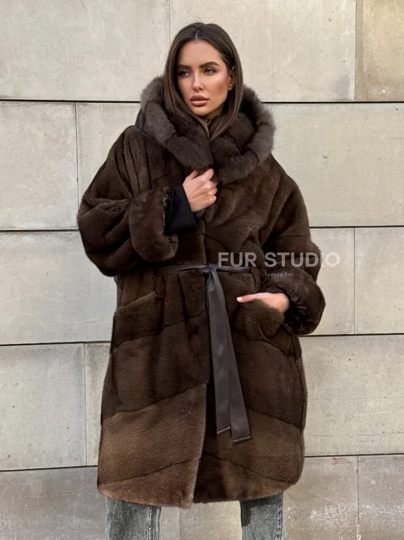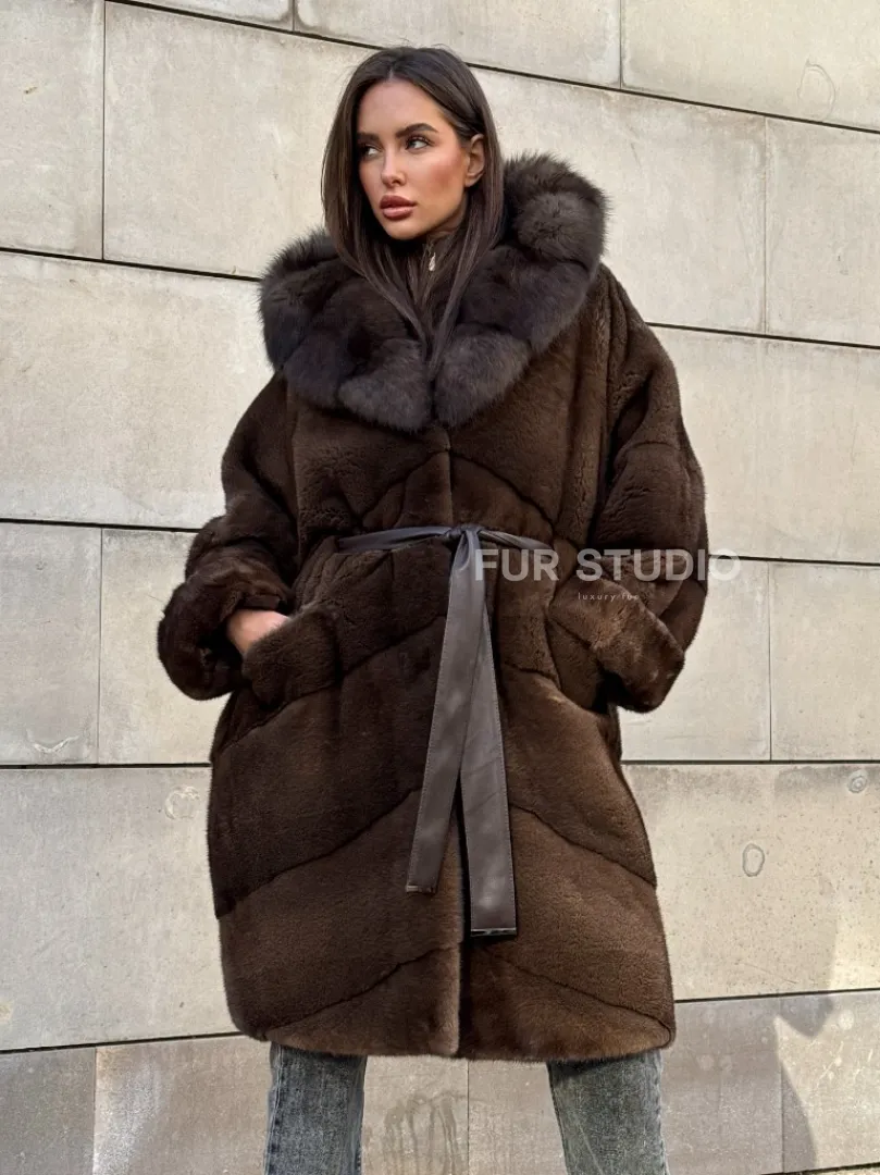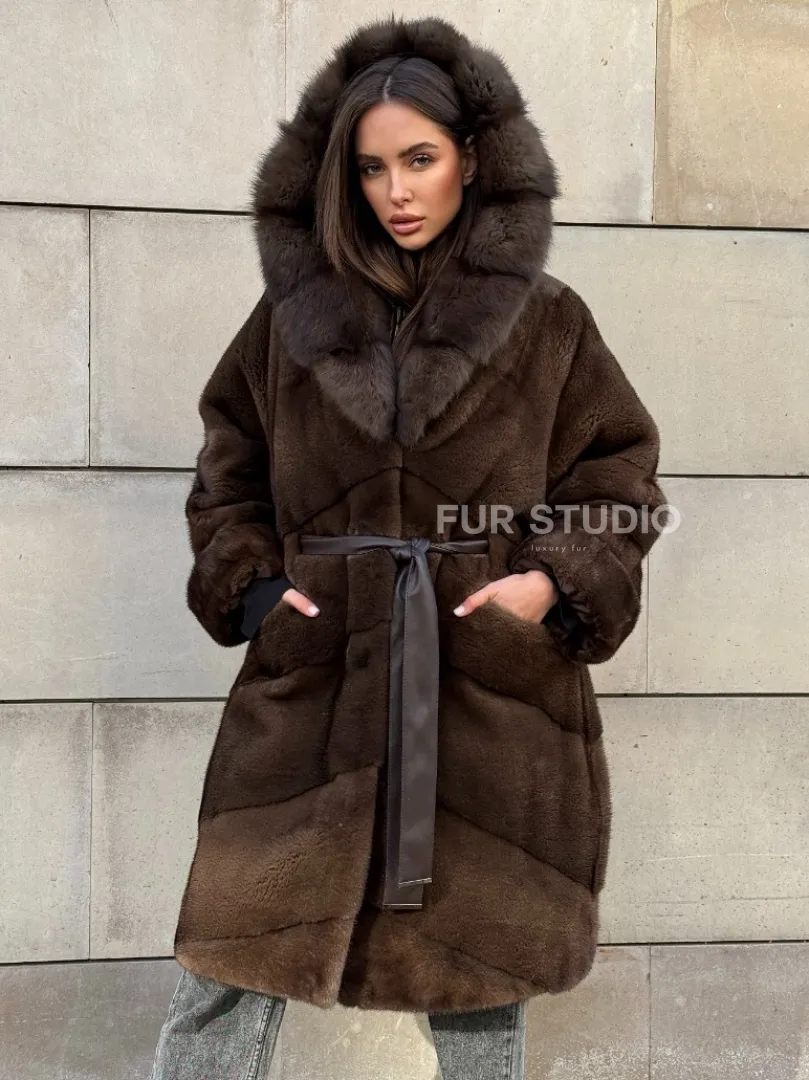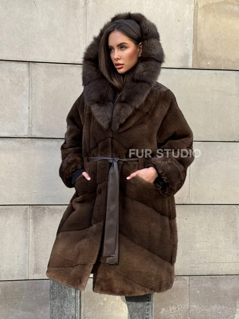 Шуба из плюшевой норки Velvet с капюшоном из меха куницы, средней длины доступна для покупки в нашем шоуруме Furs Studio в Москве. У нас так же есть доставка во все города России. Добавьте немного роскоши в свой гардероб с этой шубой, которая будет служить вам многие годы.