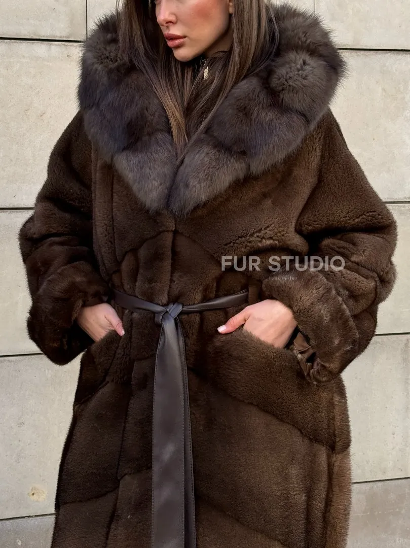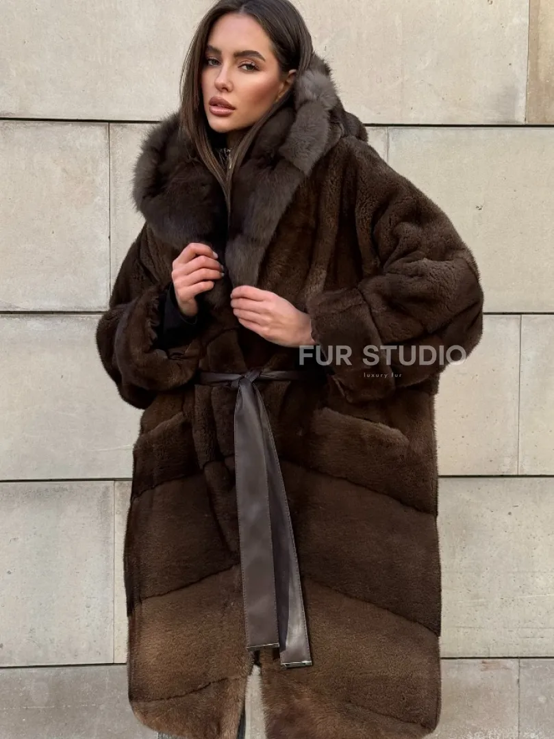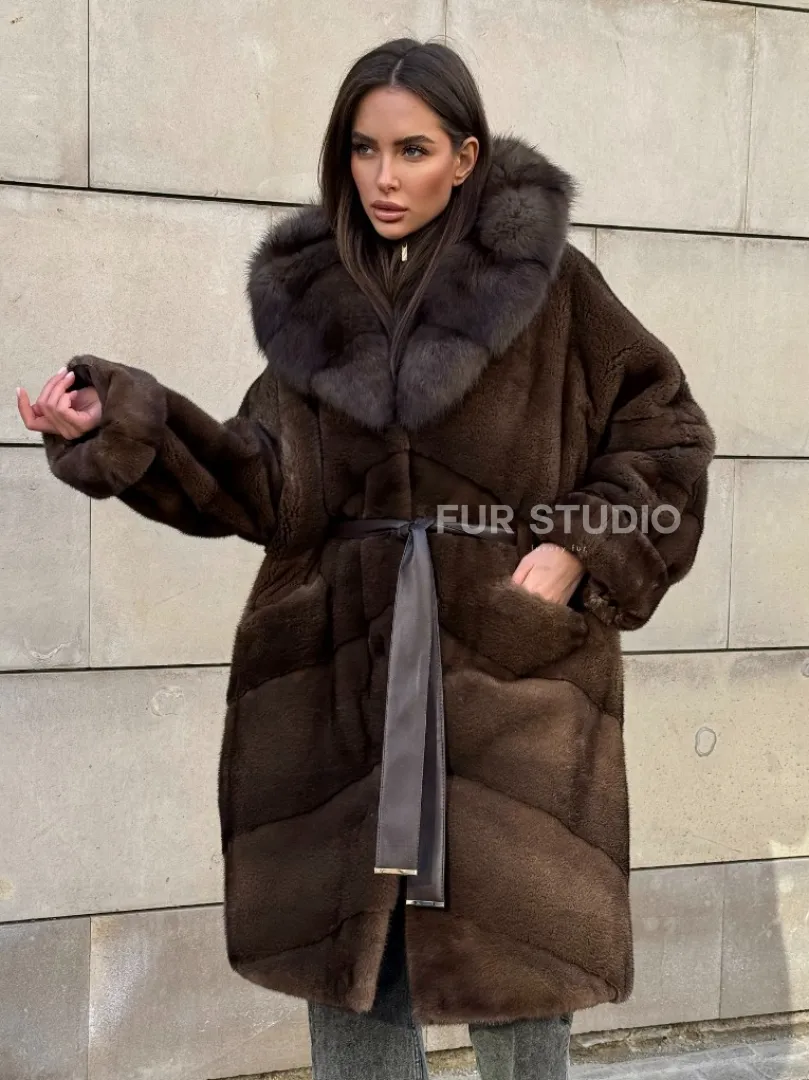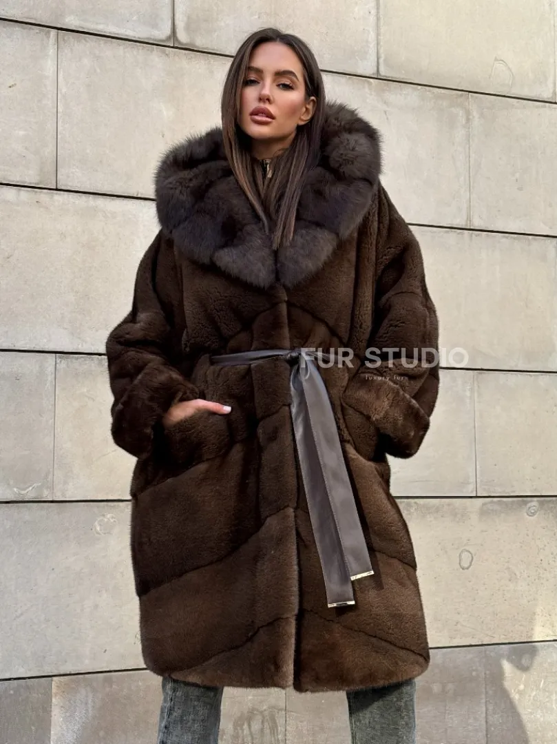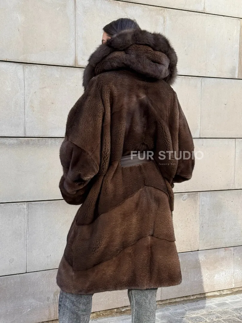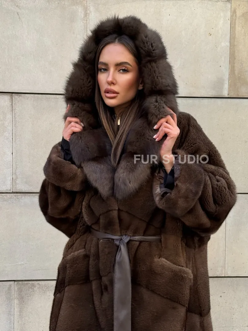 Шуба из плюшевой норки Velvet с капюшоном из меха куницы, средней длины доступна для покупки в нашем шоуруме Furs Studio в Москве. У нас так же есть доставка во все города России. Добавьте немного роскоши в свой гардероб с этой шубой, которая будет служить вам многие годы.