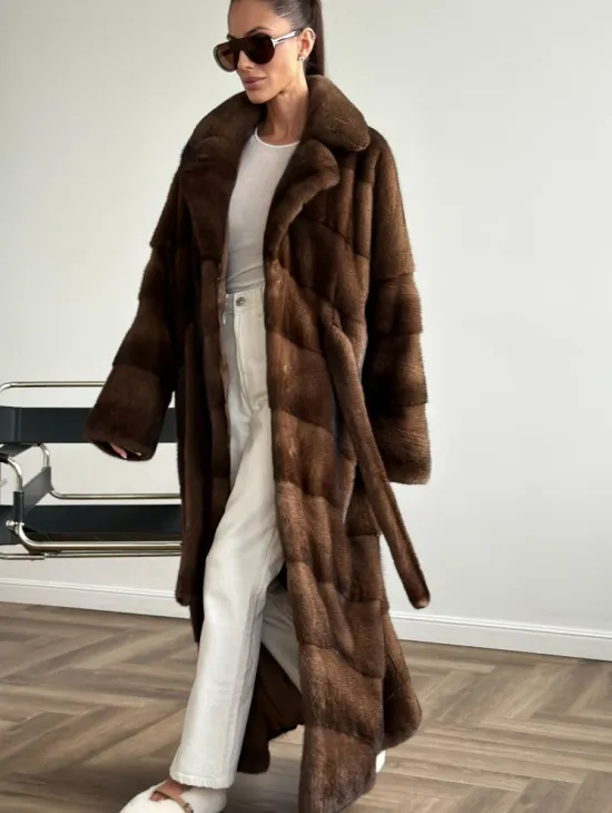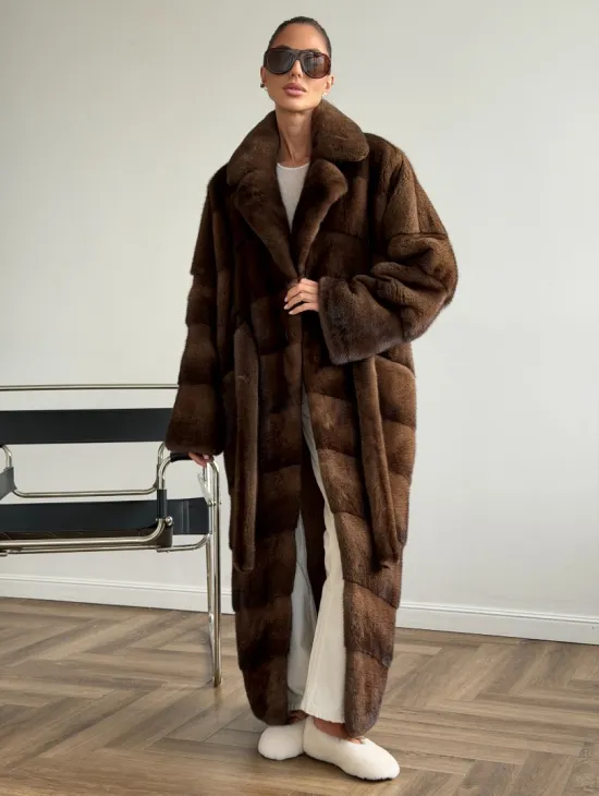Мех данной шубы аукционная норка, цвет коричневый. Предлагается в размерах от 42 до 52. Длина модели 110-115 см, что выгодно подчеркивает фигуру девушек. Эта модель идеально подойдет для девушек и женщин, предпочитающих роскошные натуральные меха.