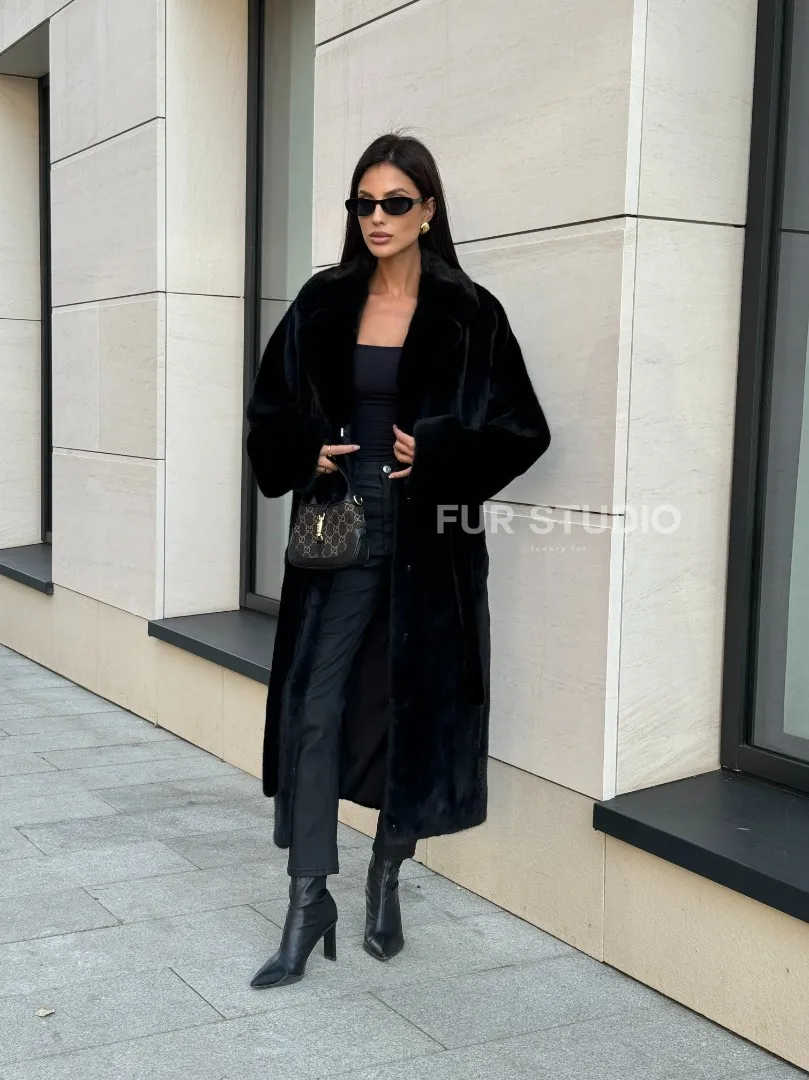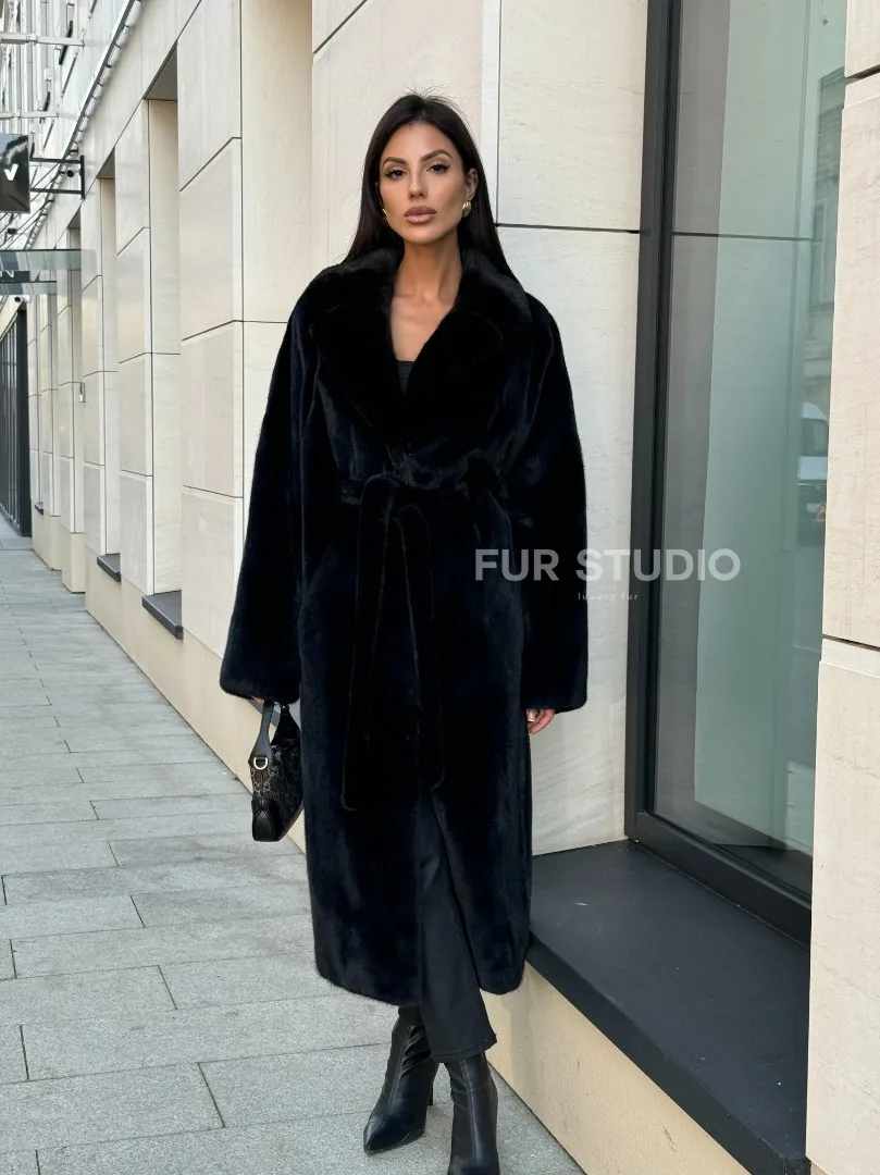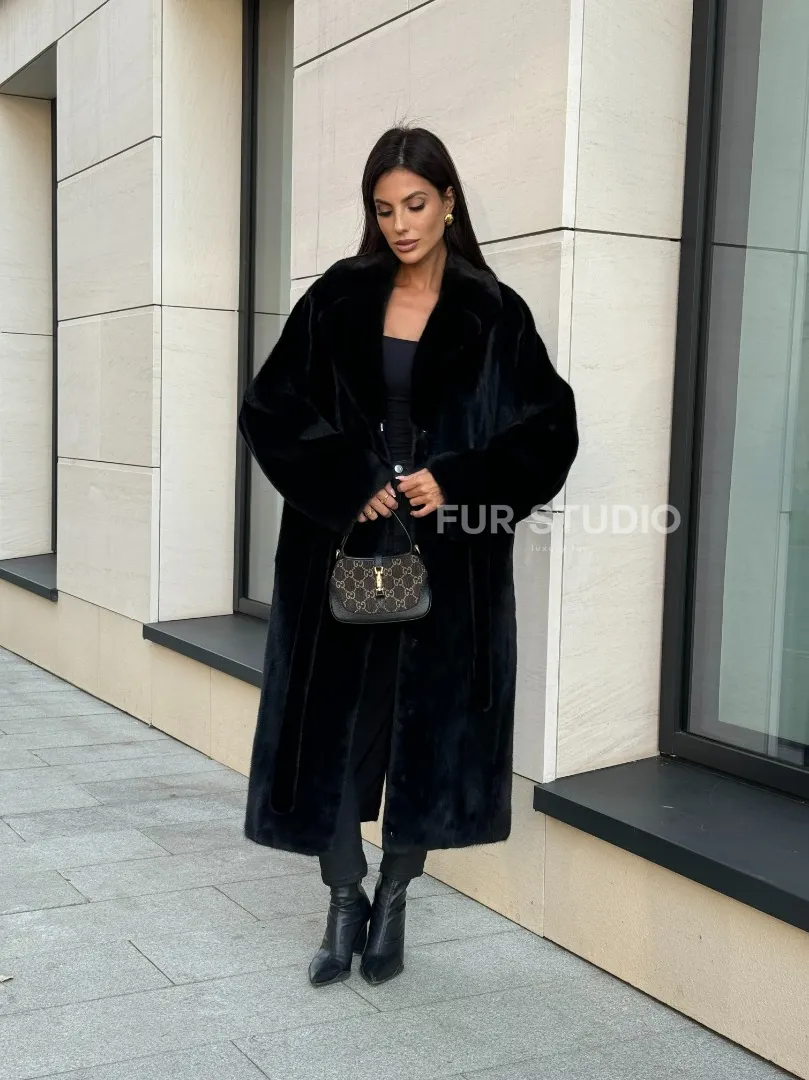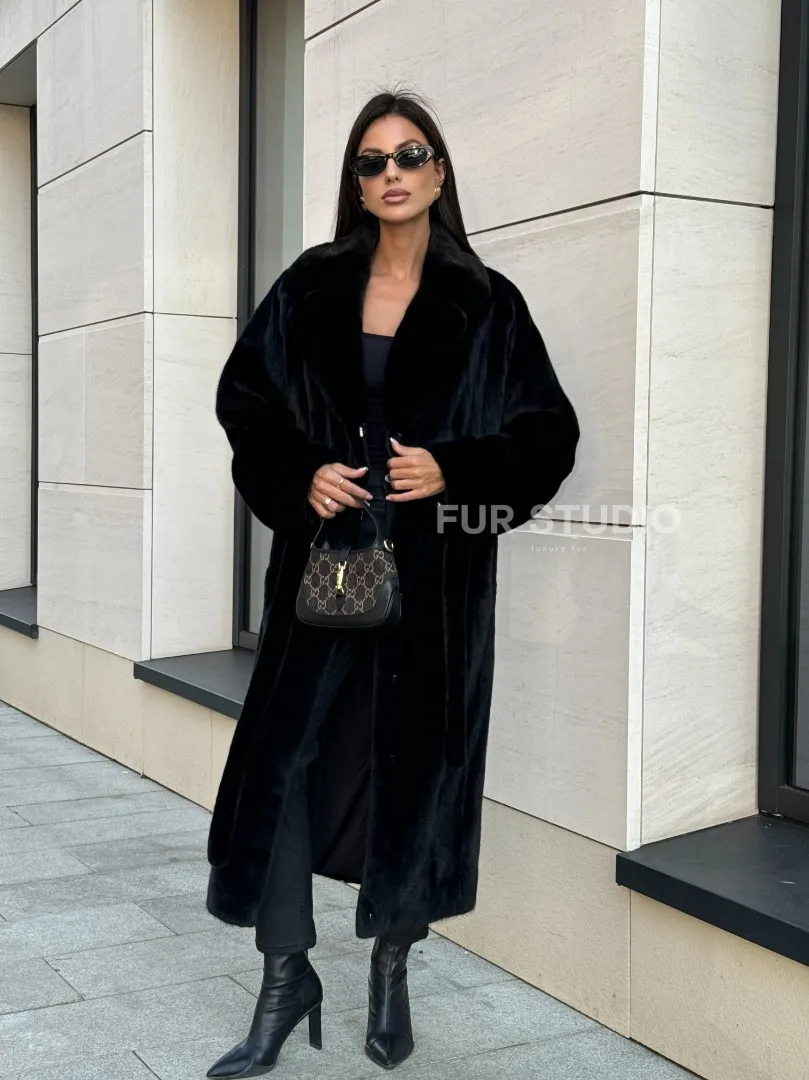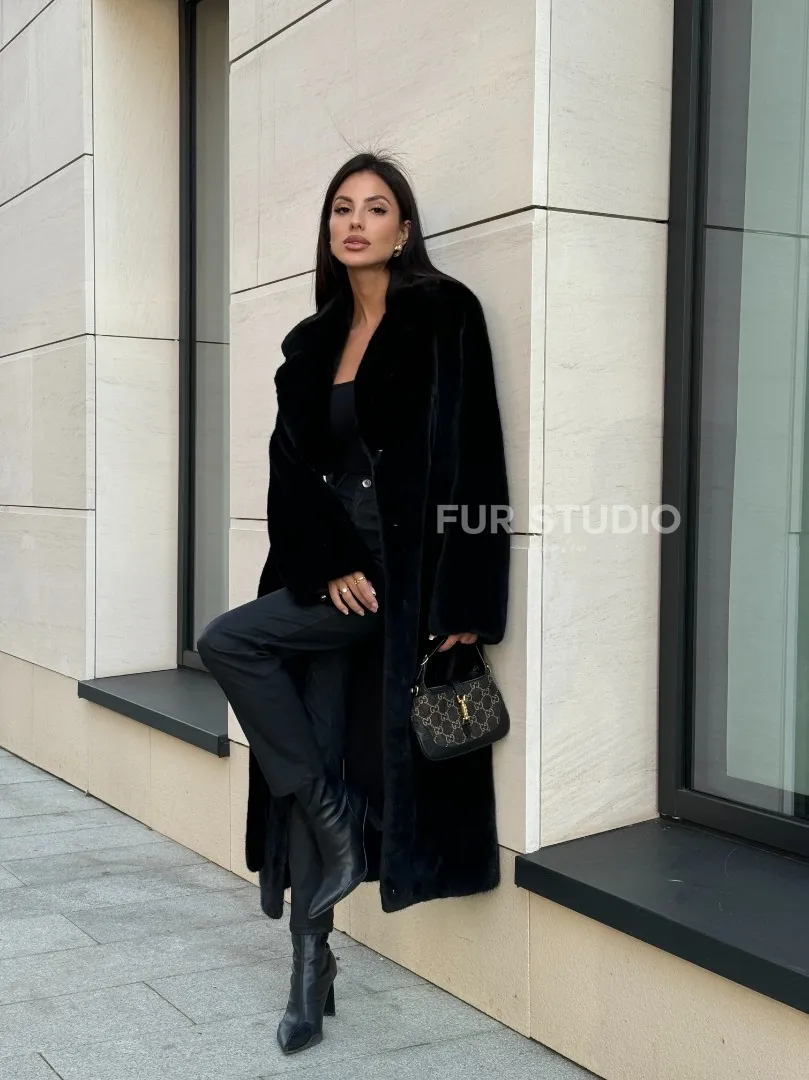 Мех данной шубы норка Blackglama , цвет черный. Предлагается в размерах от 42 до 54. Длина модели 115-120 см, что выгодно подчеркивает фигуру девушек. Эта модель идеально подойдет для девушек и женщин, предпочитающих роскошные натуральные меха.