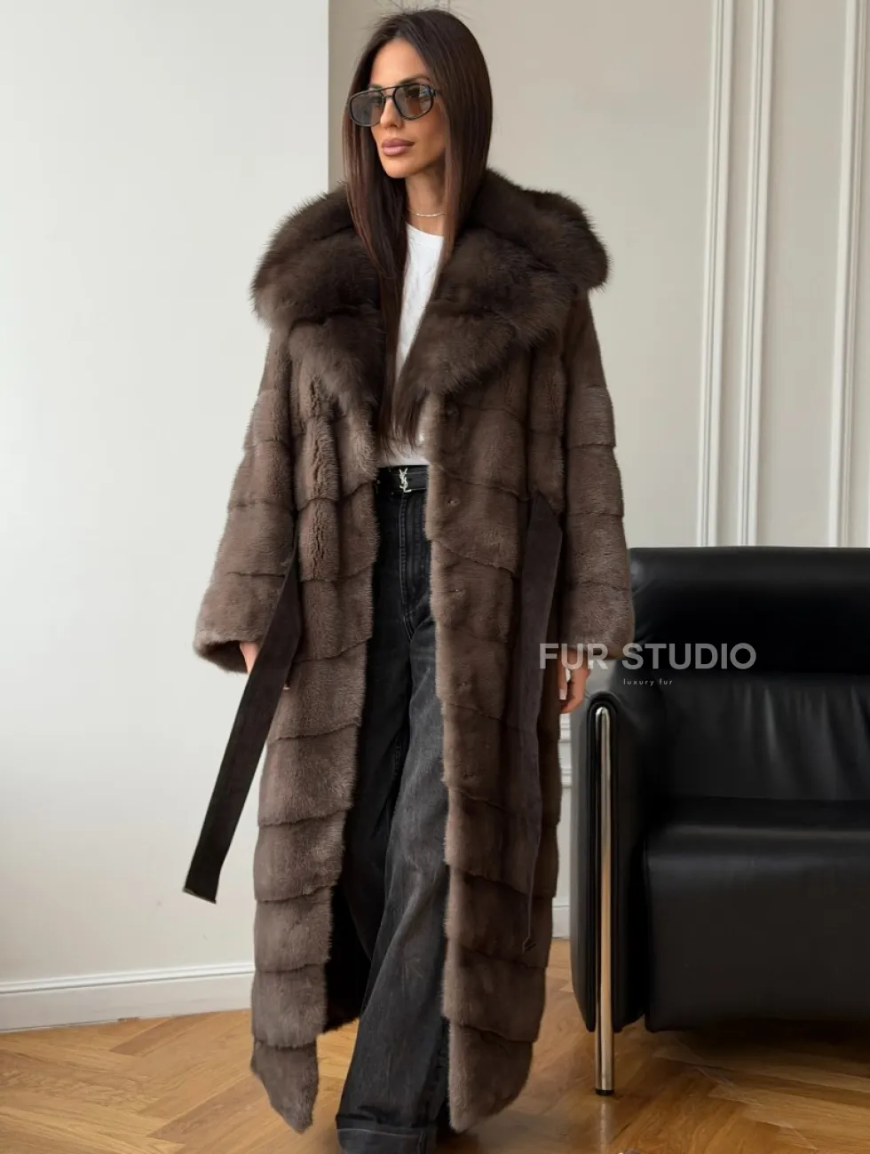Мех данной шубы аукционная норка, цвет коричневый. Предлагается в размерах от 42 до 48. Длина модели 125-130 см, что выгодно подчеркивает фигуру девушек. Эта модель идеально подойдет для девушек и женщин, предпочитающих роскошные натуральные меха.