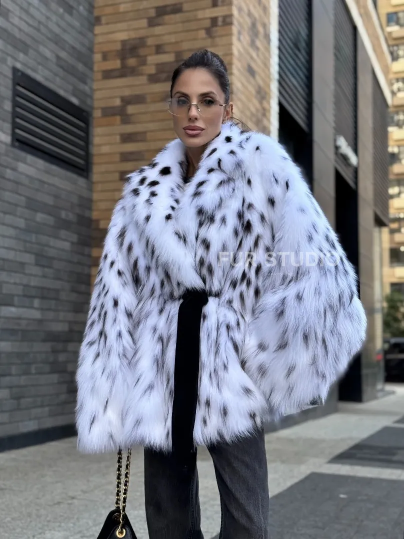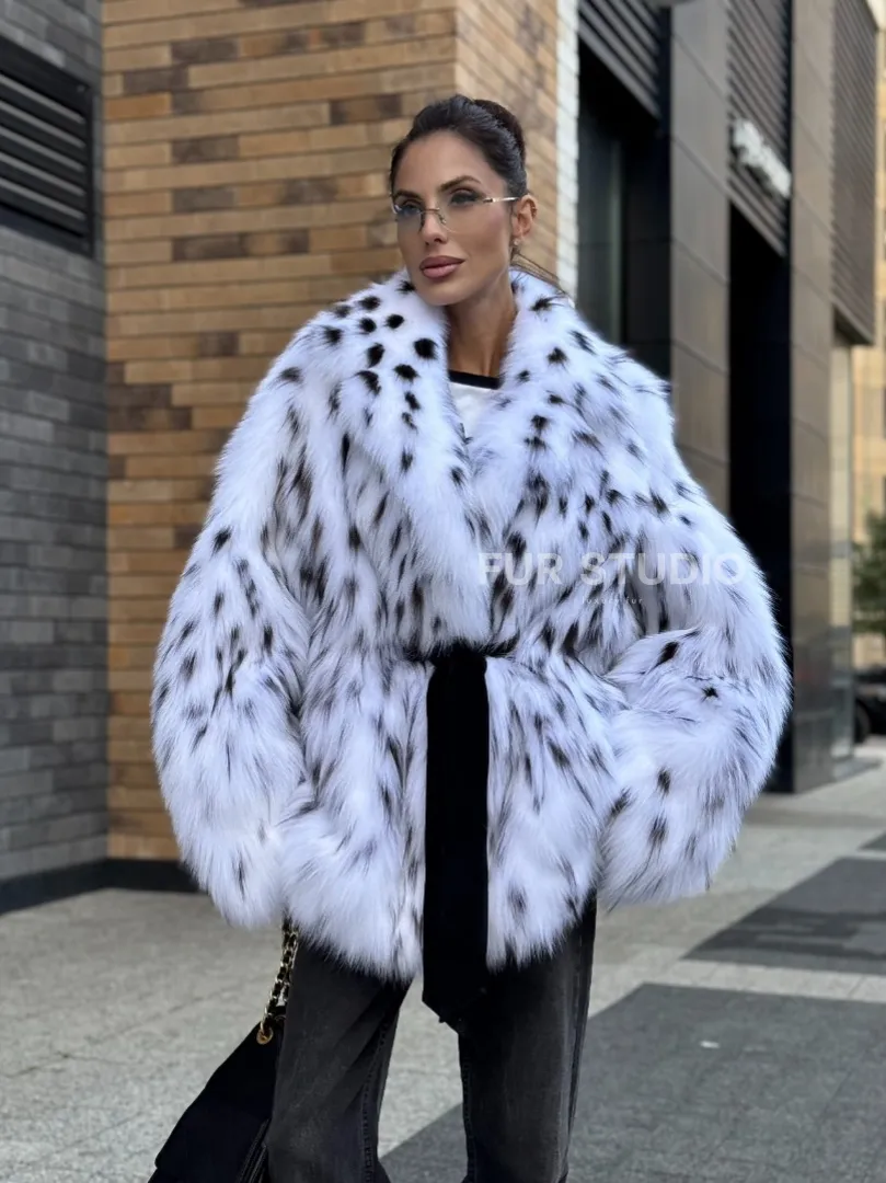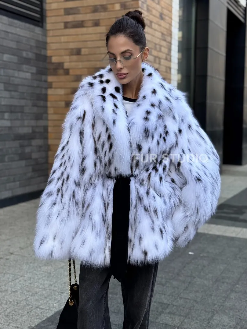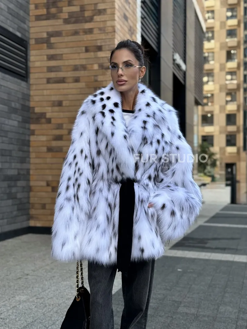 Шуба - Белая лиса с вшитыми пятнами из рыси PREMIUM качество, фасон «летучая мышь» легкая и стильная, созданная специально для уверенной в сете активной роскошной женщины. Даже в длине до середины бедра шуба из лисы подарит уют и тепло в любую погоду: в ней комфортно прогуливаться в морозные и ветреные дни, причем не только от такси до ресторана.