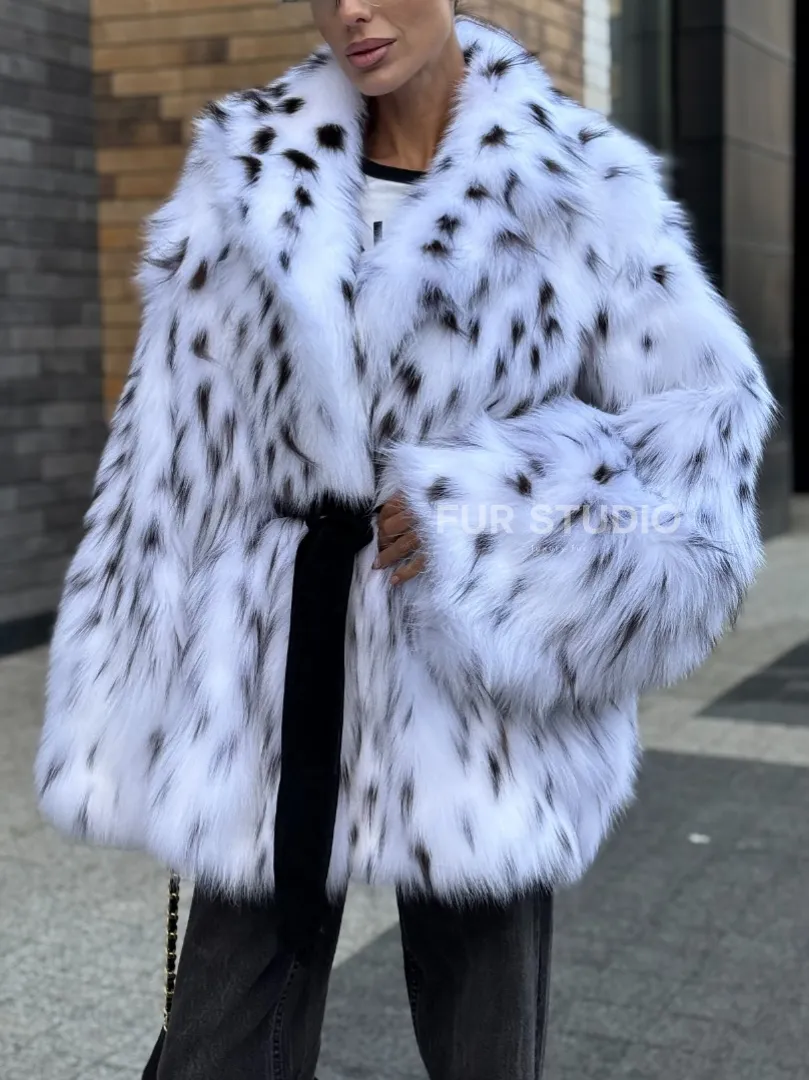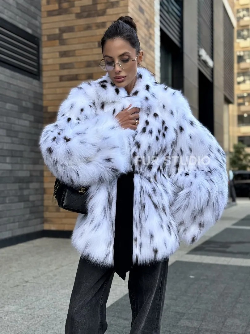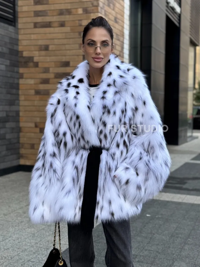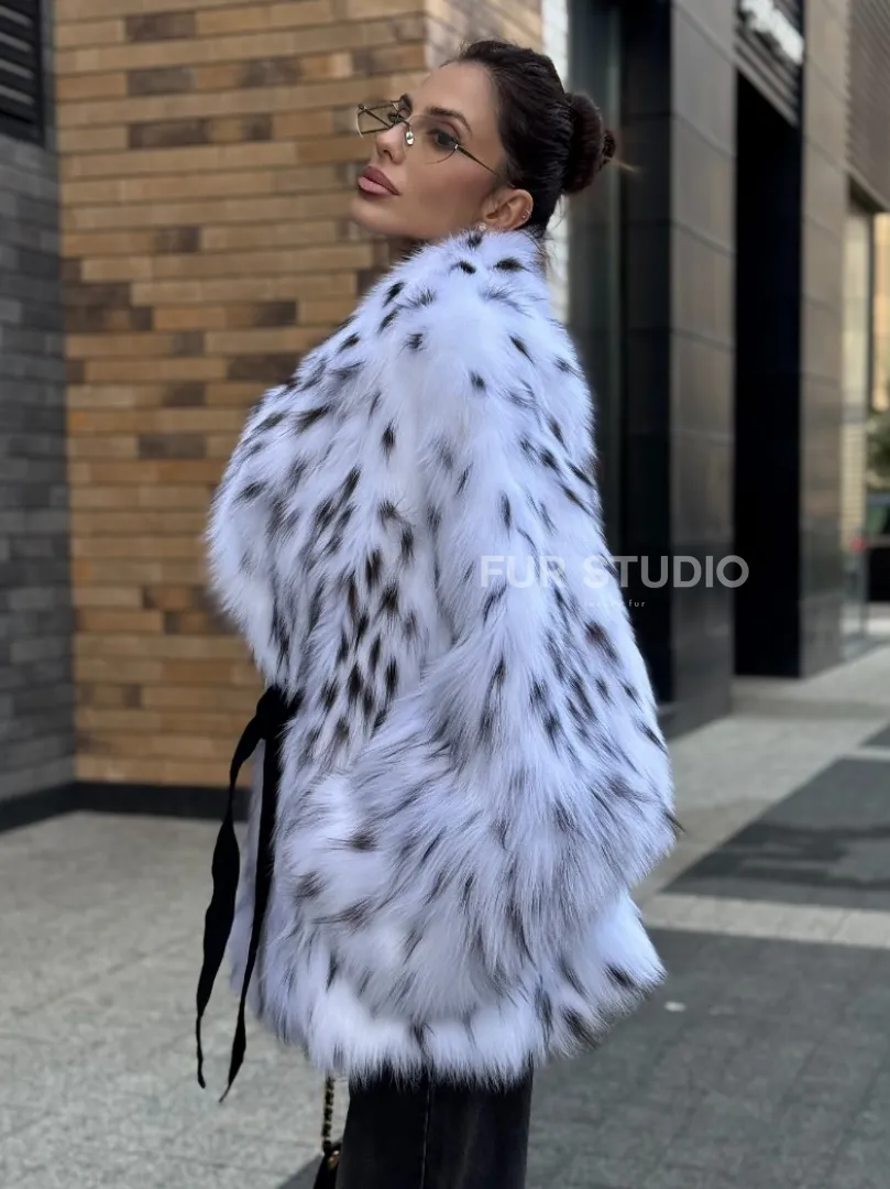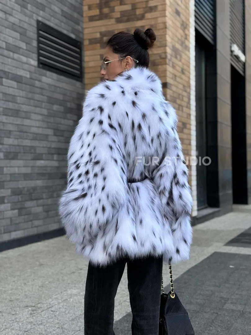 Шуба - Белая лиса с вшитыми пятнами из рыси PREMIUM качество, фасон «летучая мышь» легкая и стильная, созданная специально для уверенной в сете активной роскошной женщины. Даже в длине до середины бедра шуба из лисы подарит уют и тепло в любую погоду: в ней комфортно прогуливаться в морозные и ветреные дни, причем не только от такси до ресторана.