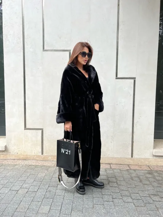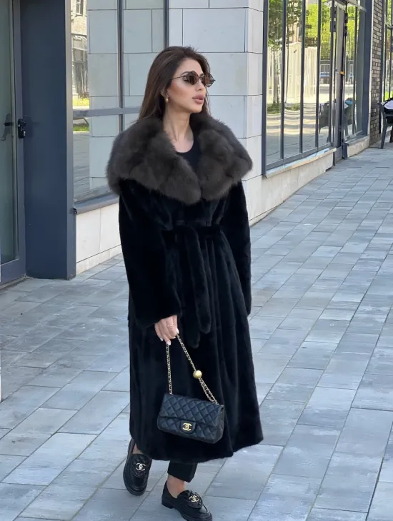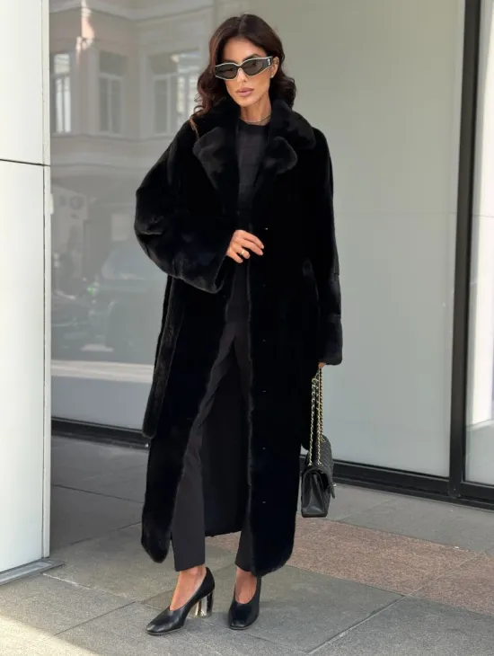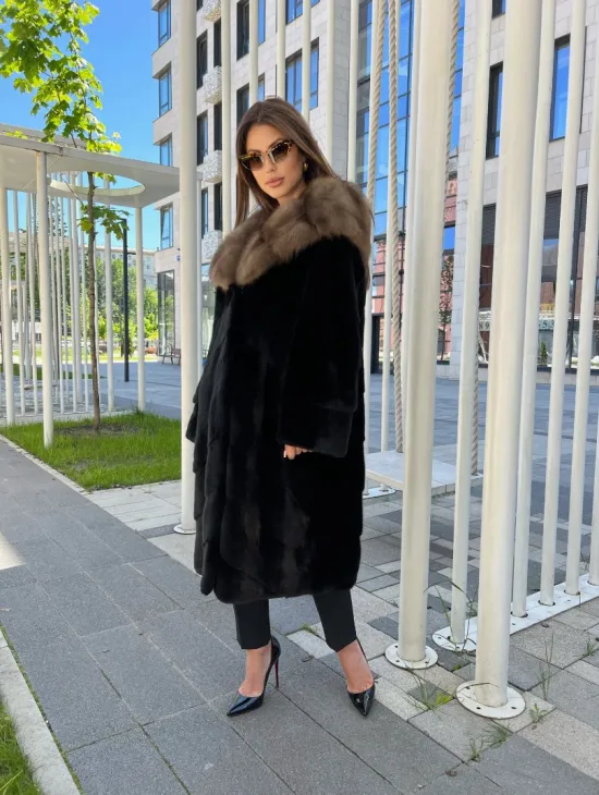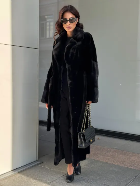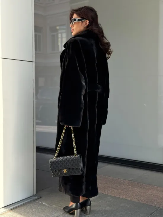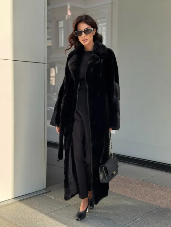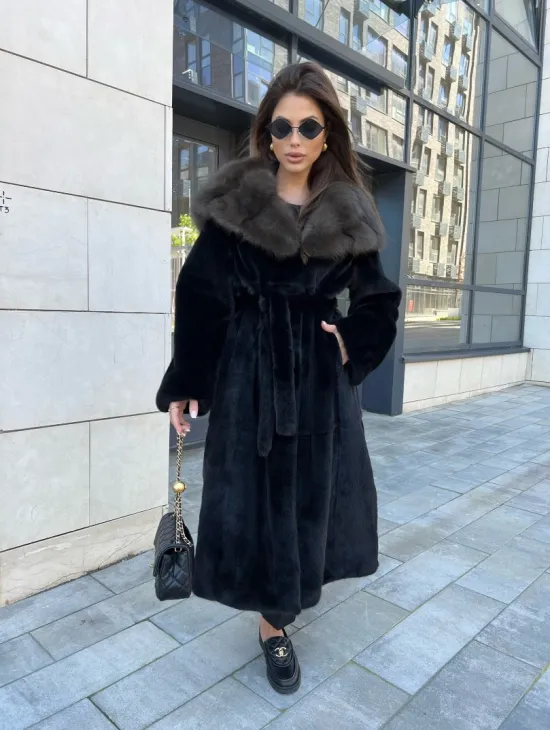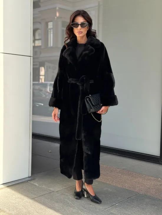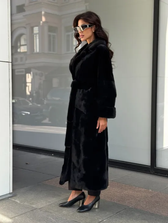 Мех данной шубы норка Blackglama , цвет черный. Предлагается в размерах от 48 до 52. Длина модели 100-105 см, что выгодно подчеркивает фигуру девушек. Эта модель идеально подойдет для девушек и женщин, предпочитающих роскошные натуральные меха.