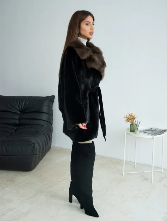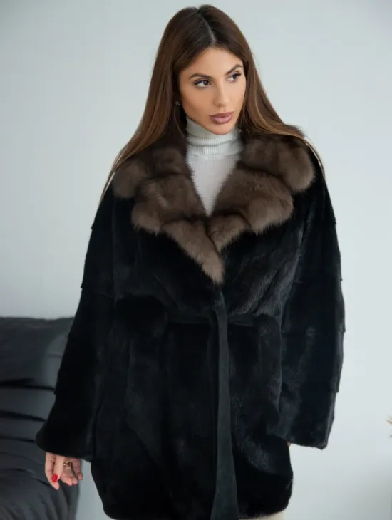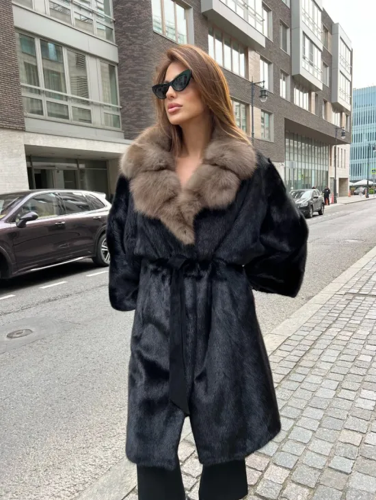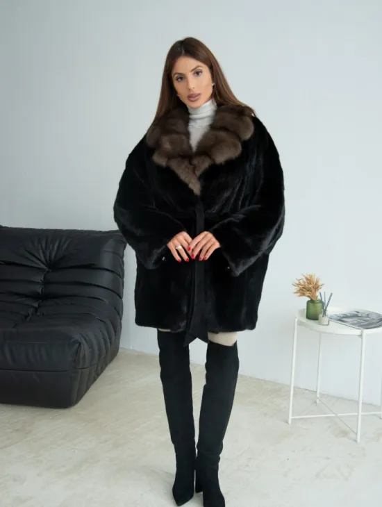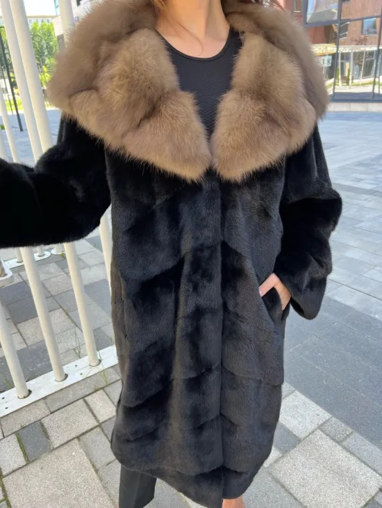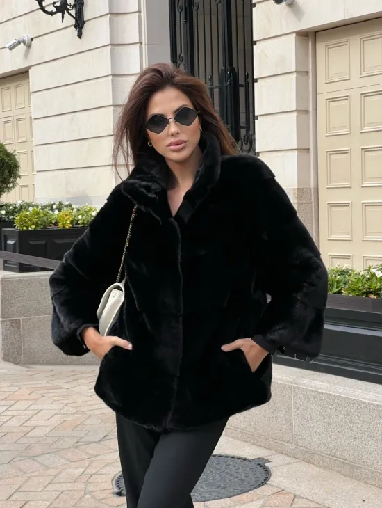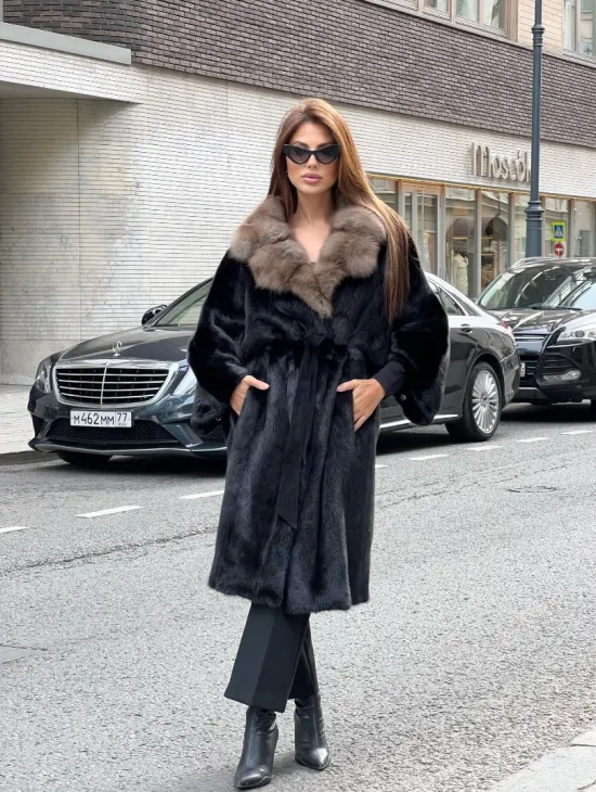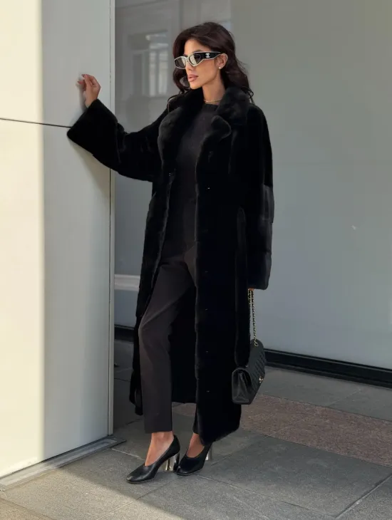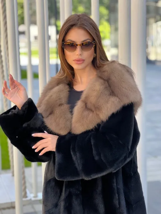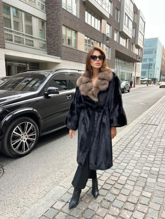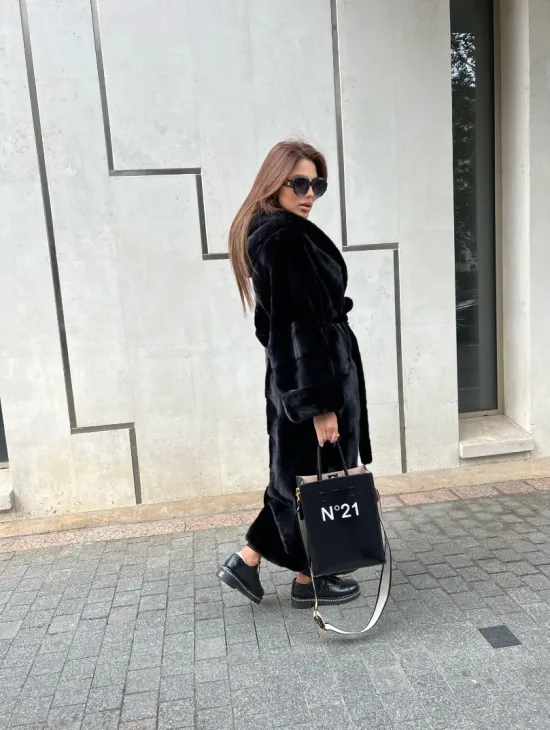 Мех данной шубы норка Blackglama , цвет черный. Предлагается в размерах от 48 до 52. Длина модели 100-105 см, что выгодно подчеркивает фигуру девушек. Эта модель идеально подойдет для девушек и женщин, предпочитающих роскошные натуральные меха.