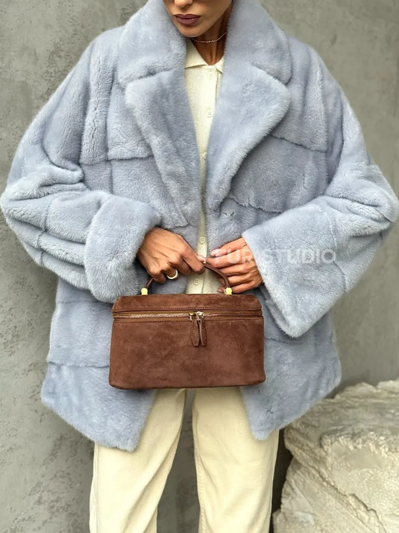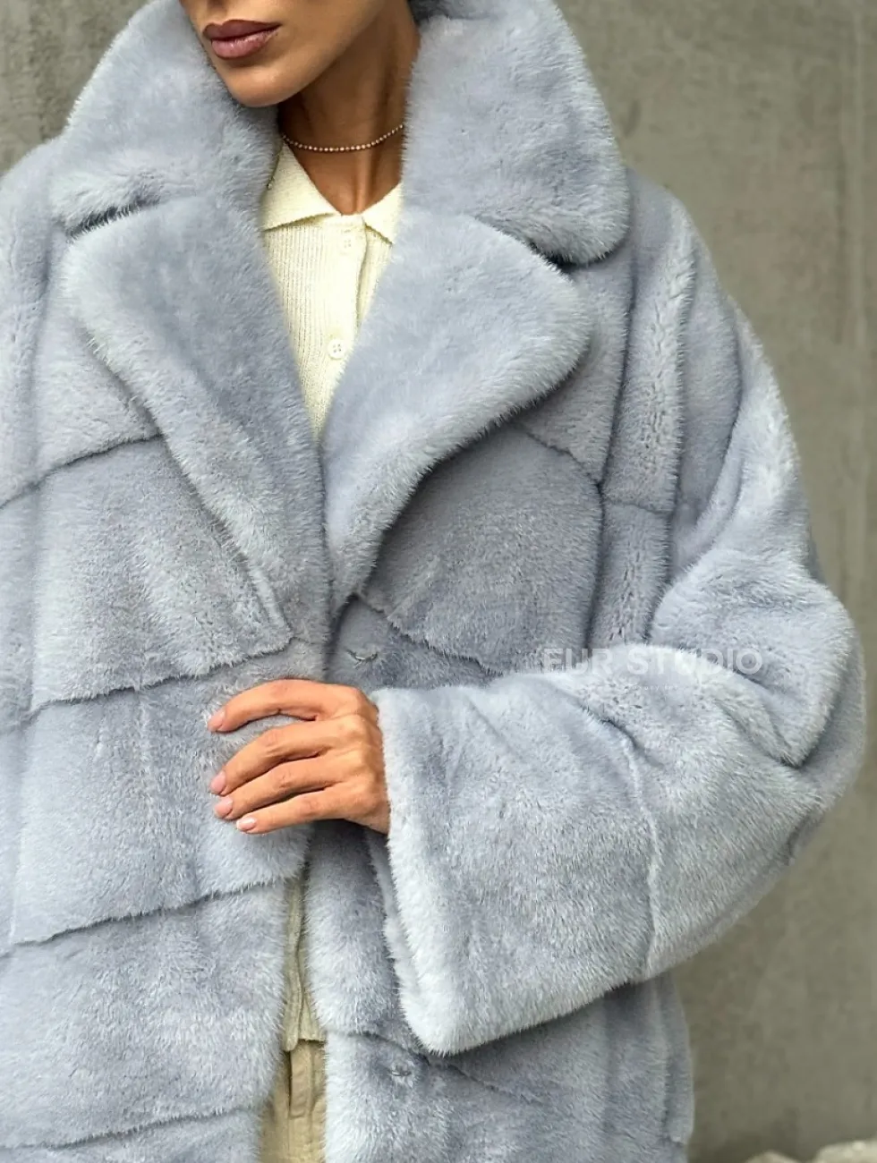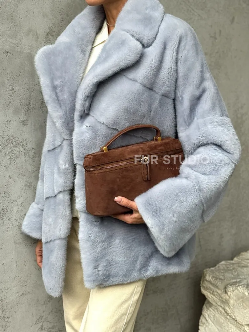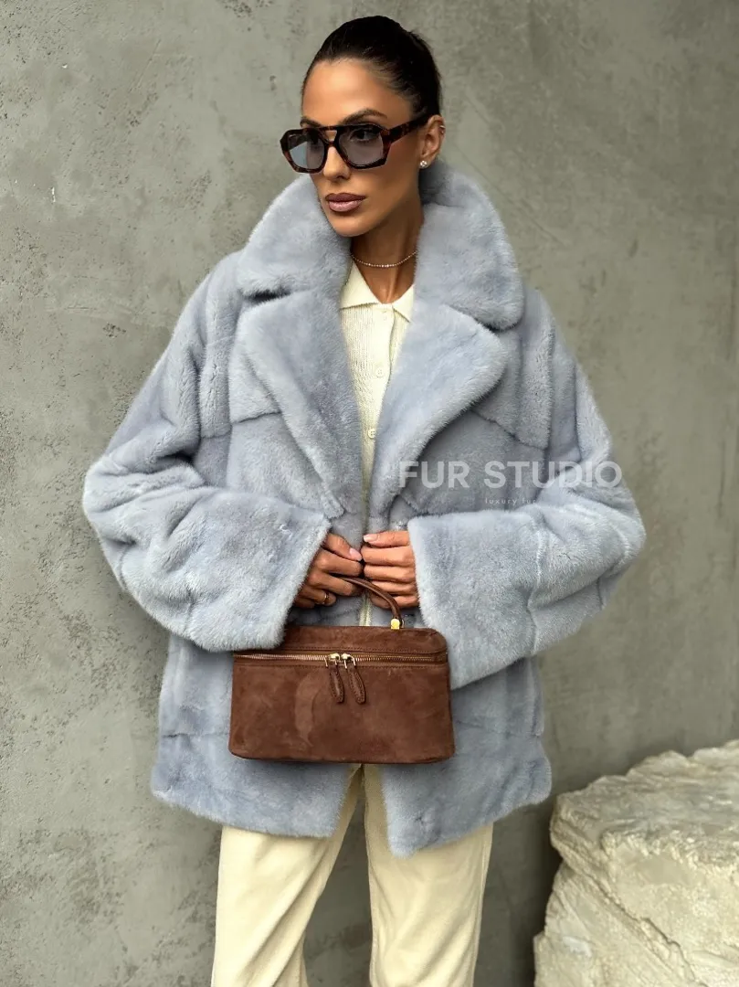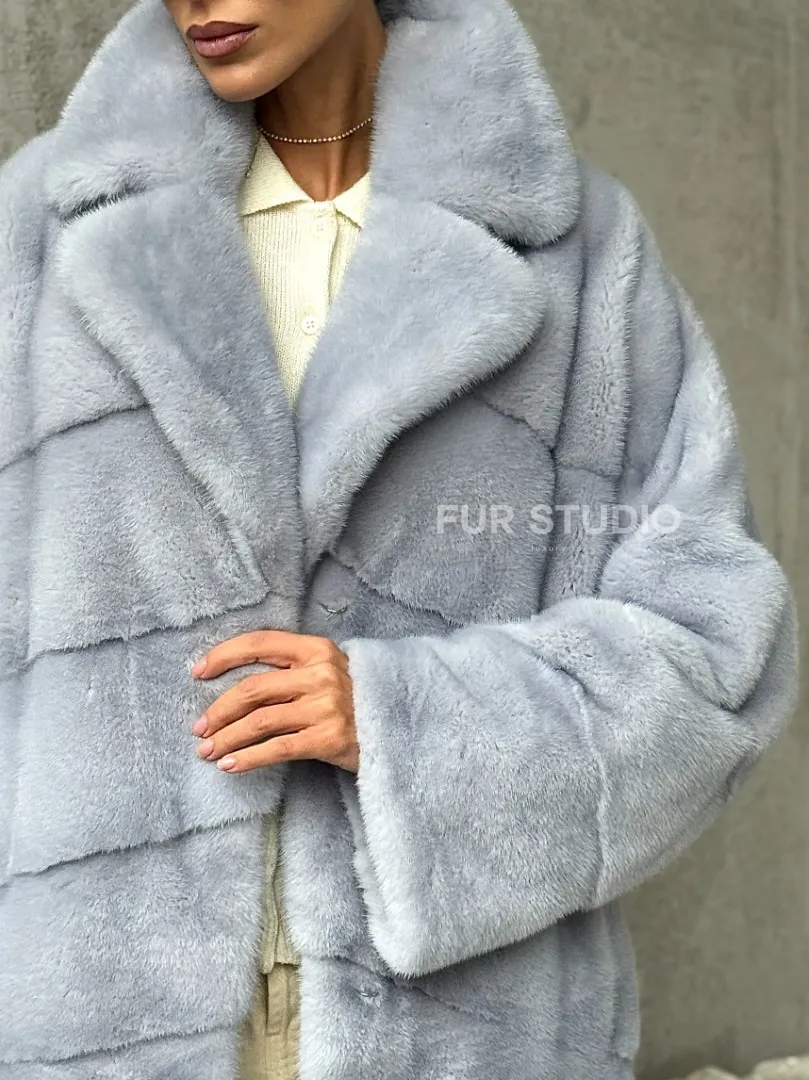 Мех данной шубы аукционная норка , цвет голубой. Предлагается в размерах от 42 до 52. Длина модели 65-70 см, что выгодно подчеркивает фигуру девушек. Эта модель идеально подойдет для девушек и женщин, предпочитающих роскошные натуральные меха.