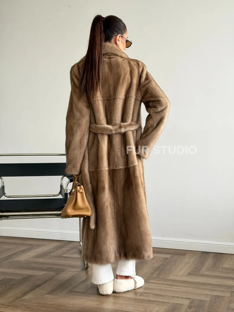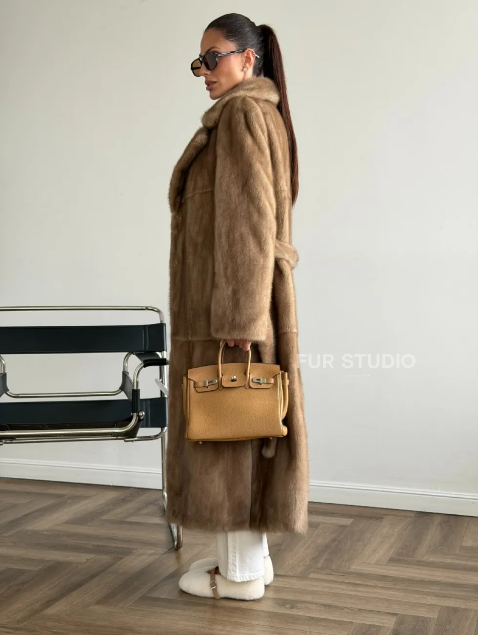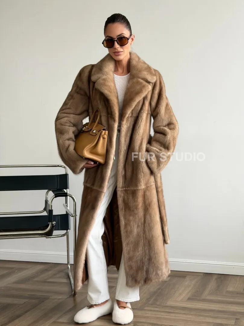 Мех данной шубы аукционная норка , цвет бежевый. Предлагается в размерах от 42 до 50. Длина модели 115-120 см, что выгодно подчеркивает фигуру девушек. Эта модель идеально подойдет для девушек и женщин, предпочитающих роскошные натуральные меха.