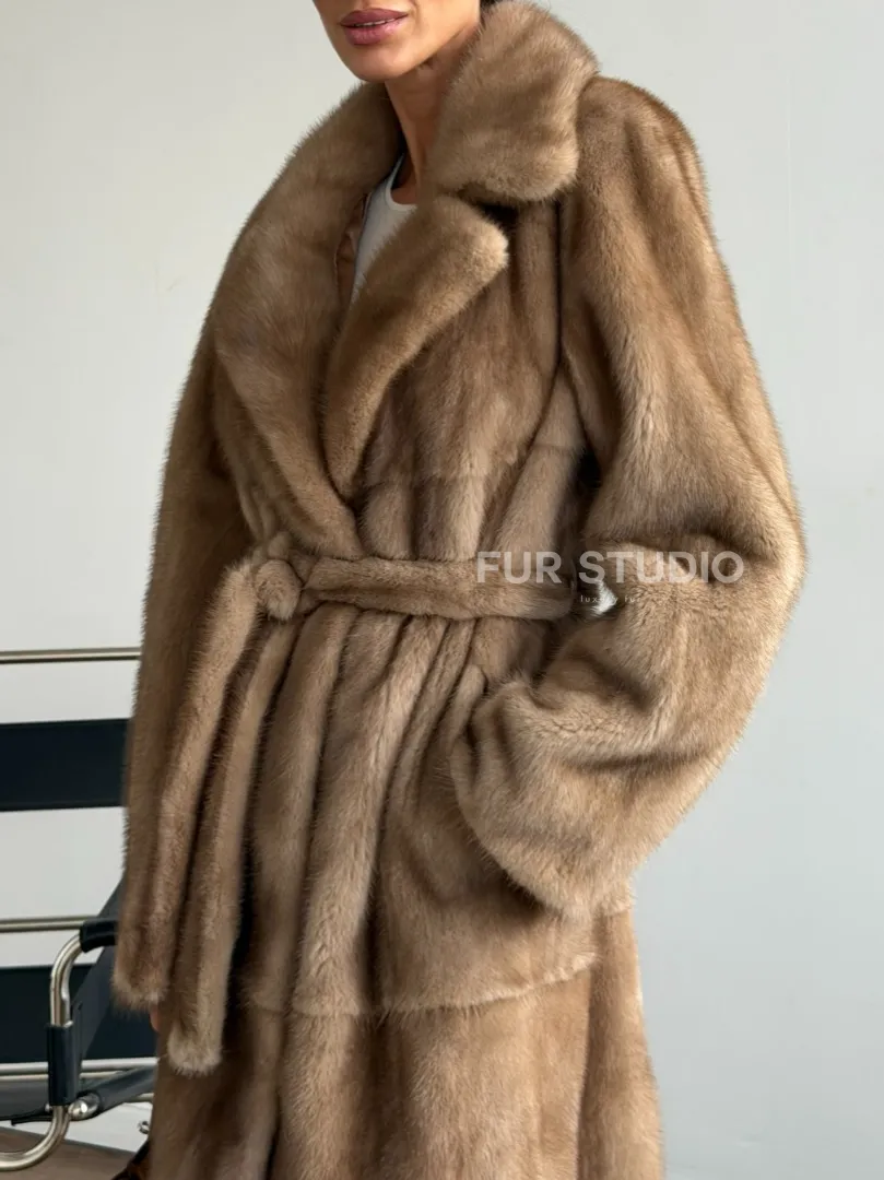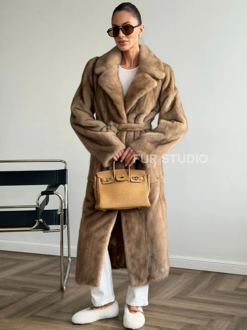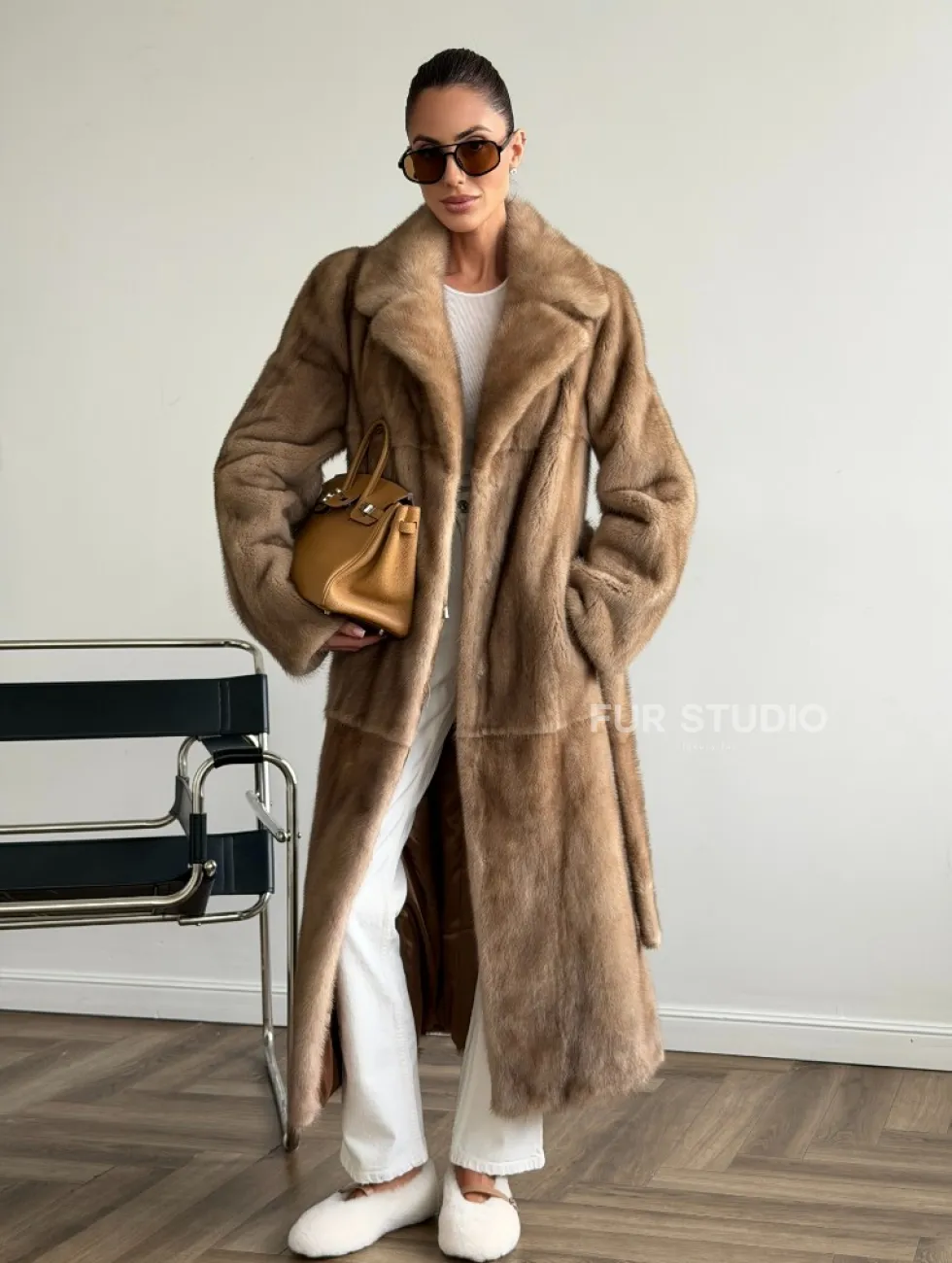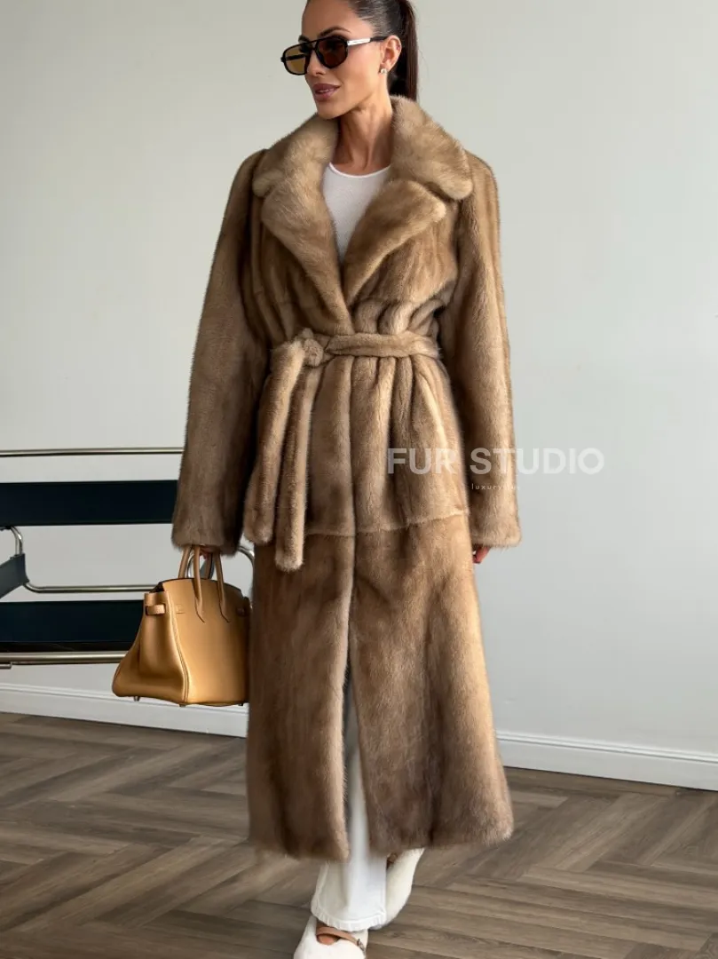 Мех данной шубы аукционная норка , цвет бежевый. Предлагается в размерах от 42 до 50. Длина модели 115-120 см, что выгодно подчеркивает фигуру девушек. Эта модель идеально подойдет для девушек и женщин, предпочитающих роскошные натуральные меха.