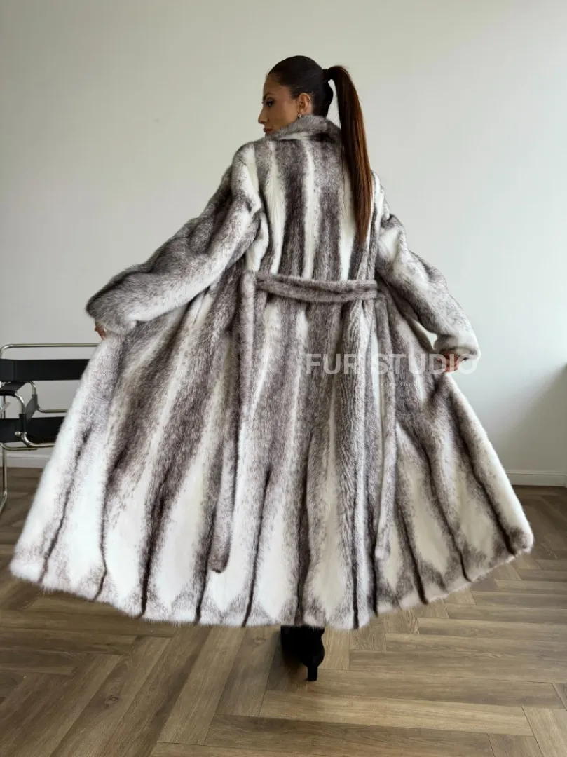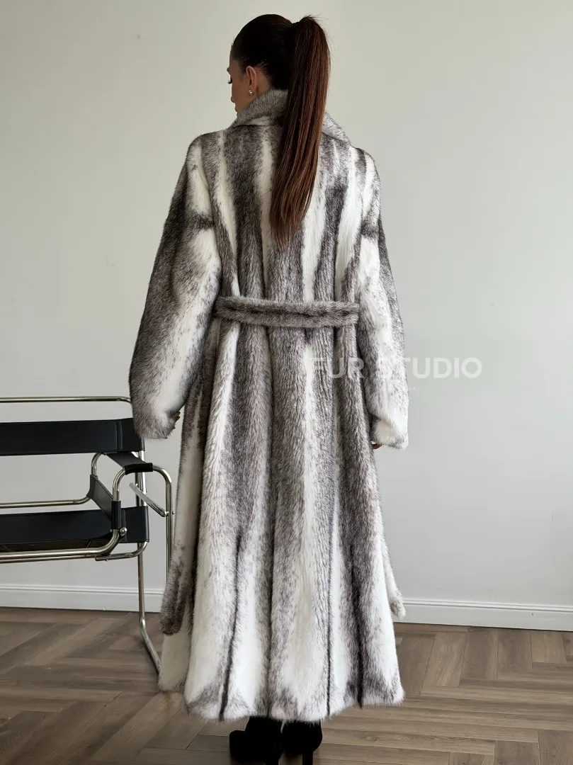 Мех данной шубы аукционная норка, цвет белый. Предлагается в размерах от 44 до 50. Длина модели 125-130 см, что выгодно подчеркивает фигуру девушек. Эта модель идеально подойдет для девушек и женщин, предпочитающих роскошные натуральные меха.