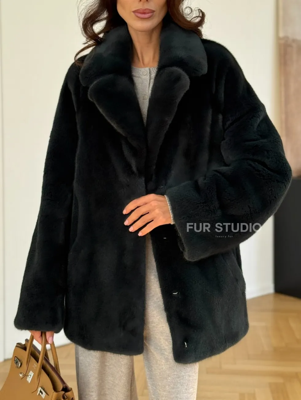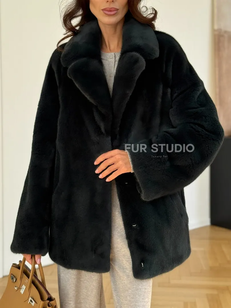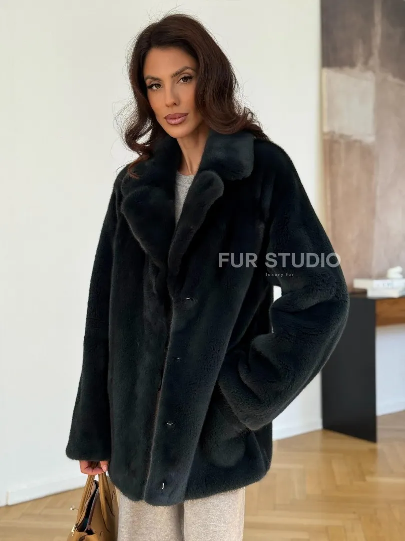 Мех данной шубы аукционная норка, цвет зеленый. Предлагается в размерах от 42 до 50. Длина модели 65-70 см, что выгодно подчеркивает фигуру девушек. Эта модель идеально подойдет для девушек и женщин, предпочитающих роскошные натуральные меха.