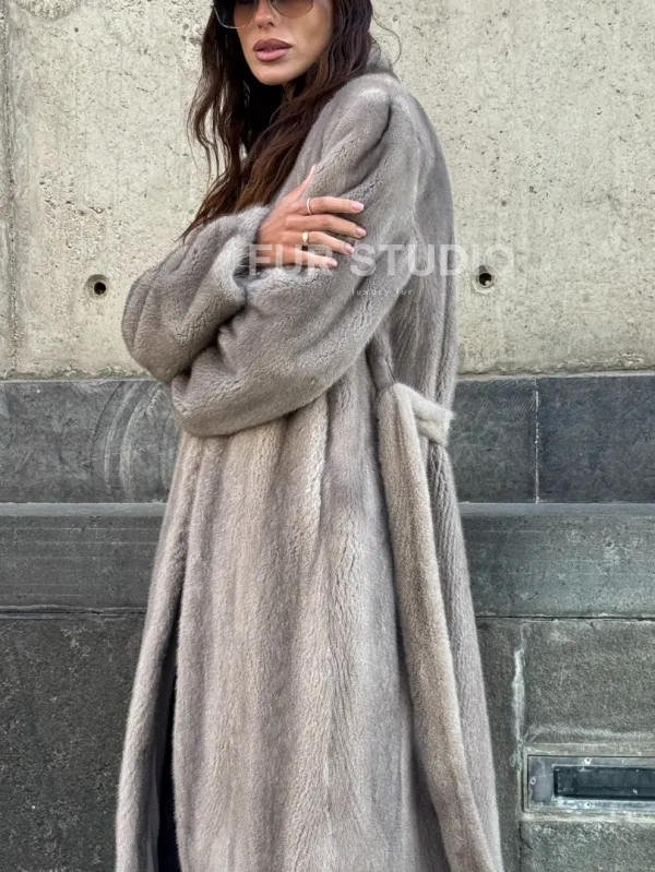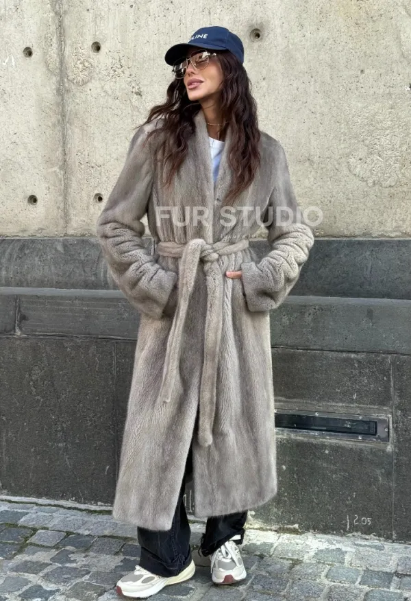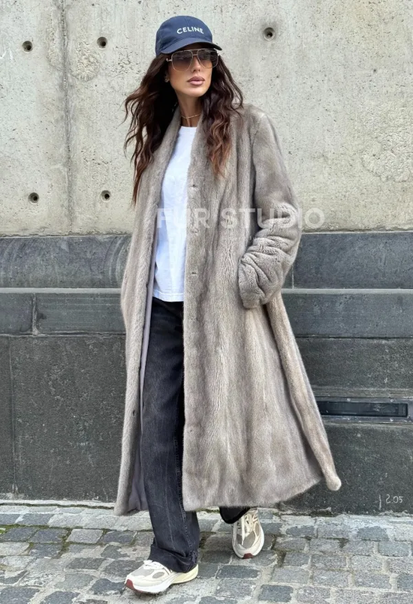 Мех данной шубы аукционная норка, цвет серый. Предлагается в размерах от 42 до 50. Длина модели 115-120 см, что выгодно подчеркивает фигуру девушек. Эта модель идеально подойдет для девушек и женщин, предпочитающих роскошные натуральные меха.