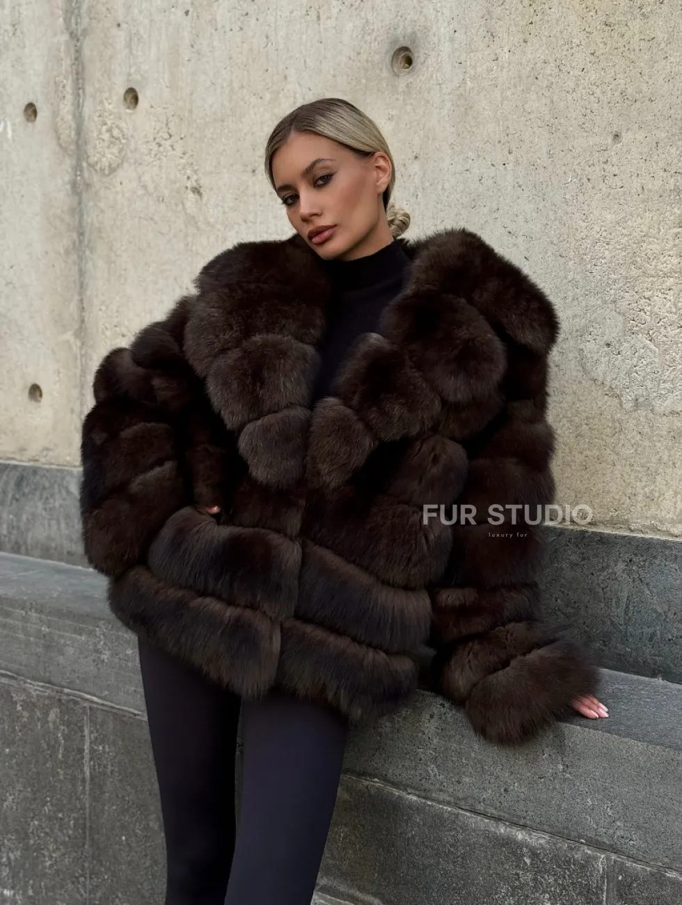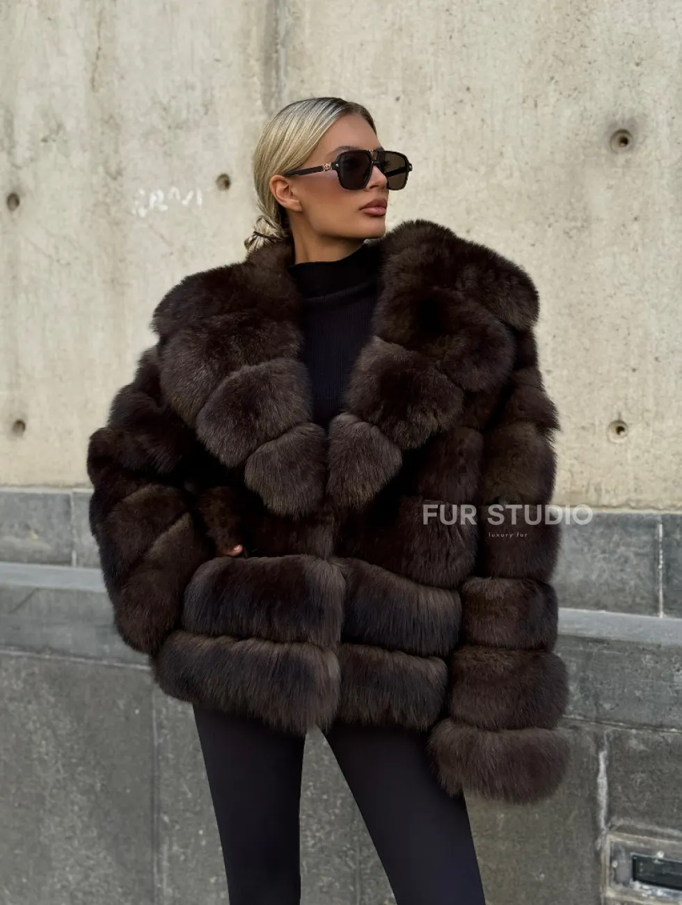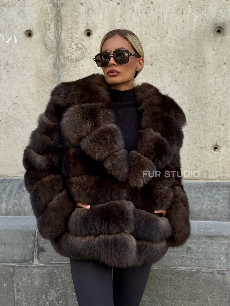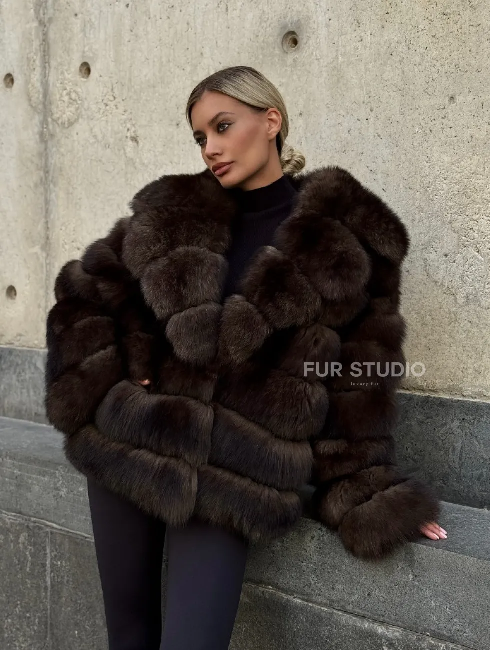 Мех данной шубы финский песец, цвет коричневый. Предлагается в размерах от 42 до 48. Длина модели 60-65 см, что выгодно подчеркивает фигуру девушек. Эта модель идеально подойдет для девушек и женщин, предпочитающих роскошные натуральные меха.