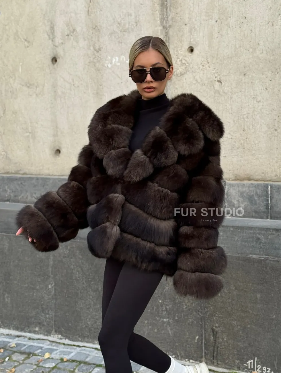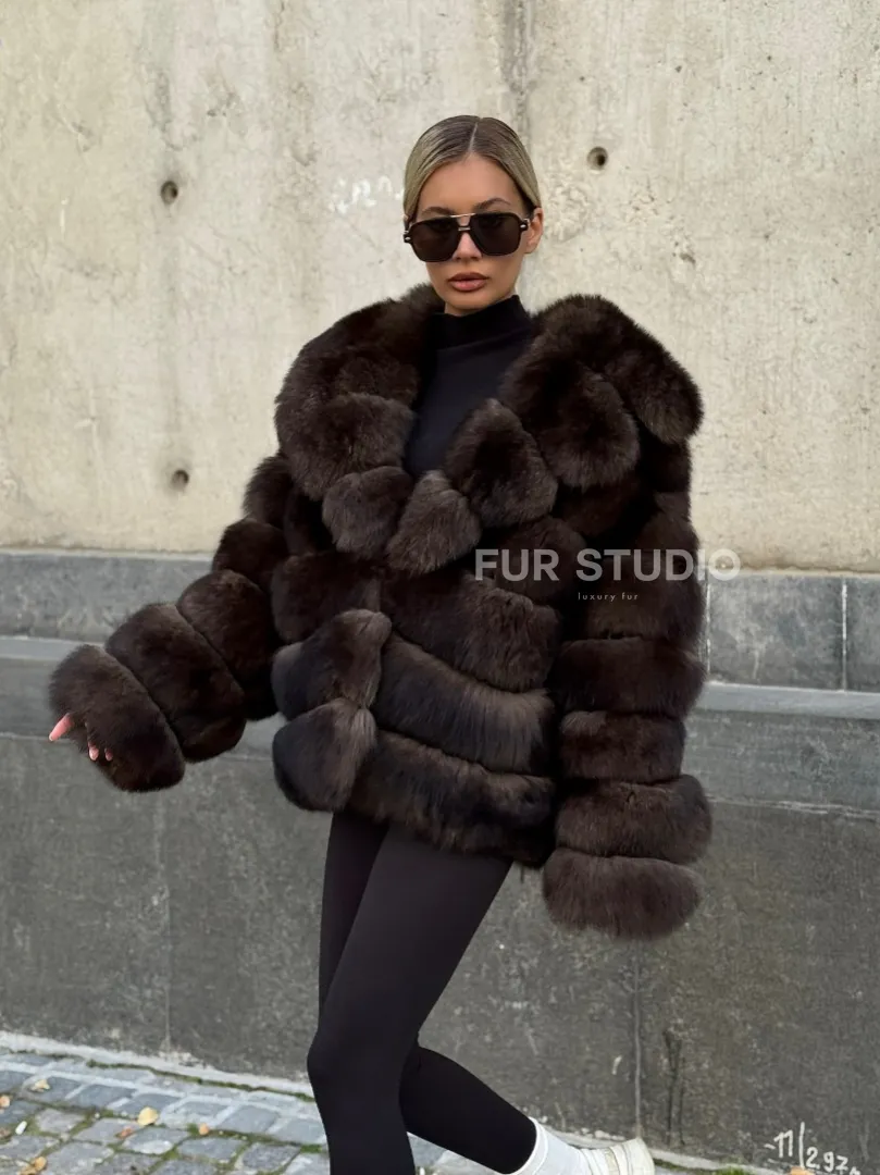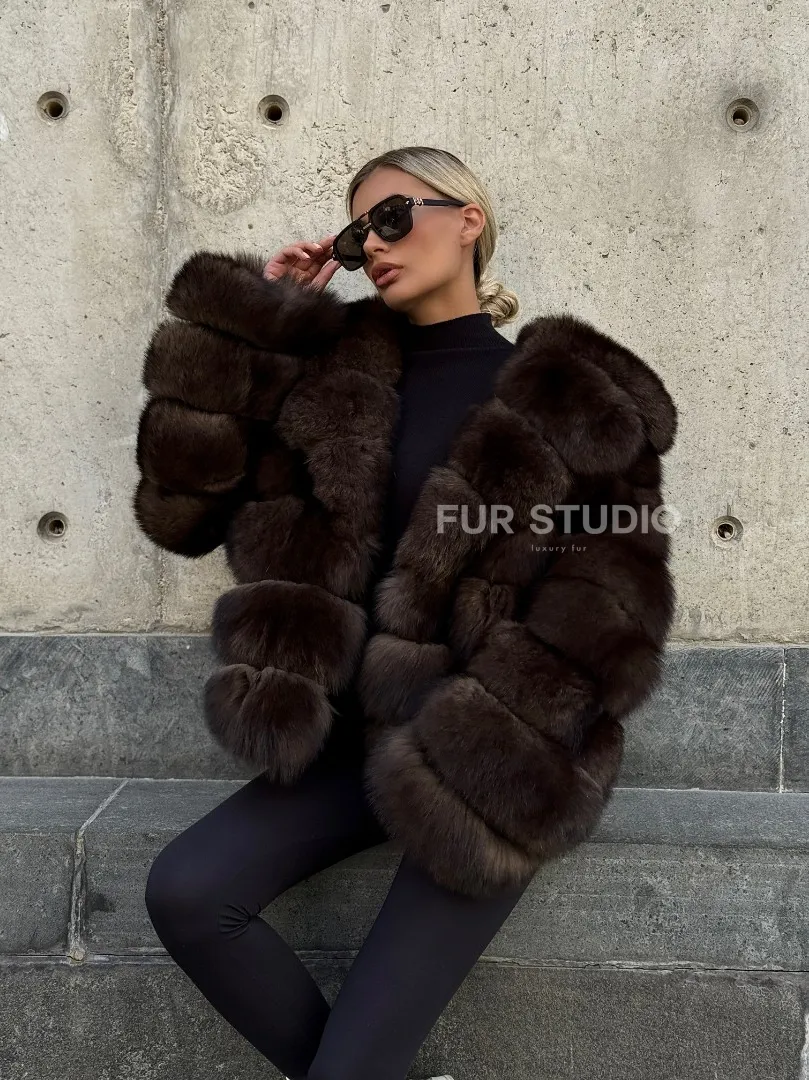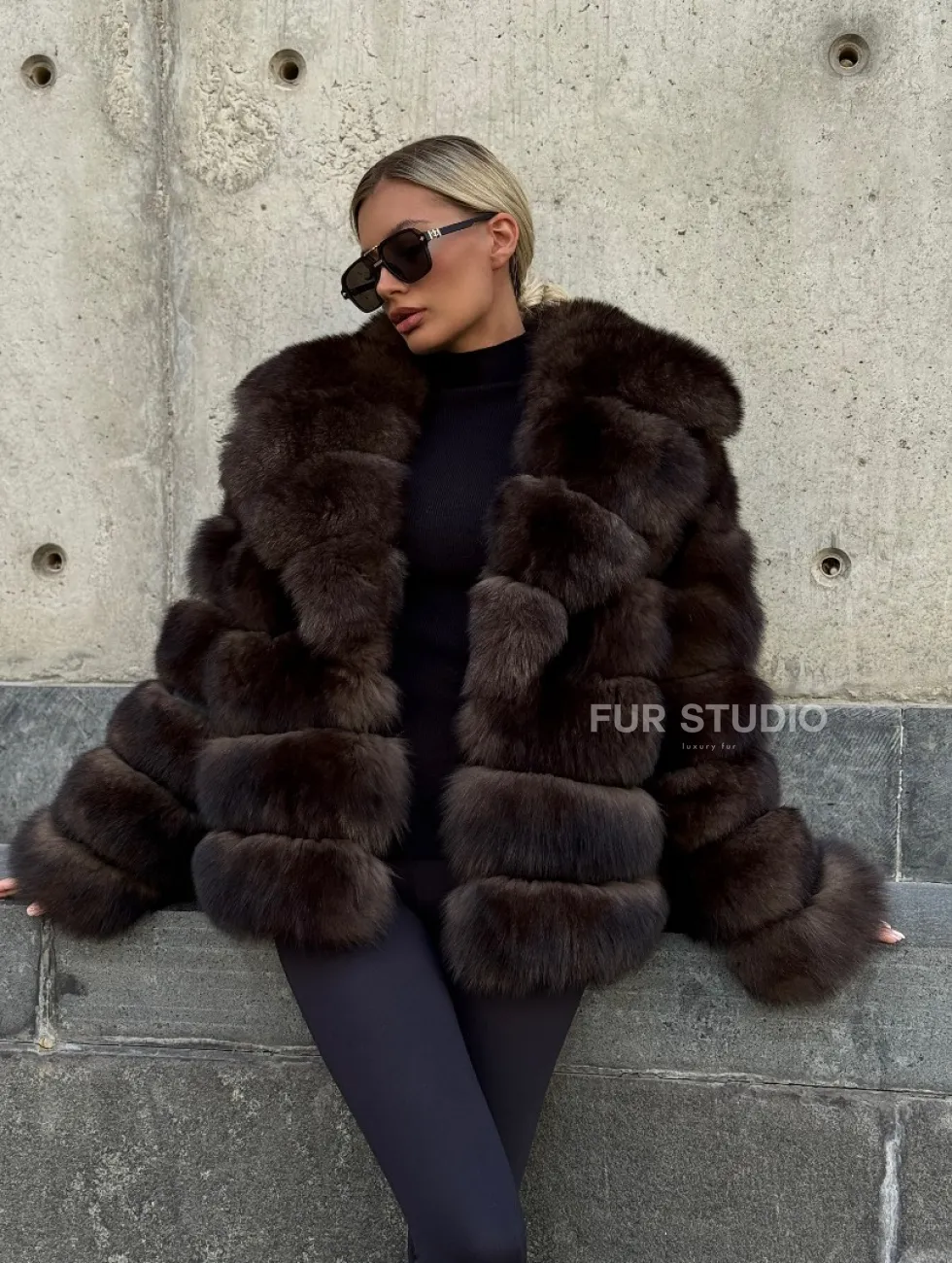 Мех данной шубы финский песец, цвет коричневый. Предлагается в размерах от 42 до 48. Длина модели 60-65 см, что выгодно подчеркивает фигуру девушек. Эта модель идеально подойдет для девушек и женщин, предпочитающих роскошные натуральные меха.