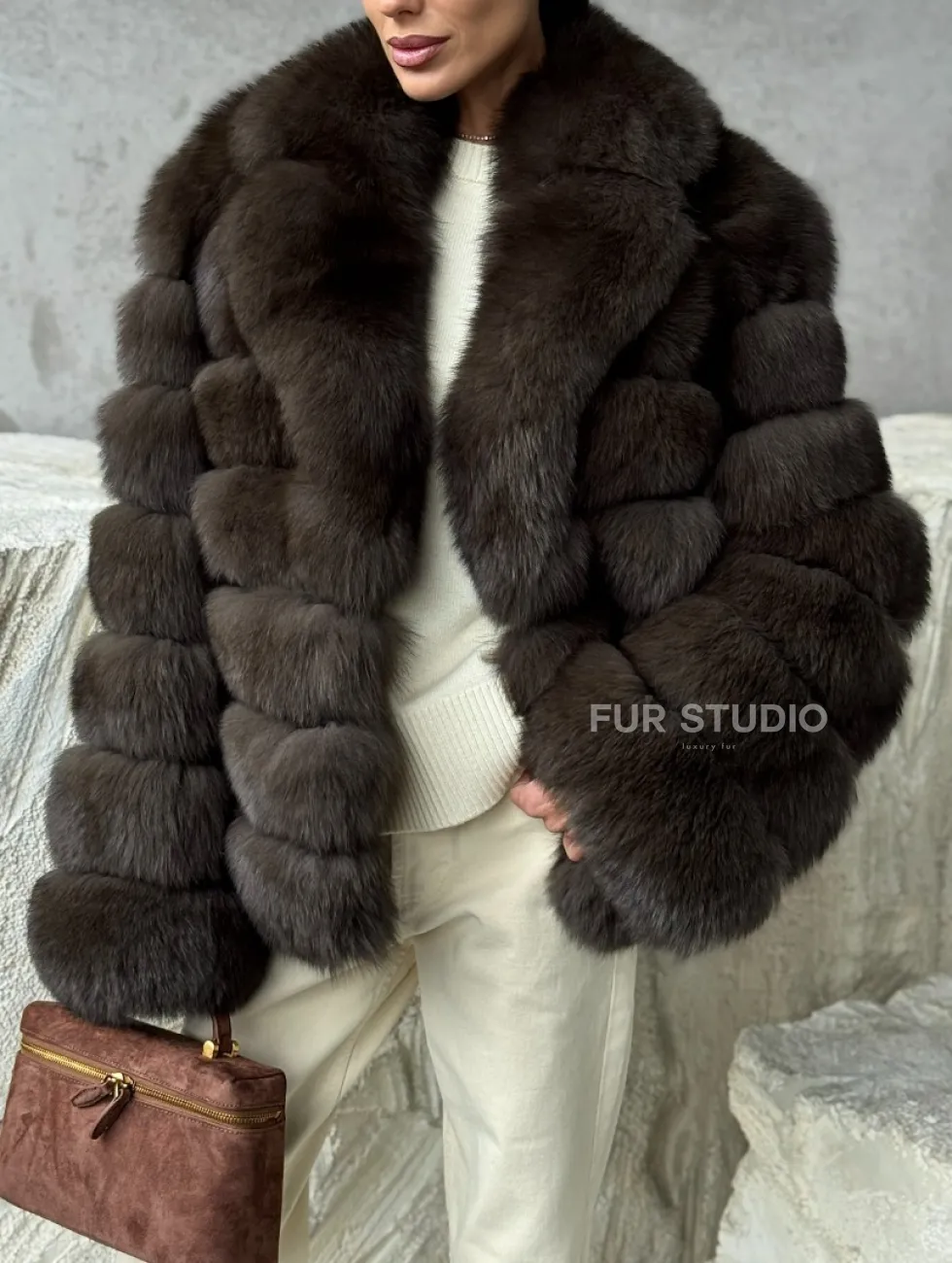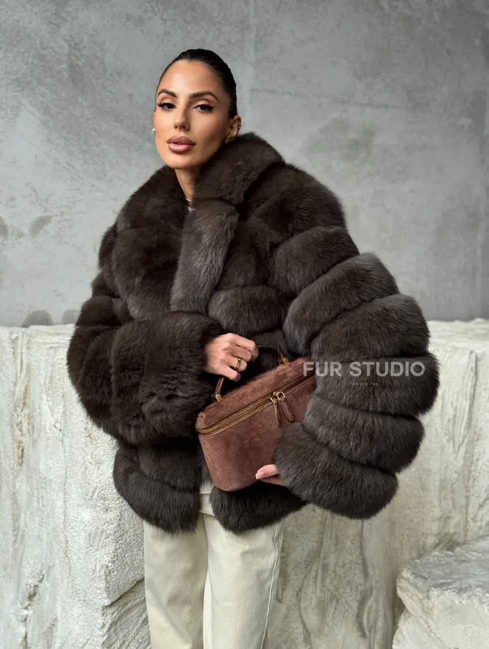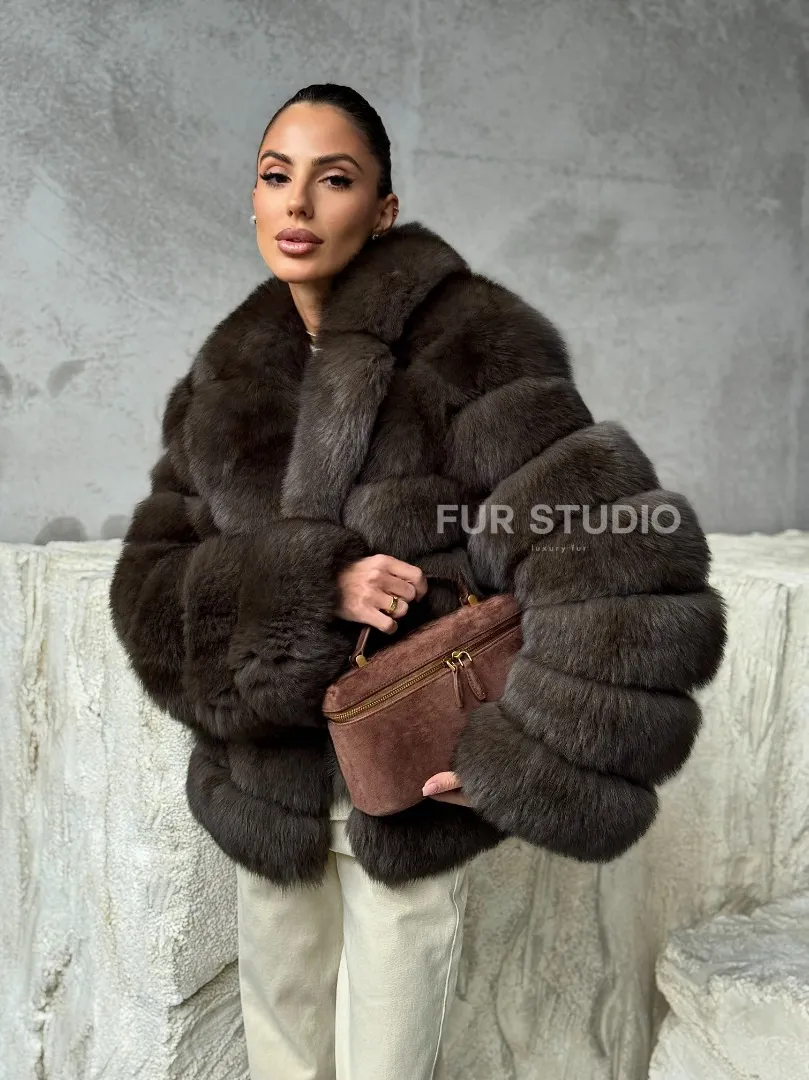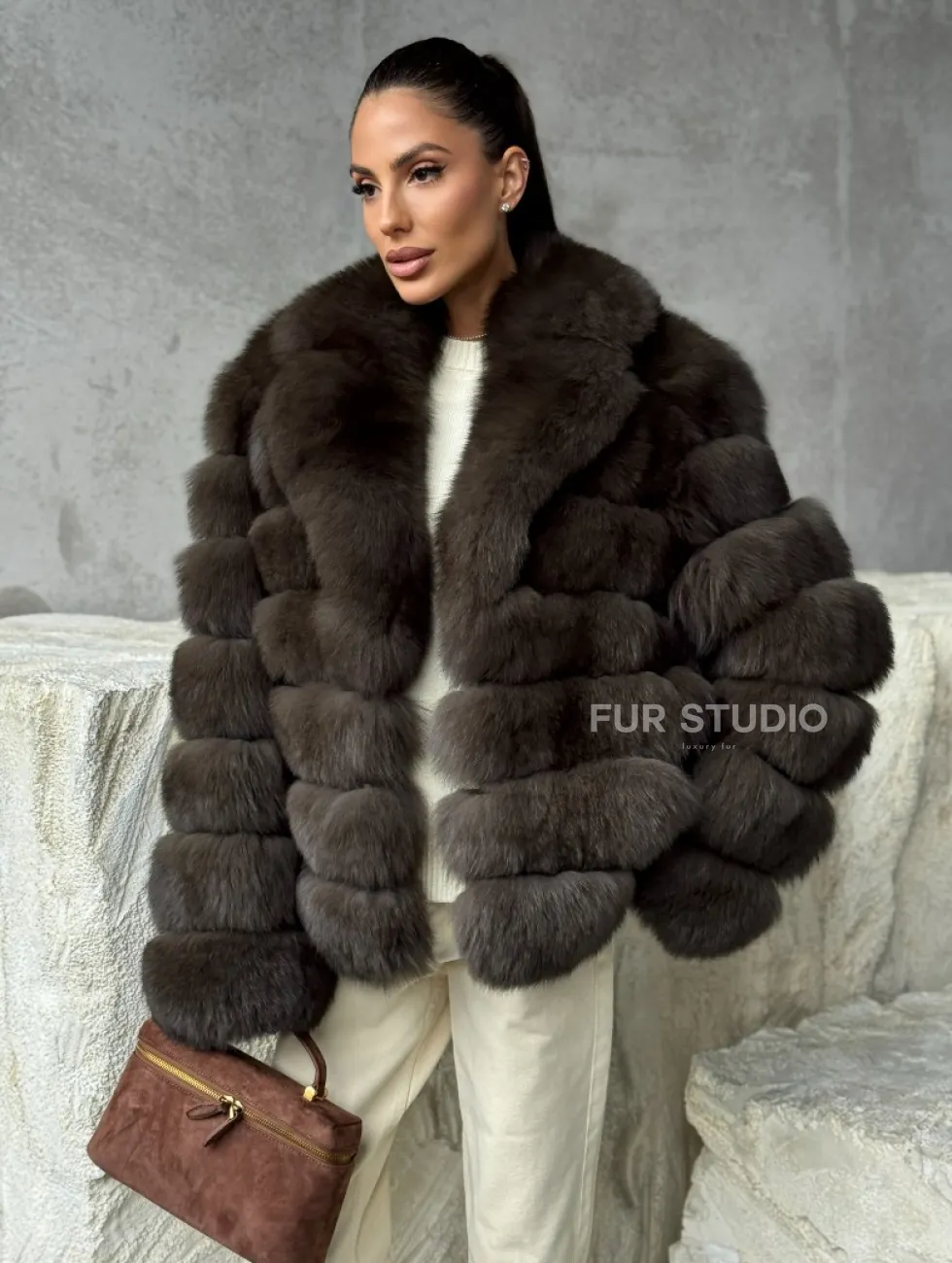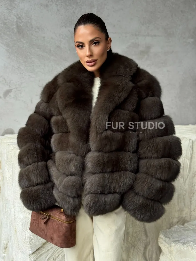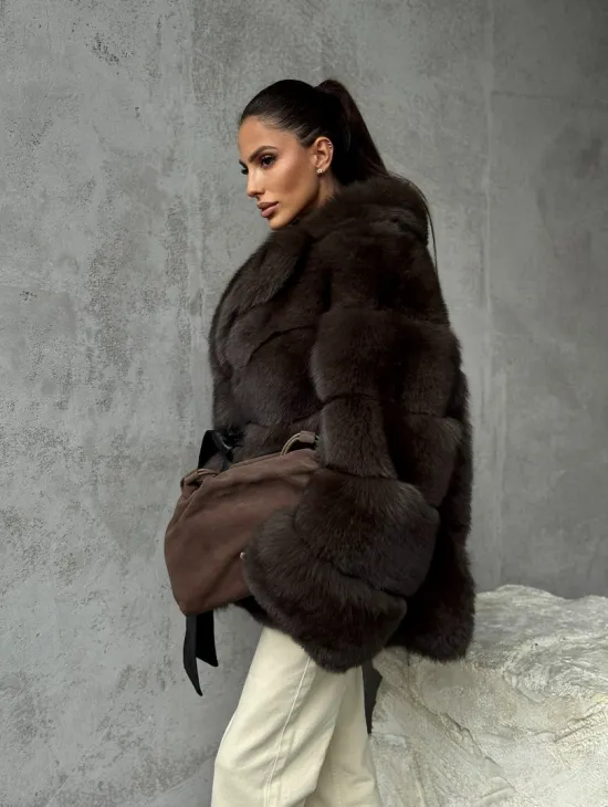Мех данной шубы финский песец, цвет коричневый. Предлагается в размерах от 42 до 48. Длина модели 55-60 см, что выгодно подчеркивает фигуру девушек. Эта модель идеально подойдет для девушек и женщин, предпочитающих роскошные натуральные меха.