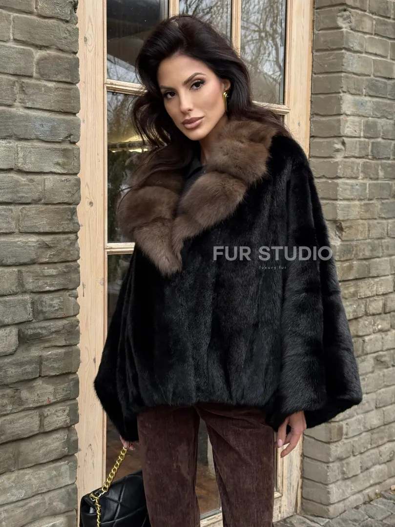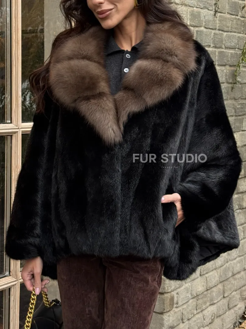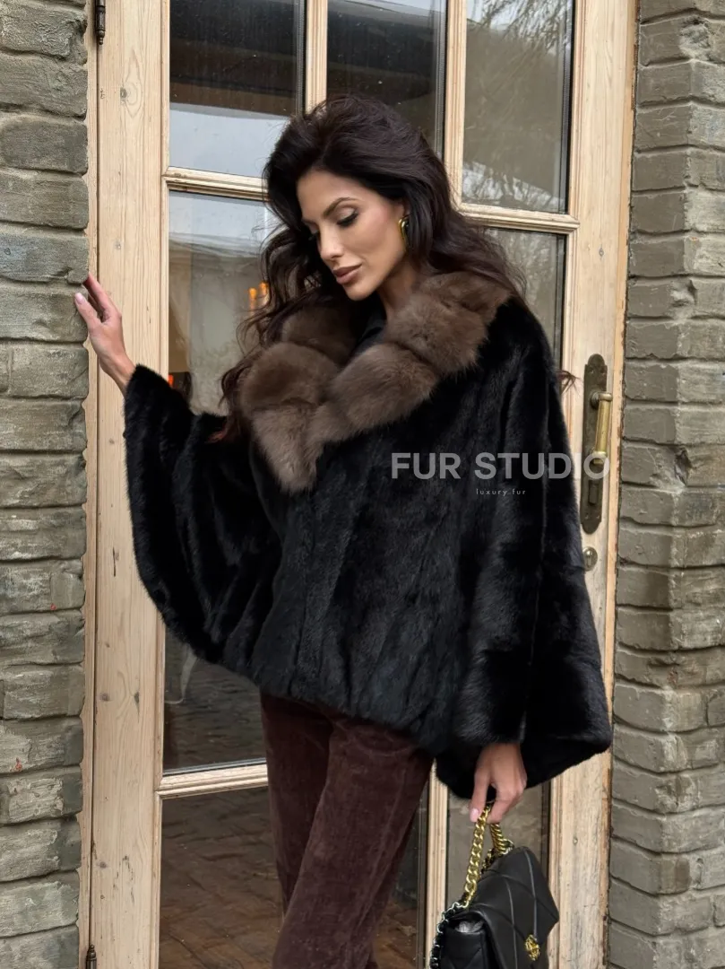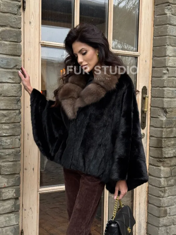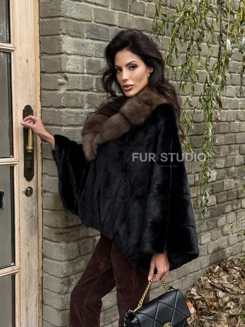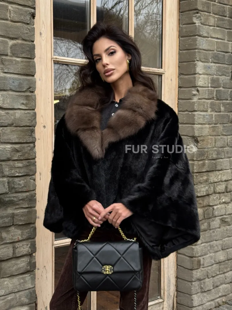 Шуба - пончо из аукционной норки Black с воротником из куницы доступна для покупки в нашем шоуруме Furs Studio в Москве. У нас так же есть доставка во все города России. Добавьте немного роскоши в свой гардероб с этой шубой, которая будет служить вам многие годы.