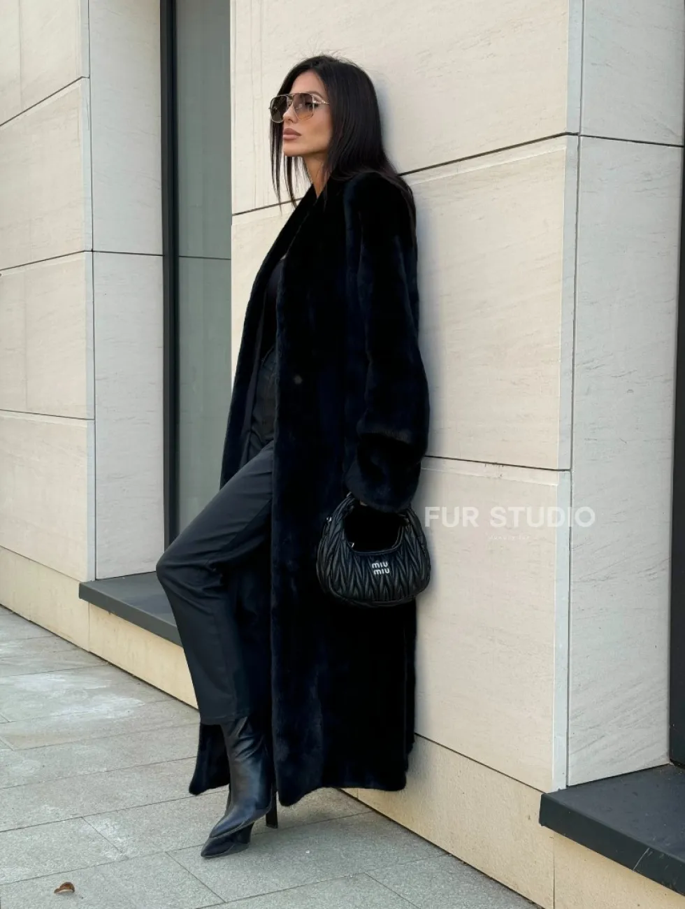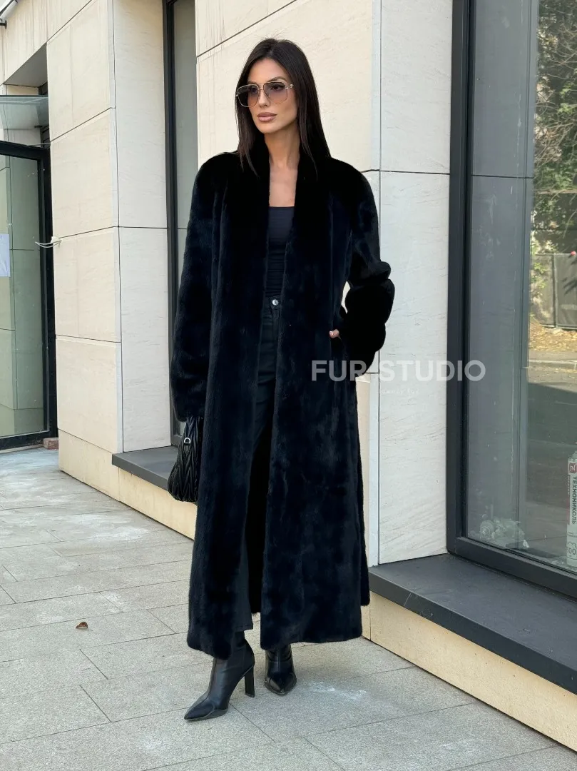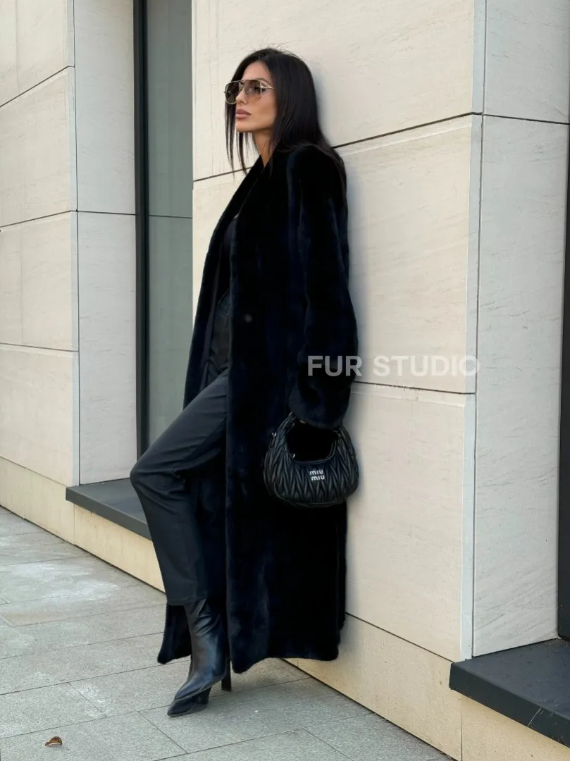 Мех данной шубы аукционная норка, цвет черный. Предлагается в размерах от 42 до 52. Длина модели 125-130 см, что выгодно подчеркивает фигуру девушек. Эта модель идеально подойдет для девушек и женщин, предпочитающих роскошные натуральные меха.