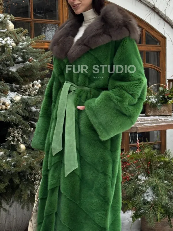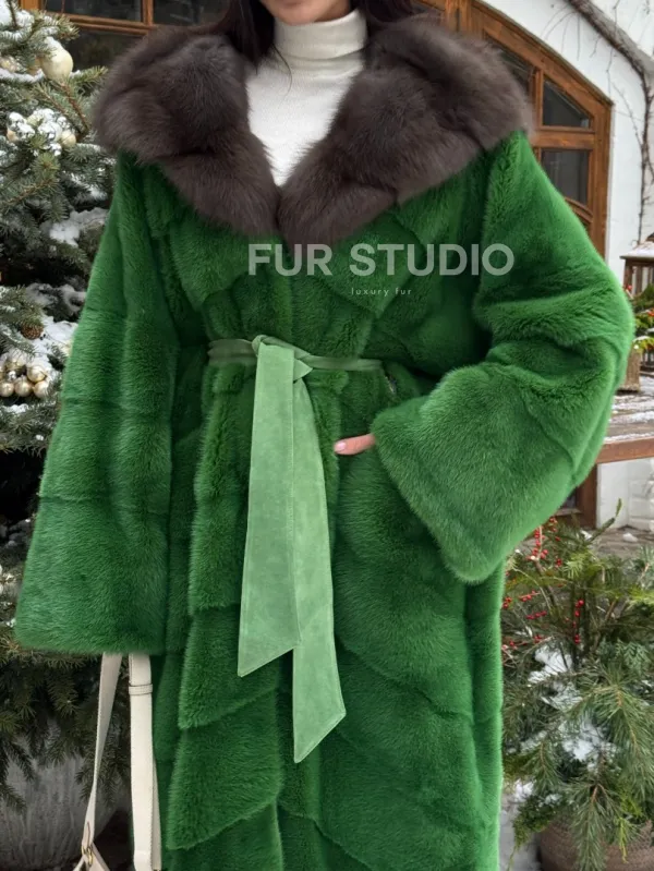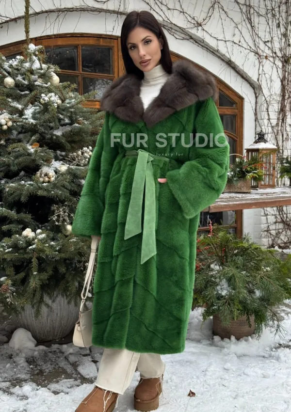 Мех данной шубы аукционная норка, цвет зеленый. Предлагается в размерах от 42 до 48. Длина модели 115-120 см, что выгодно подчеркивает фигуру девушек. Эта модель идеально подойдет для девушек и женщин, предпочитающих роскошные натуральные меха.