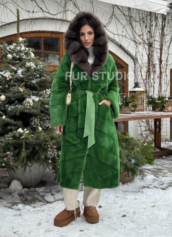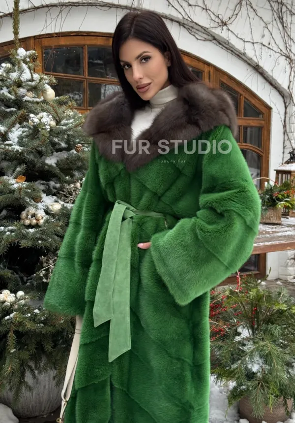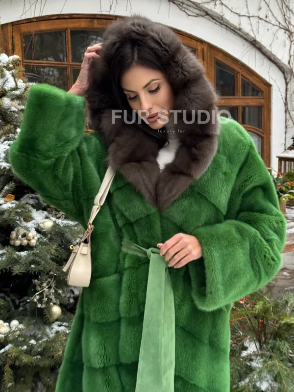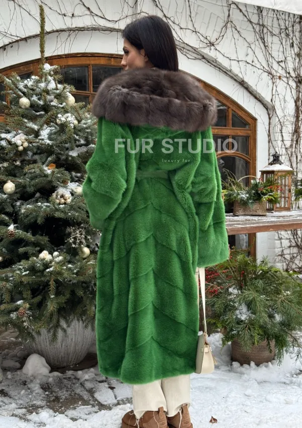 Шуба зеленого цвета с капюшоном из меха куницы доступна для покупки в нашем шоуруме Furs Studio в Москве. У нас так же есть доставка во все города России. Добавьте немного роскоши в свой гардероб с этой шубой, которая будет служить вам многие годы.