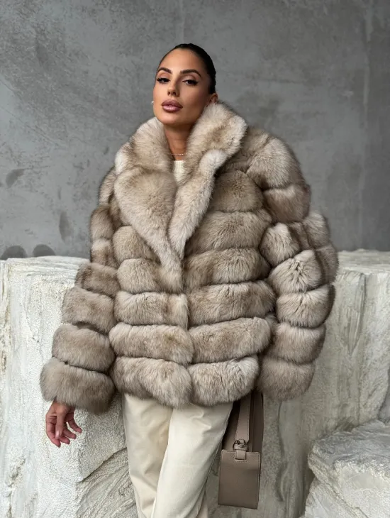 Мех данной шубы лиса, цвет бежевый. Предлагается в размерах от 42 до 48. Длина модели 60-65 см, что выгодно подчеркивает фигуру девушек. Эта модель идеально подойдет для девушек и женщин, предпочитающих роскошные натуральные меха.