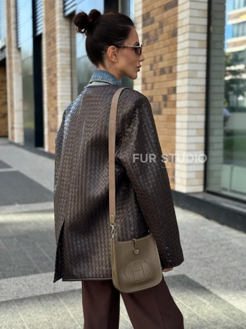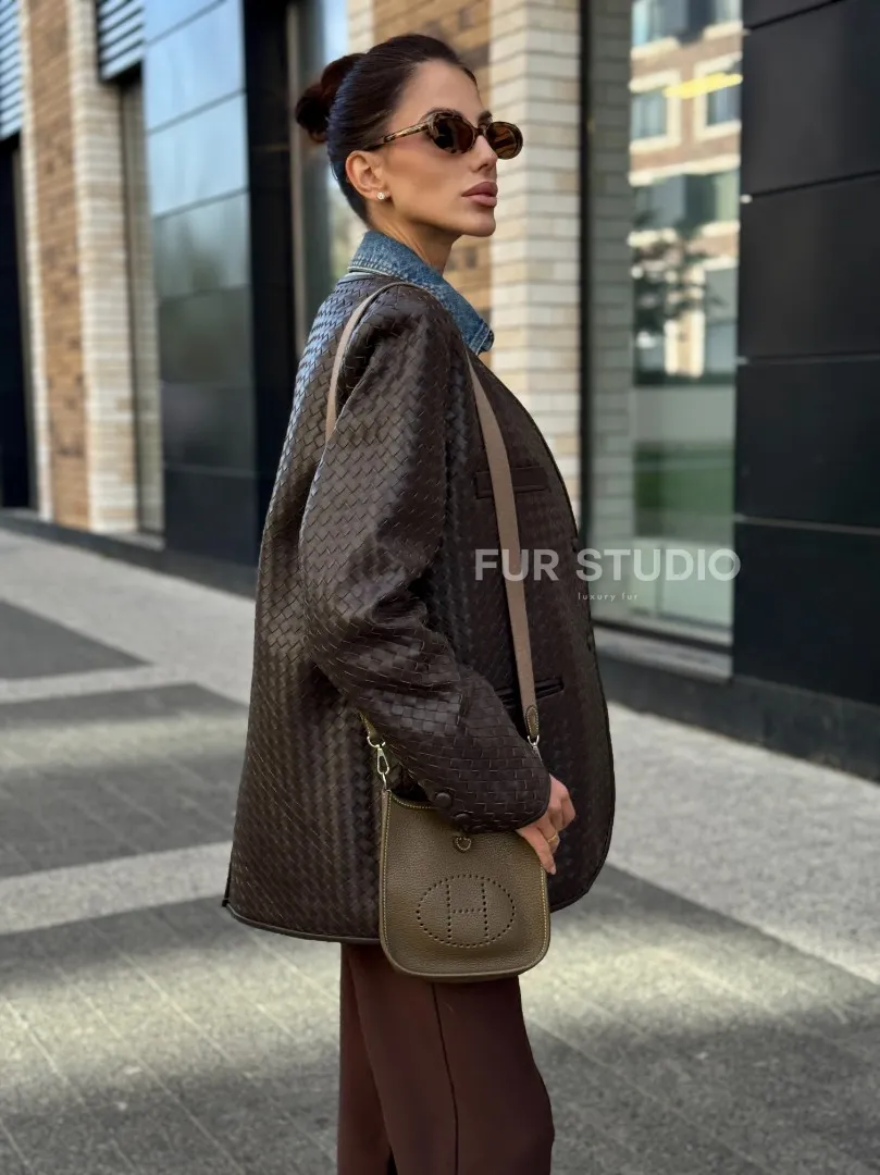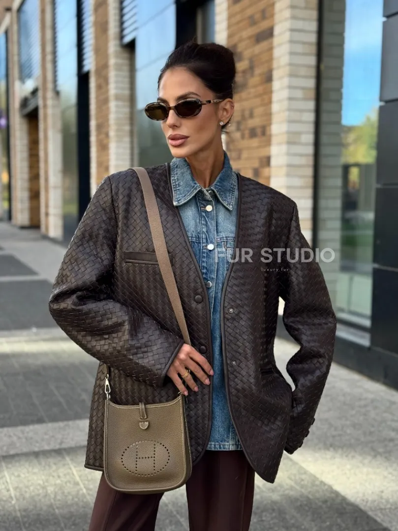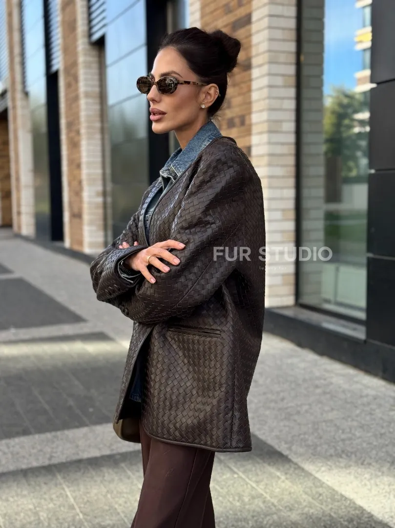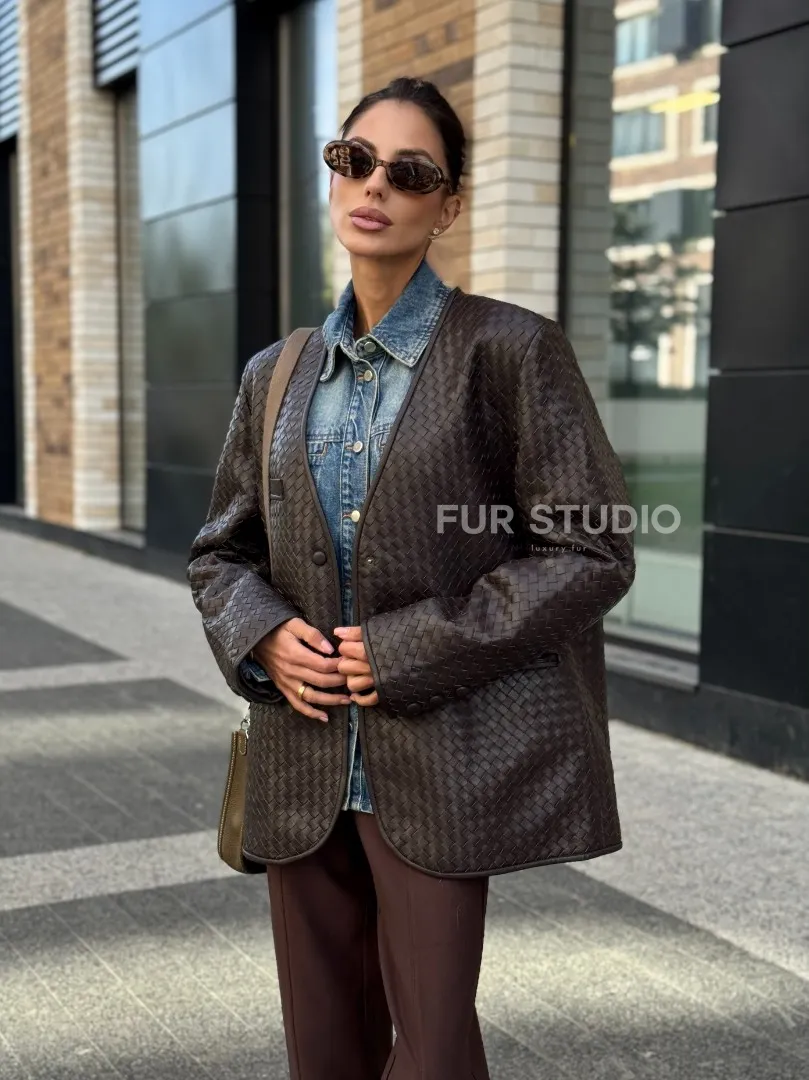 Стильный пиджак из натуральной плетеной кожи доступна для покупки в нашем шоуруме Furs Studio в Москве, где также предоставляется удобная доставка во все города России.