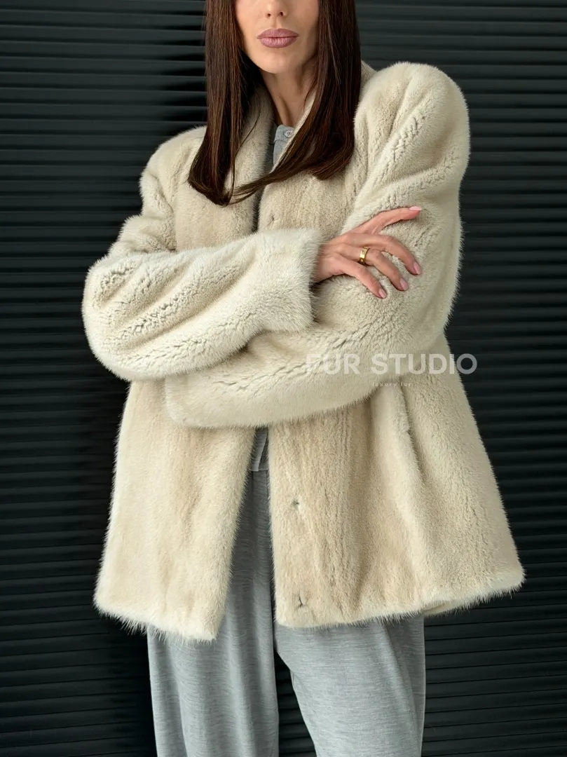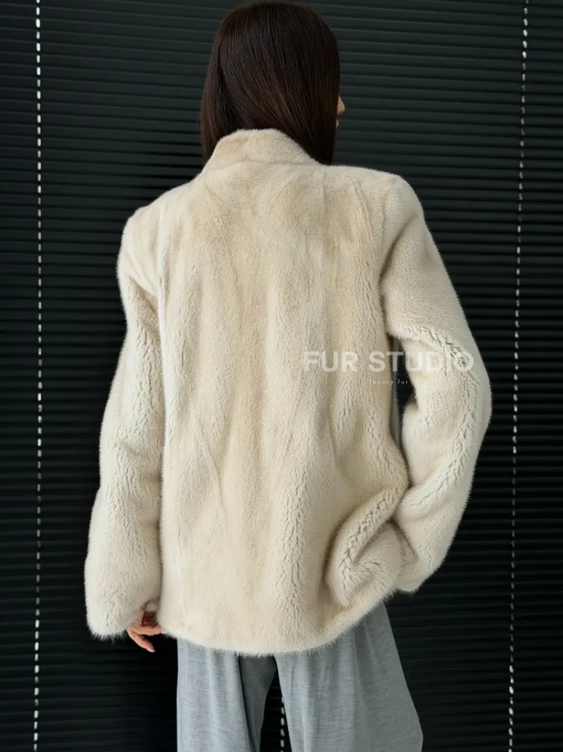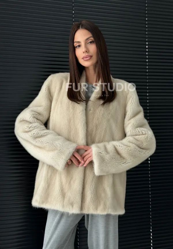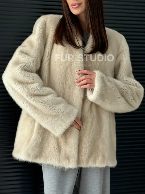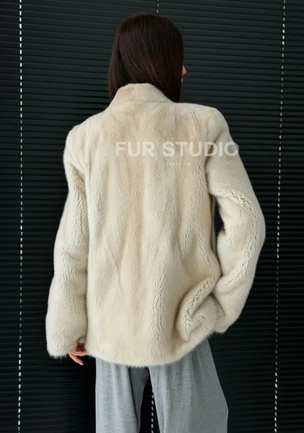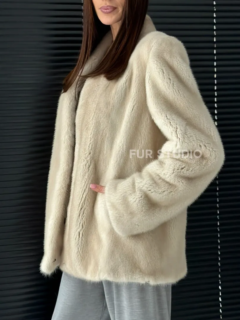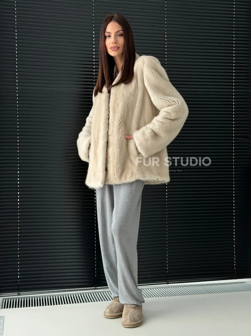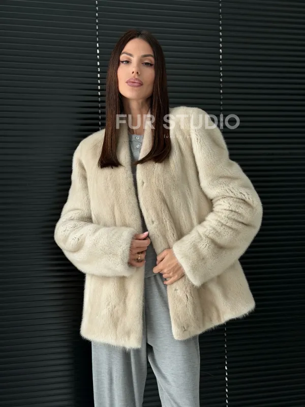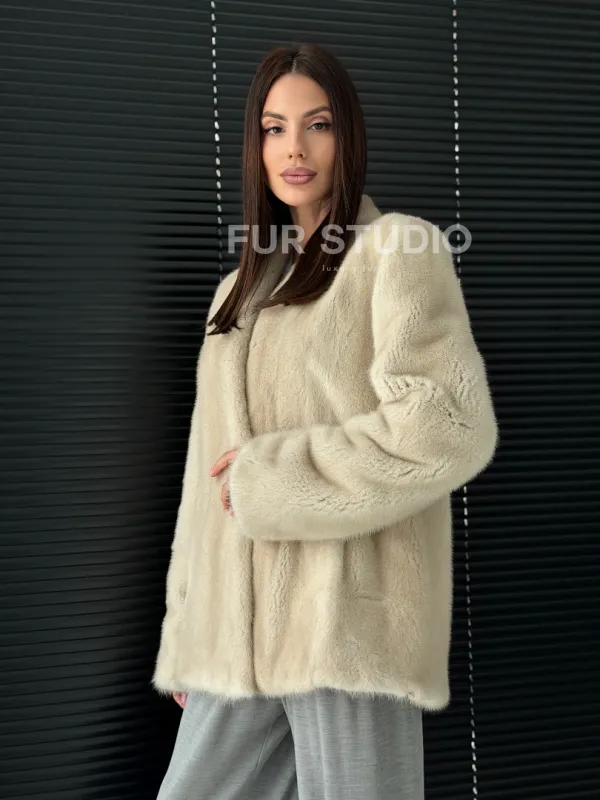 Светлый норковый жакет V-образный воротник доступна для покупки в нашем шоуруме Furs Studio в Москве. У нас так же есть доставка во все города России. Добавьте немного роскоши в свой гардероб с этой шубой, которая будет служить вам многие годы.