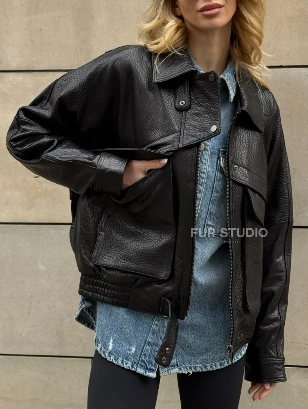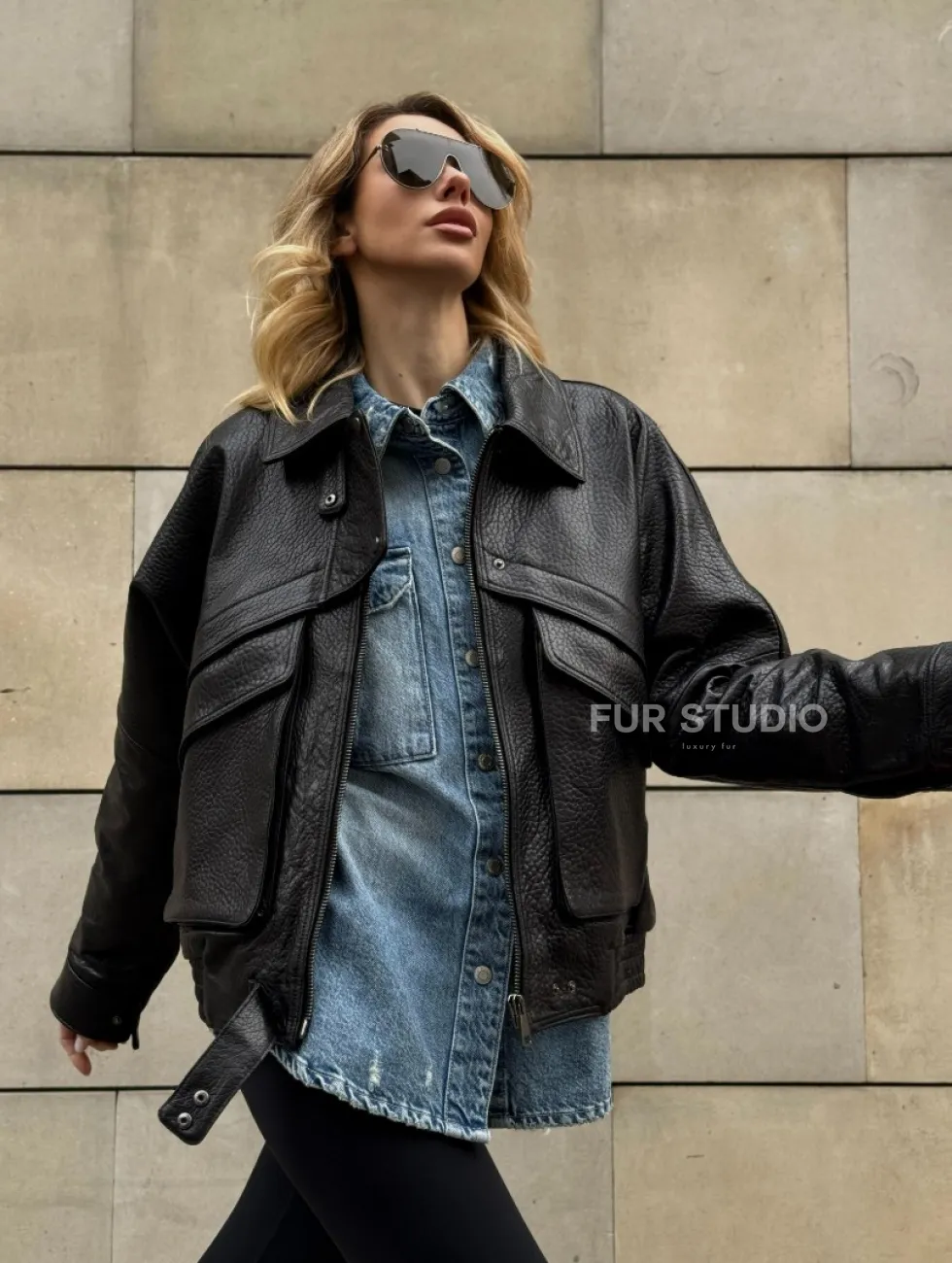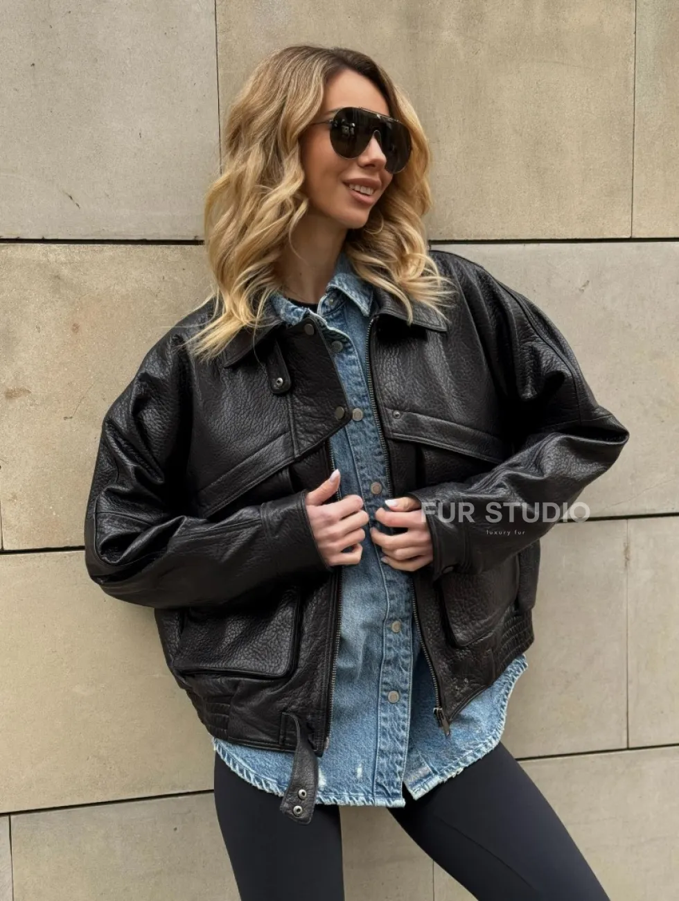 Трендовая куртка - бомбер oversize из натуральной кожи Joomba доступна для покупки в нашем шоуруме Furs Studio в Москве, где также предоставляется удобная доставка во все города России.