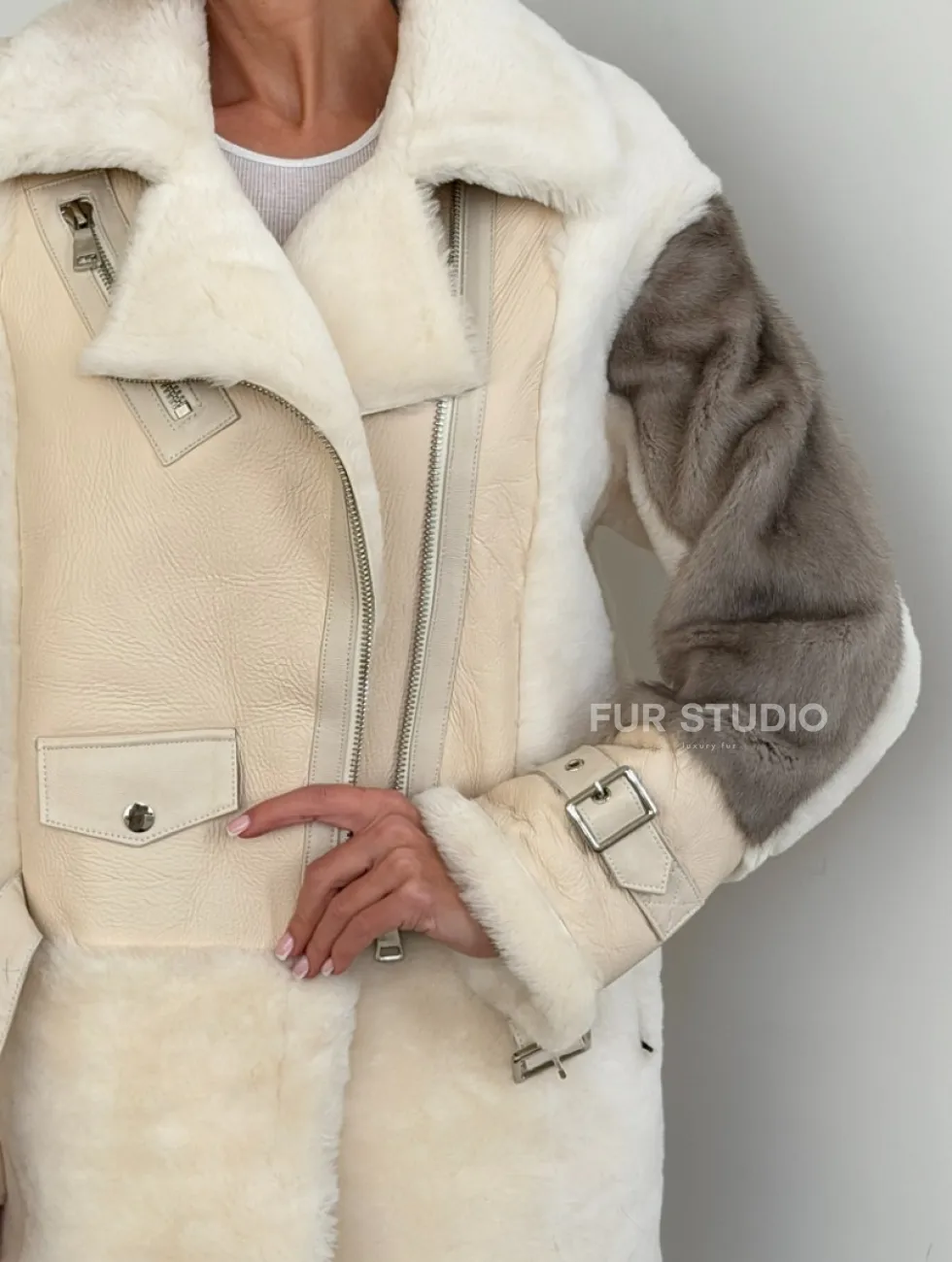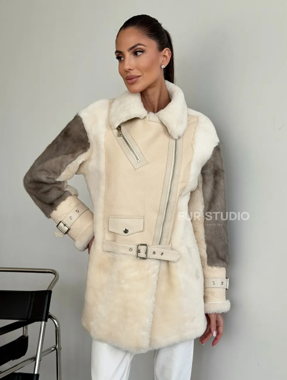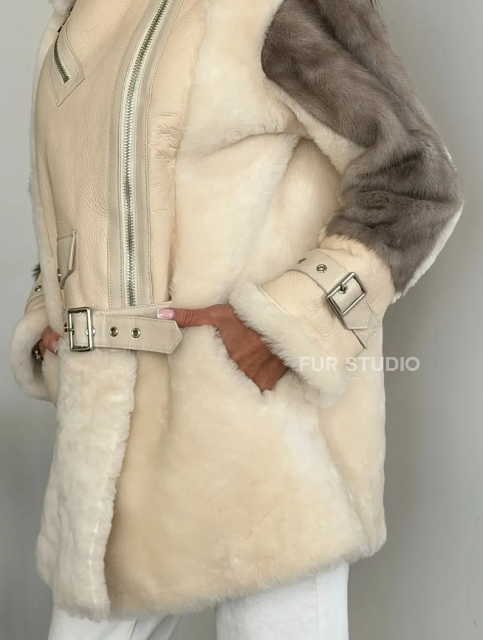 Удлиненная дубленка из натуральной овчины с рукавами из меха норки – молочный доступна для покупки в нашем шоуруме Furs Studio в Москве, а также предлагается удобная доставка во все города России. Обогатите свой гардероб этой дубленкой, которая прослужит вам многие годы, добавив немного роскоши в ваш повседневный образ.